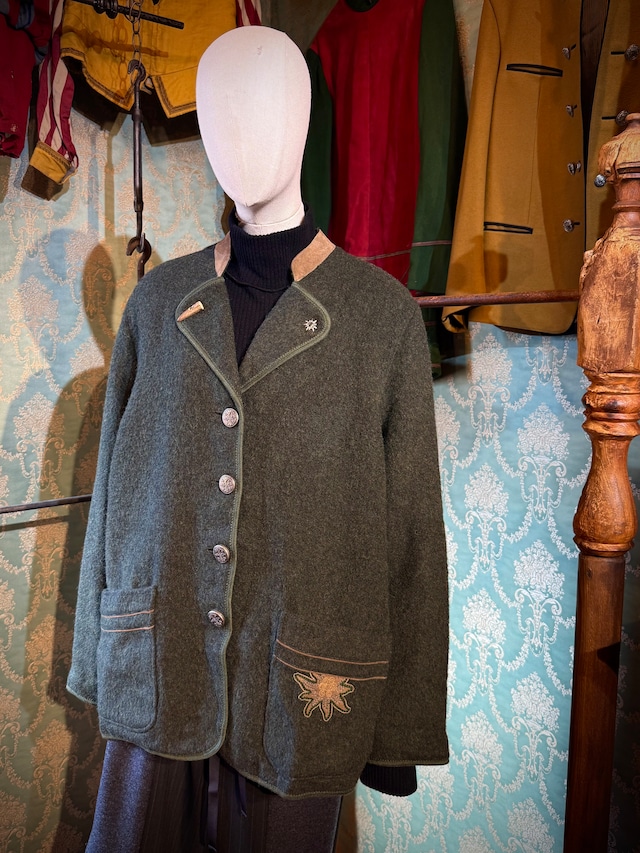 「AUSTRIA 70〜80's vintage」 Edelweiß embroidery Tyrolean design jacket オーストリア・チロルより圧縮ウールブルゾンをご紹介します。 「チロル」とは、オーストリアからイタリアにまたがる山岳地帯の地方で、そこの伝統的な民族衣装は「チロリアン」と呼ばれます。 水牛ボタンやメタルボタン、緑のパイピング、ポケットにあしらわれたアルプスの象徴・エーデルワイスの刺繍など、細部までこだわったカントリーテイストが印象的です。 自然を大切にしてきたチロル地方ならではの、多彩なディテールが詰め込まれた一着。 目の詰まった、ナイロン混合縮絨ウールは、暖かく滑らかで、帯びながら高い保温性を備えています。 深みのあるグリーンを基調としたカラーリングで、カジュアルにもきれいめにも合わせやすく、男女問わず着用いただけます。 フォークロアの雰囲気を漂わせながらも、現代のスタイルに自然に馴染むチロリアンジャケット。ユニセックスで楽しめる、唯一無二のアイテムです。 【MATERIAL】 wool 80% nylon 20% 【 SIZE 】 肩幅 48cm 身幅 60cm 袖丈 61cm 着丈 70cm ※ 採寸は念入りに行っておりますが、平置きによる採寸の為、数字に若干のずれが生じることもございます。 【CONDITION】 ※USED商品のため、細かなスレがある場合がございます。 ご了承の上、ご購入ください。 【取り扱いSHOP】 タナゴコロータス 大阪中崎町店 送料一律750円 注文より2~3日で配送 日時指定が出来ない場合もございます。 ノークレームノーリターン。 古着商品です。 返品交換は致しかねますのでご了承下さい。 ※店頭でも販売している商品の為、購入時に実売してしまっている場合が御座います。