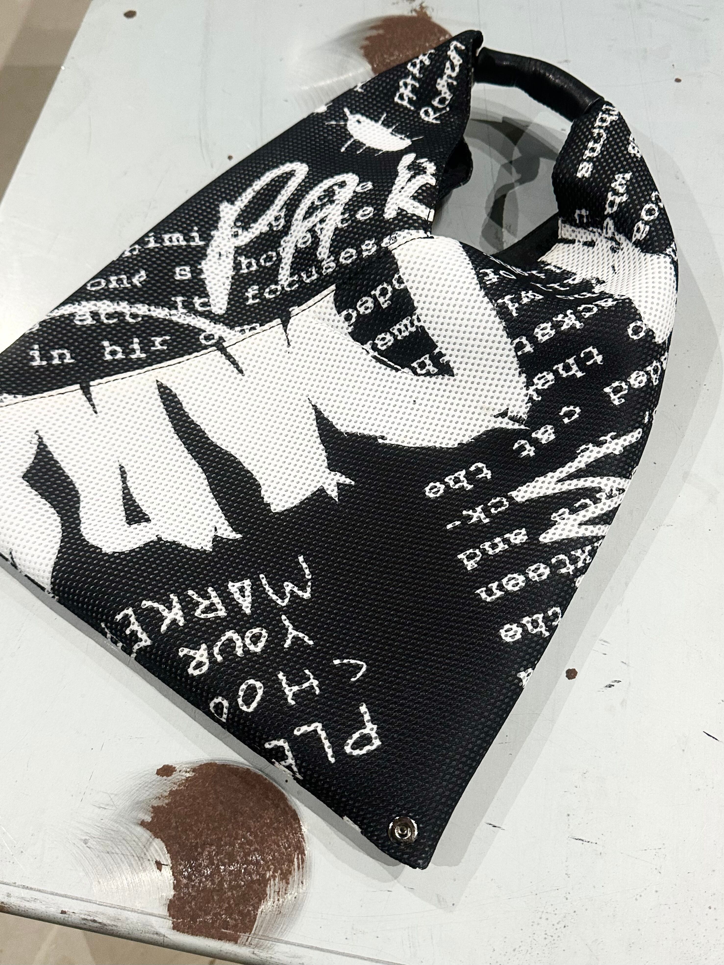 黒地にアートペイント風な文字の羅列が楽しいこちら。 折り紙から着想を得てデザインされた事で"ジャパニーズバッグ"の名前が付けられました。