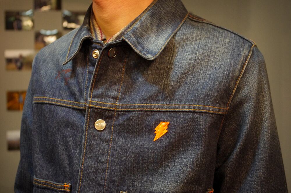 濃いめのインディゴデニムに、胸元には斬新で型破りなデザインを好むW&LTらしい反射シールでイナズママークがキラリ。刺繍も、同じくイナズマを意識しボタンにまで同じマークが入っています。