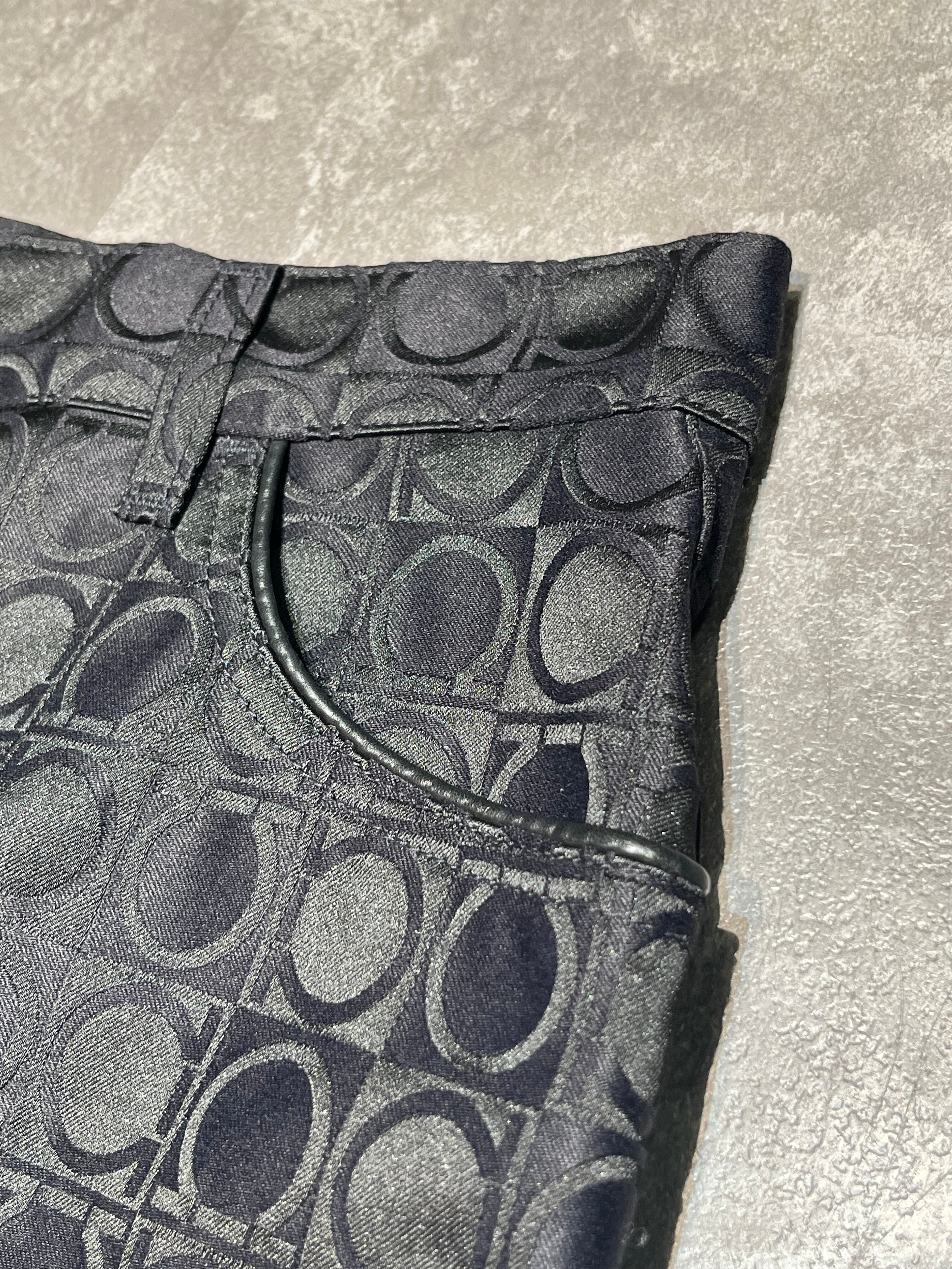 ウエストのロゴボタンやポケット淵にはパイピングが施され、細部まで高級感のあるディテールが目を惹きます。