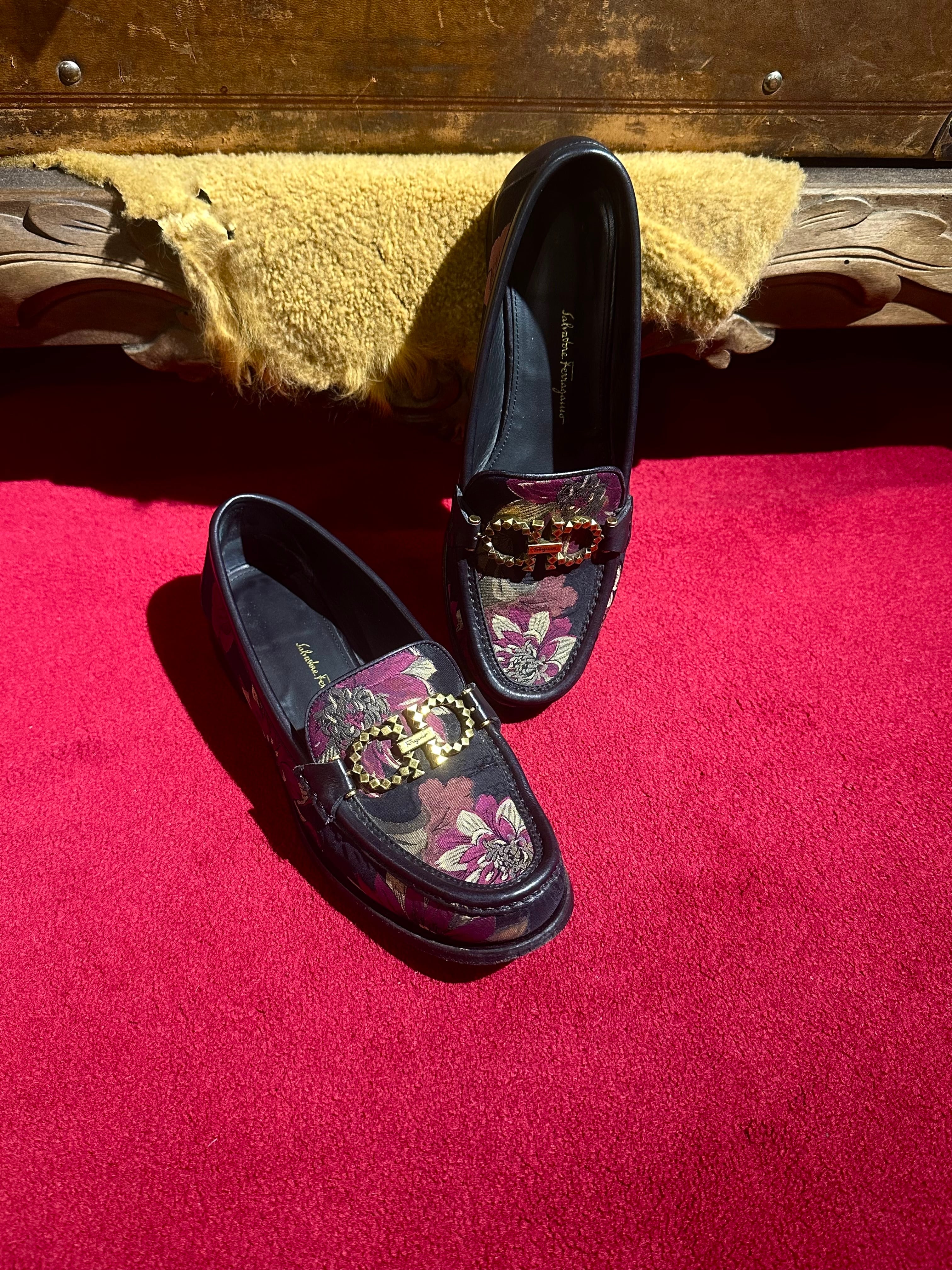 イタリアのラグジュアリーブランド、フェラガモより重厚感あるブラックをベースに、深みのあるワインレッドの花柄ジャカードが華やかなローファーをご紹介。