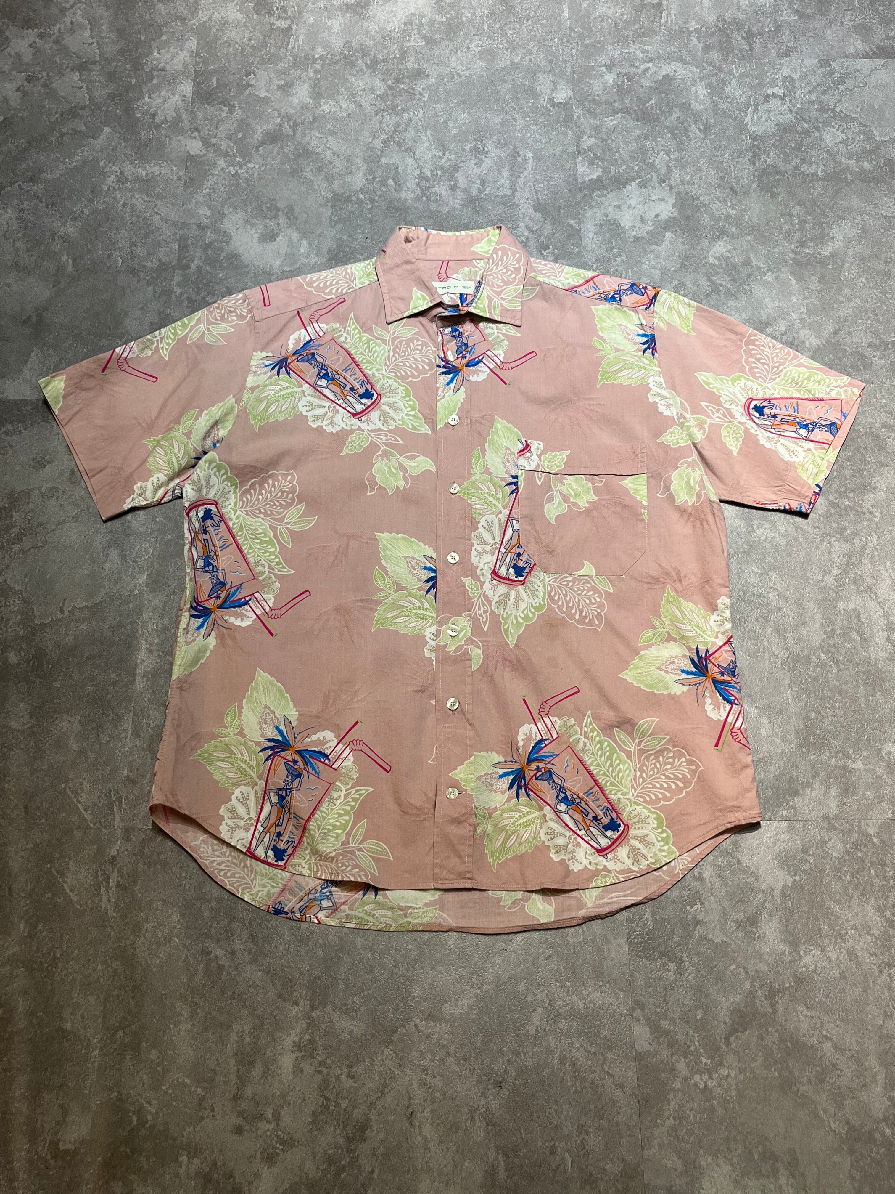 淡いピンクに夏らしいプリントが素敵なシャツ。南国感漂う、ドリンクと海と女性のデザインが素敵です。
