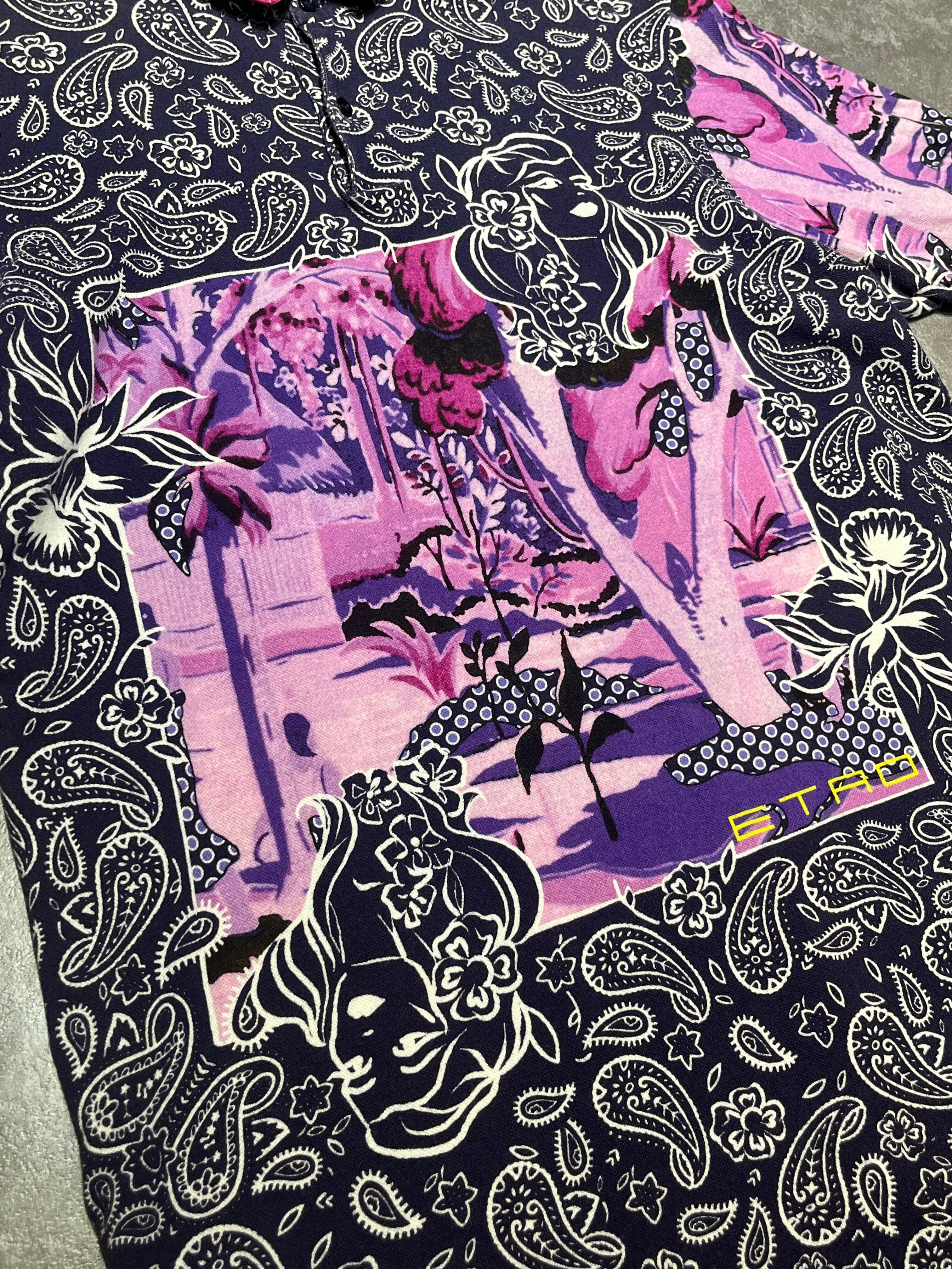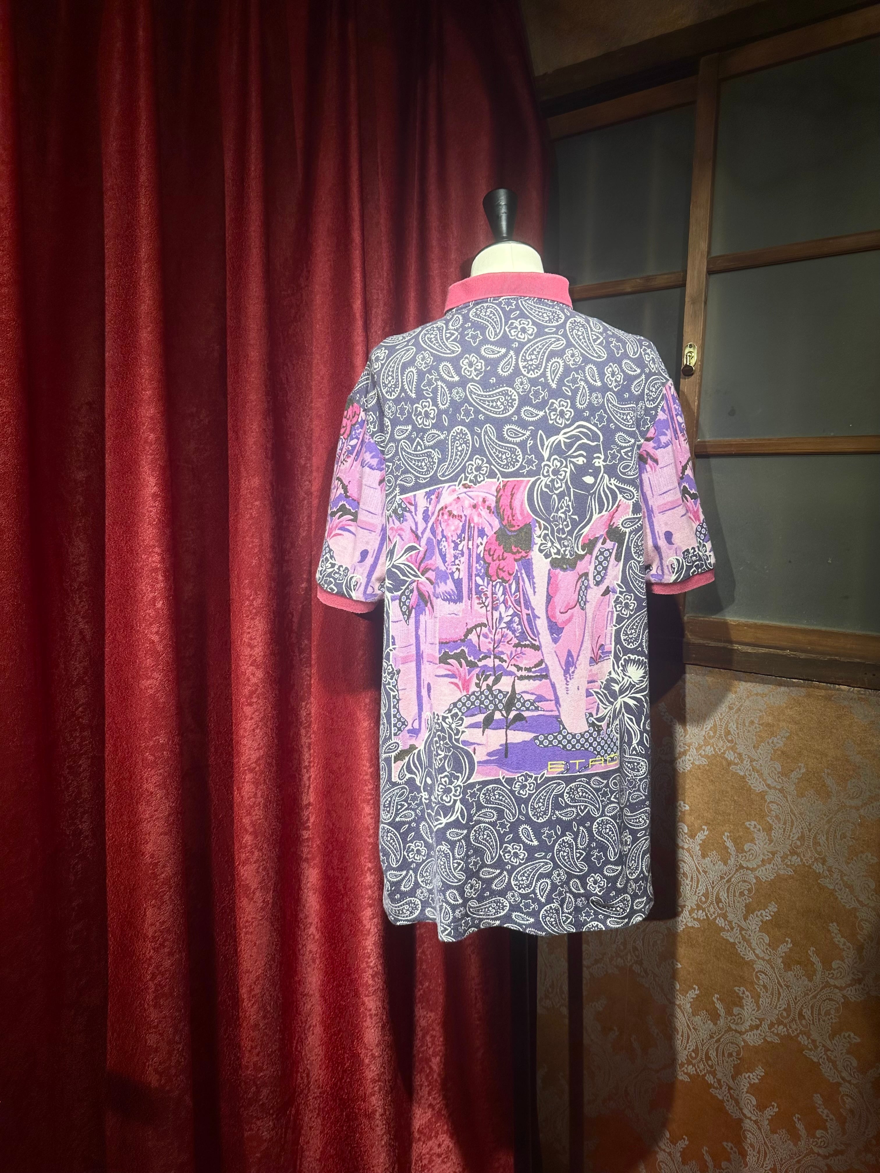エトロならではの大胆な色使いとアート性を凝縮した、存在感抜群のポロシャツです。ベースにはペイズリー柄を、フロントにはピンクを基調とした幻想的な絵画風の景色が目を引くように配置されています。