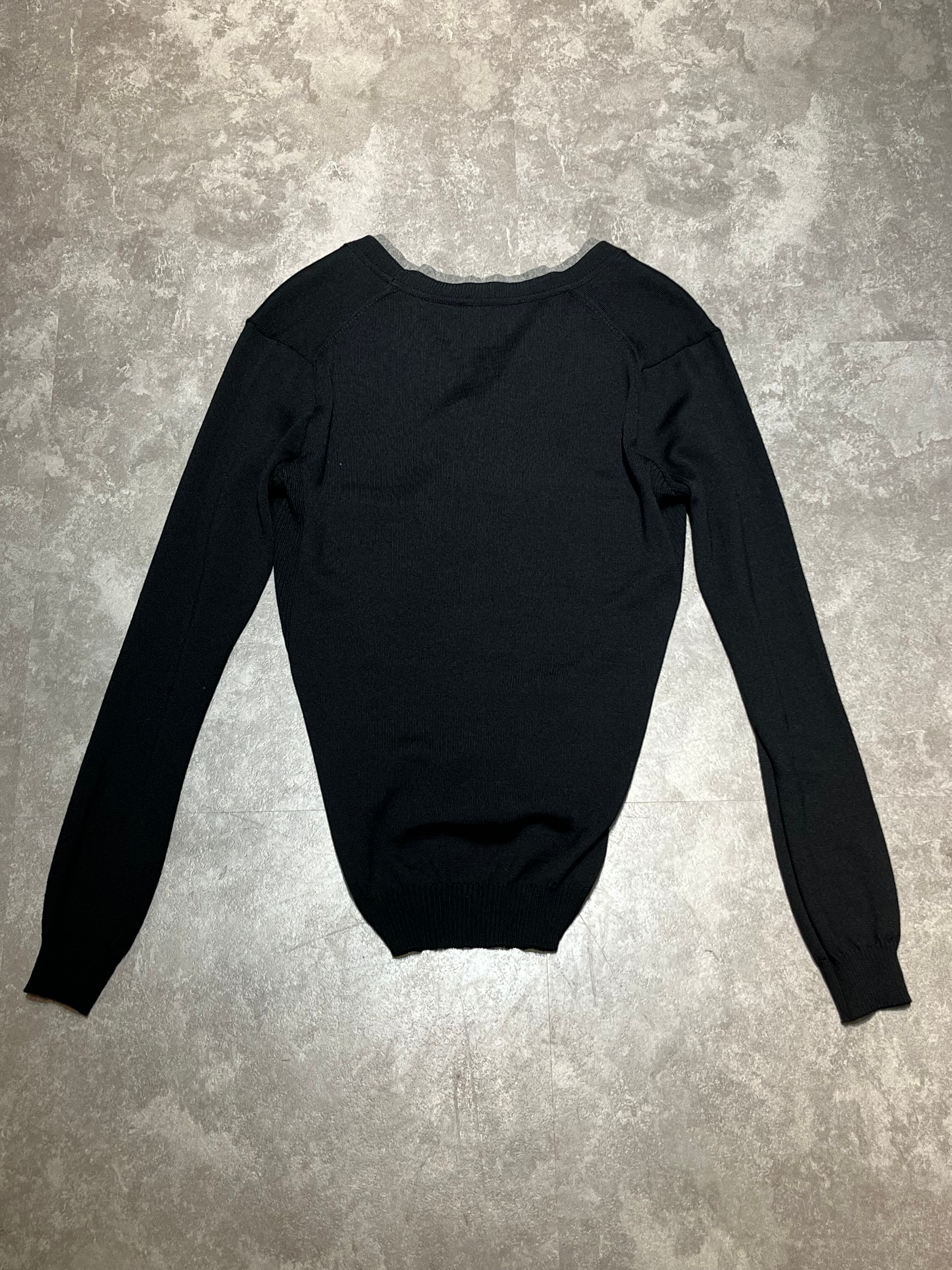 胸元にはブランドロゴのエンブレムがさりげなくデザインされ、アイコニックなアクセントをプラス。グレーのトリムラインがクラシックなカーディガンにモダンな印象を与えています。