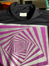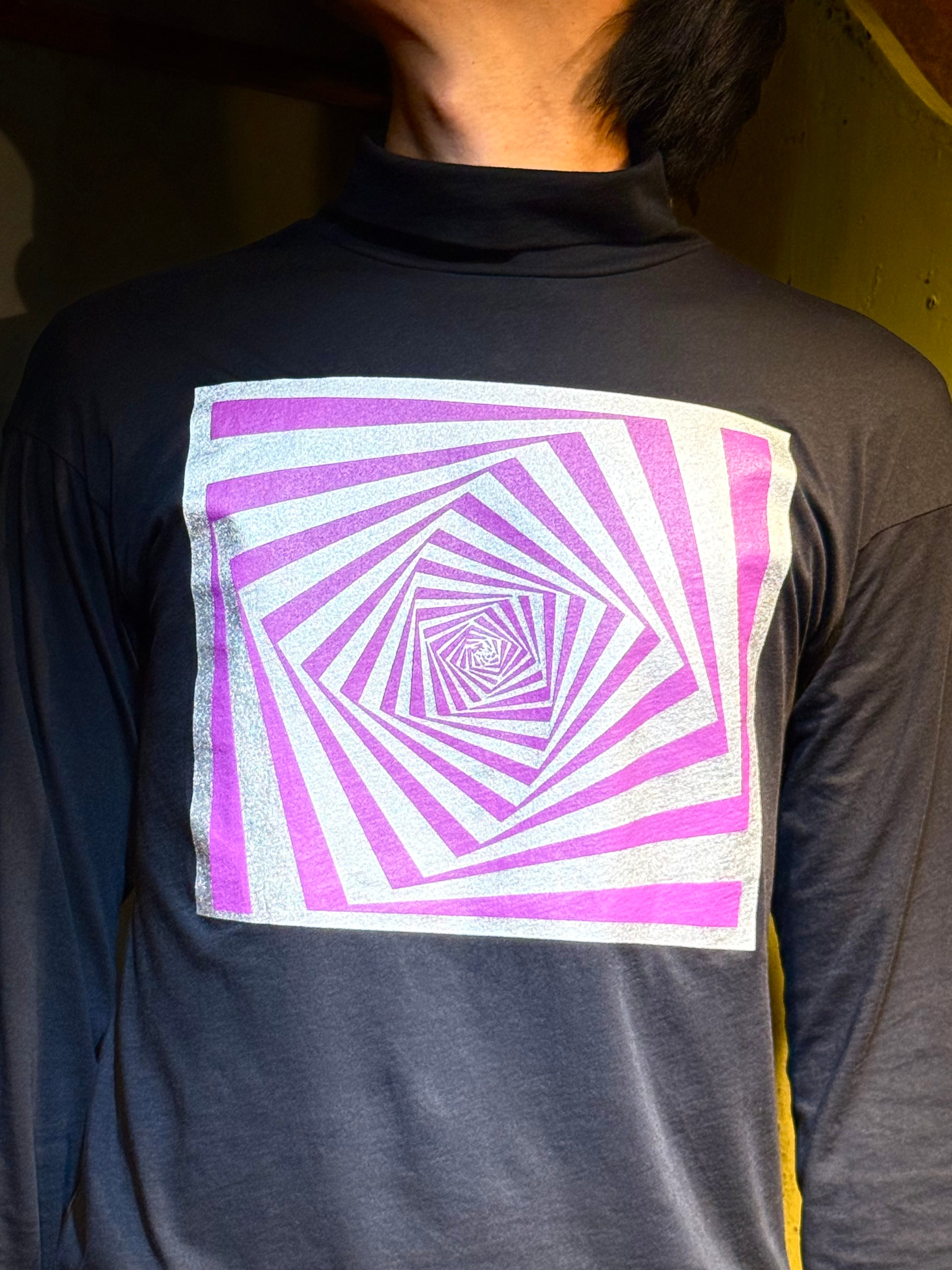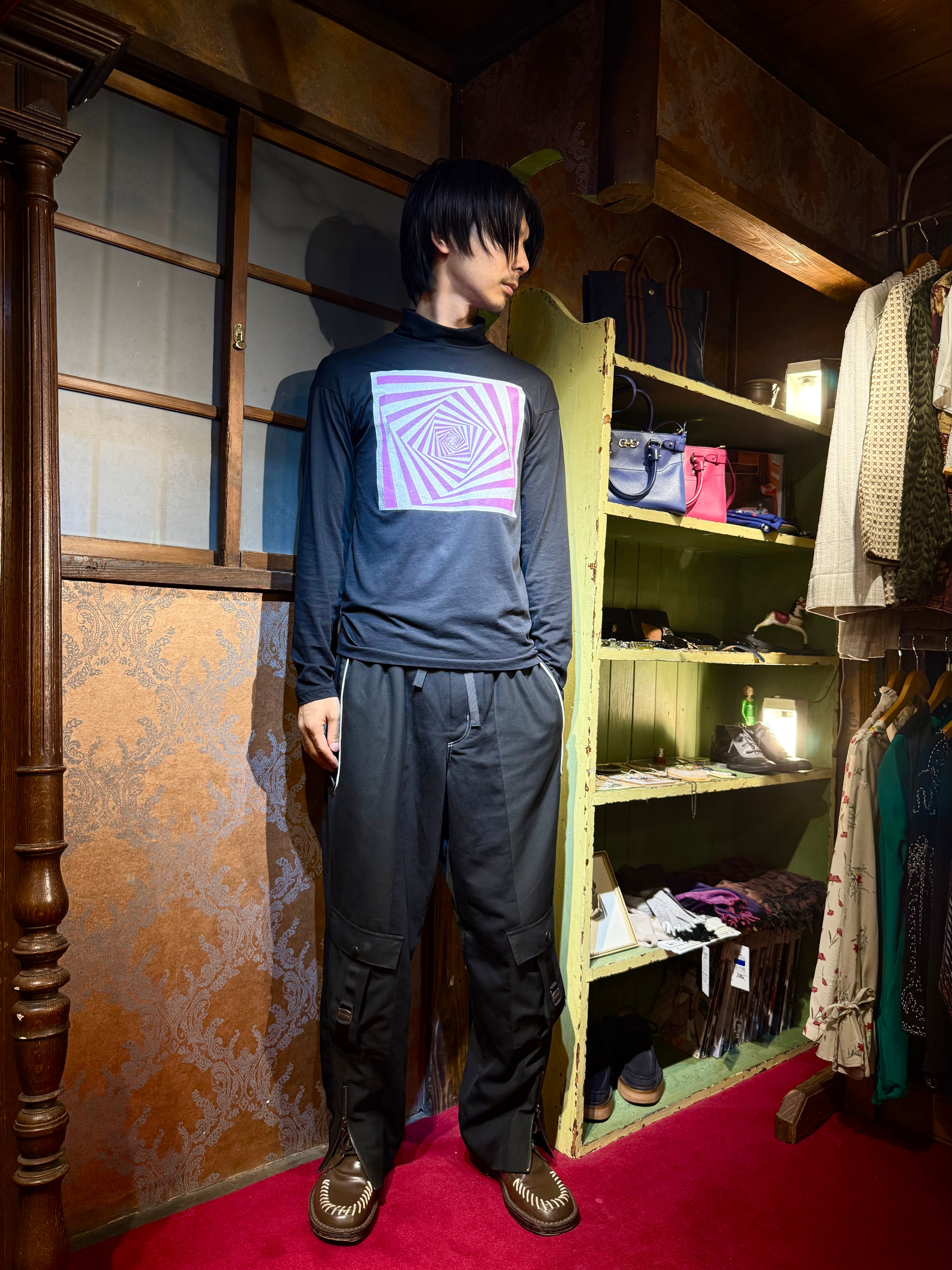 フロントには、視覚的なインパクトを放つ幾何学的なプリントが施されており、モダンでアート性の高いデザインに仕上がっています。