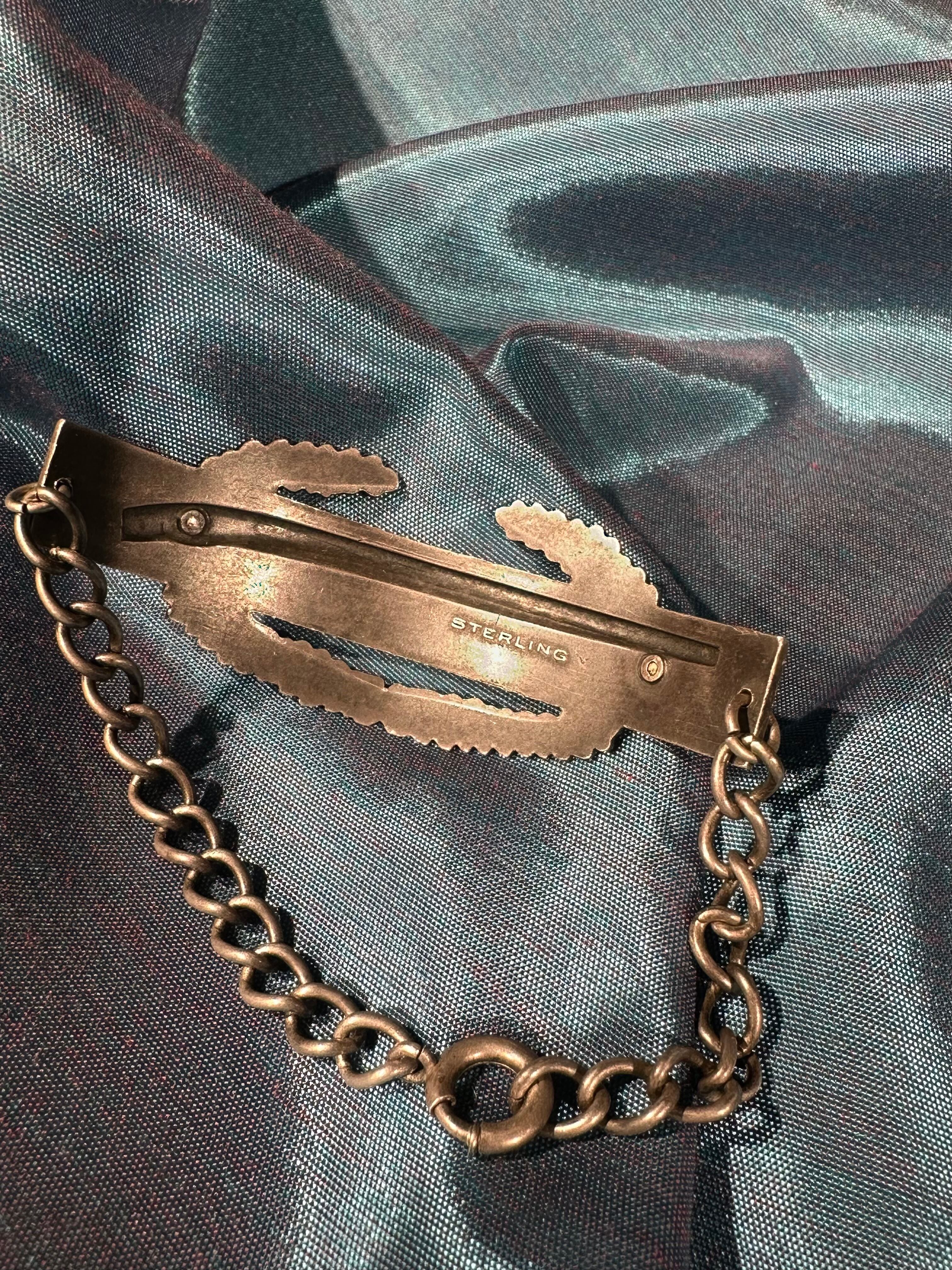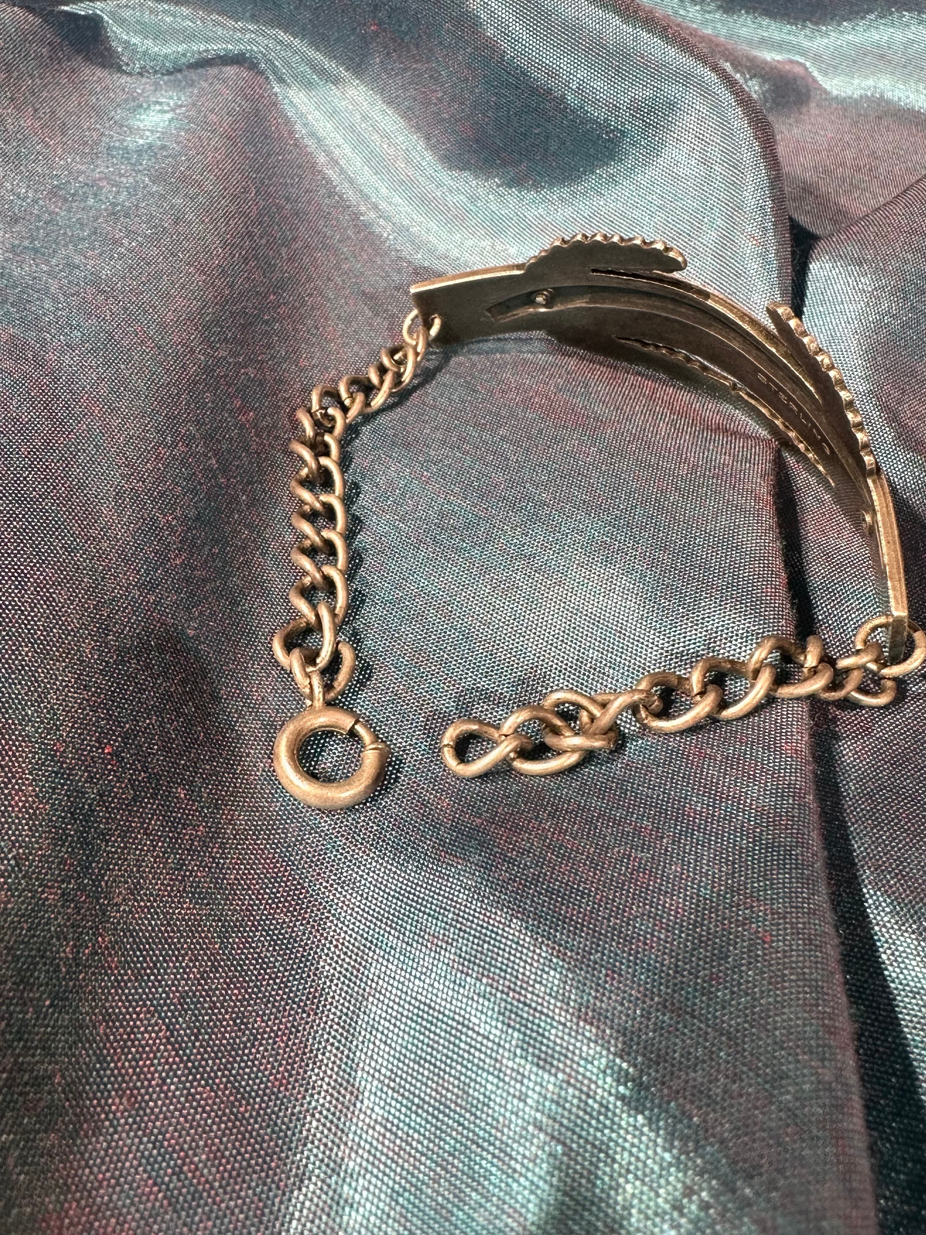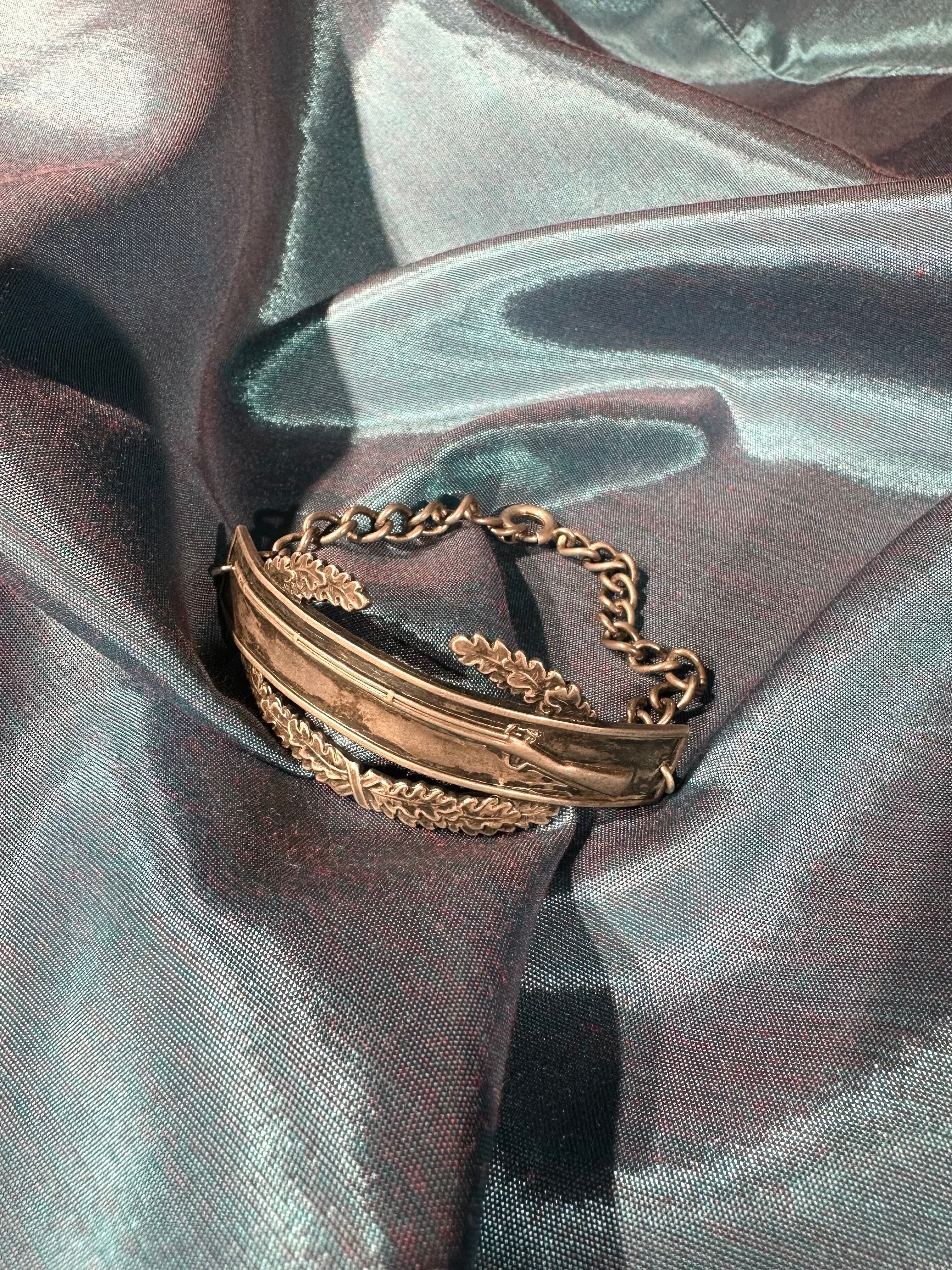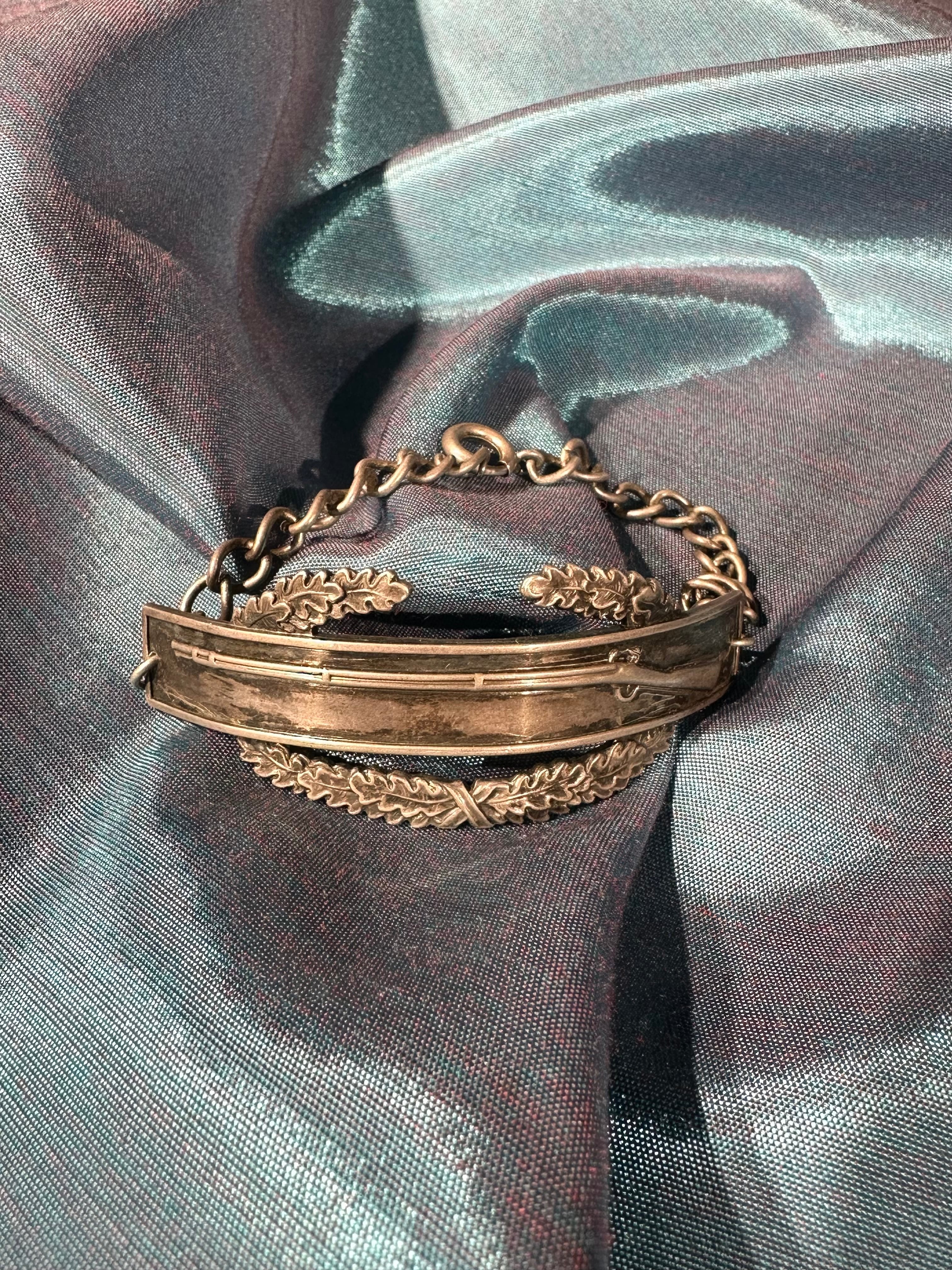 こちらは40年代のアメリカ陸軍の軍服のバッジとしてつけられていたものをIDブレスレットへとデザインされたものです。銃のモチーフからはミリタリー要素、質感などからはヴィンテージらしい趣を纏う逸品。