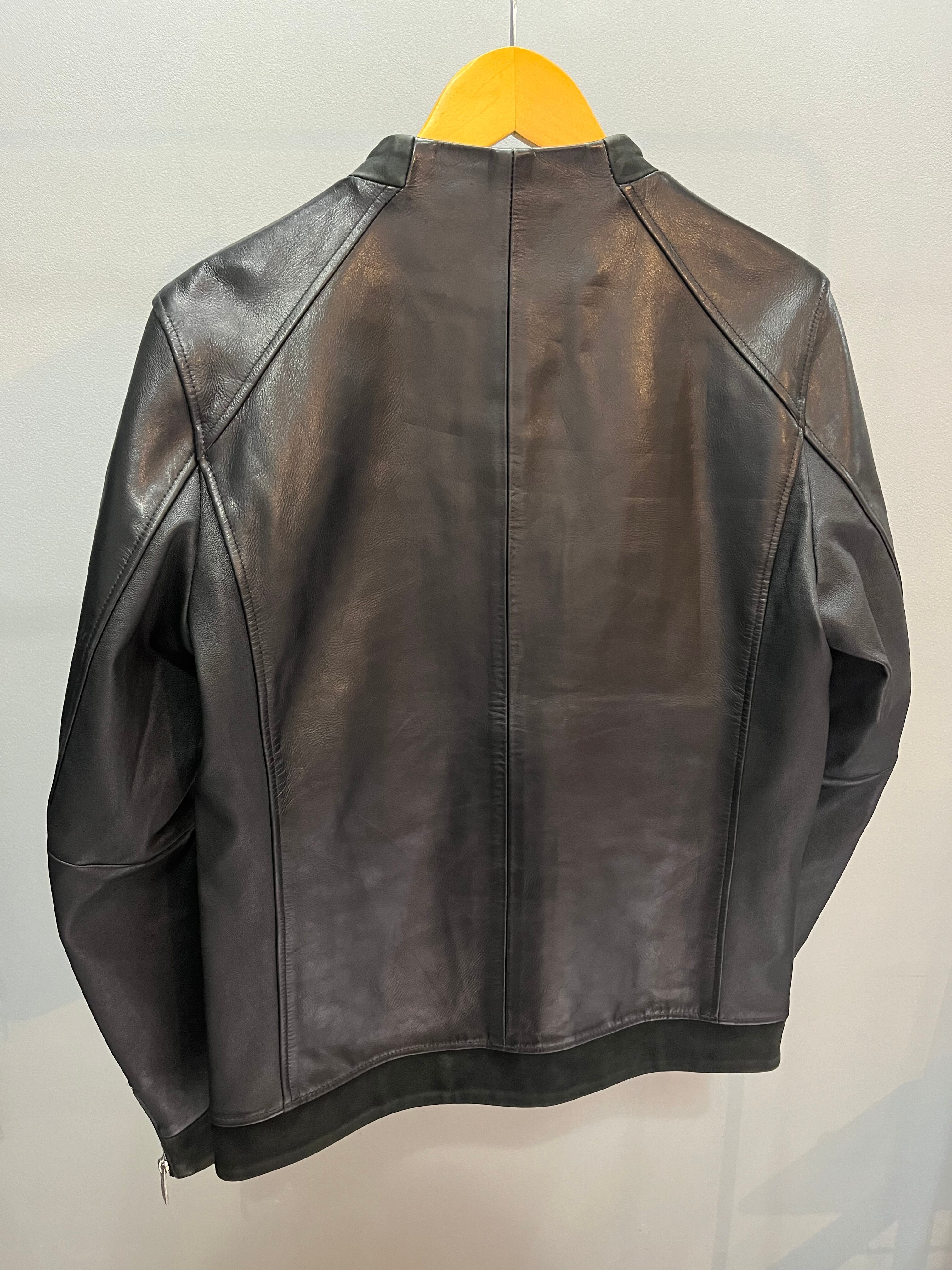 上質なレザーを贅沢に使用し、柔らかくしなやかな着心地。シンプルなノーカラーデザインとフロントジップのディテールが、無駄を削ぎ落としたモードな印象を引き立てます。