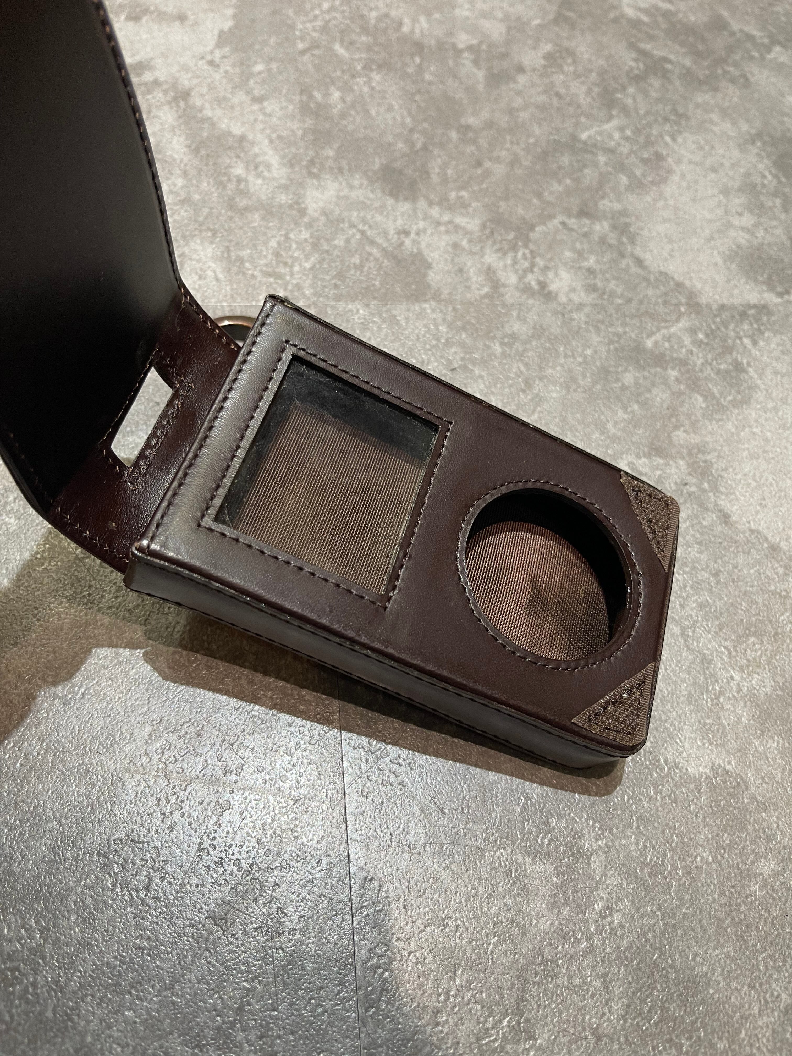 長方形の華奢なサイズ感で、ブラウンのレザーとサイバー柄、カラナビのカラーリングのゴルチエらしさそのモノ。