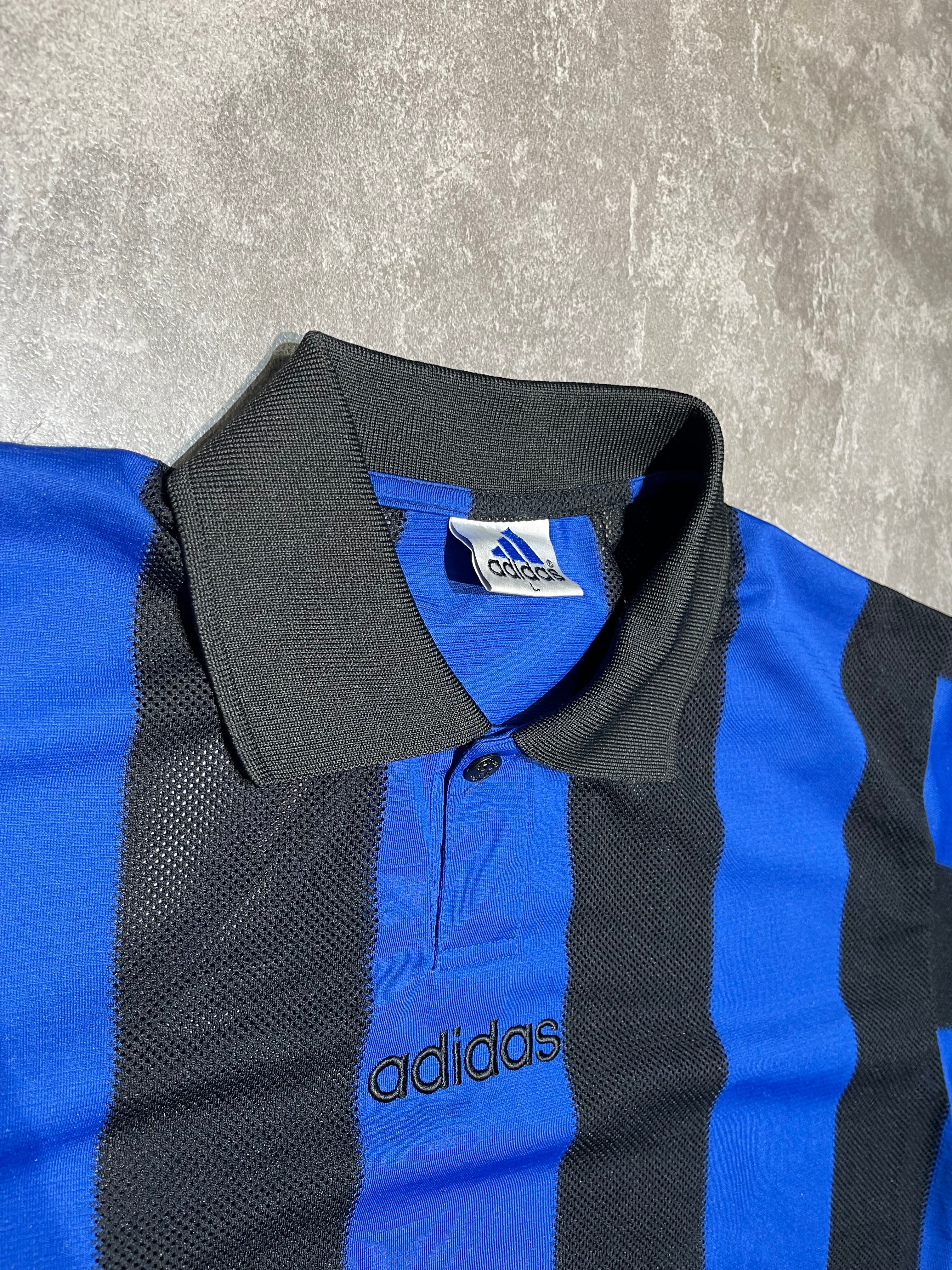 こちらはブルーにブラックの大きい縦縞、スポーティーなメッシュ素材のゲームシャツ。