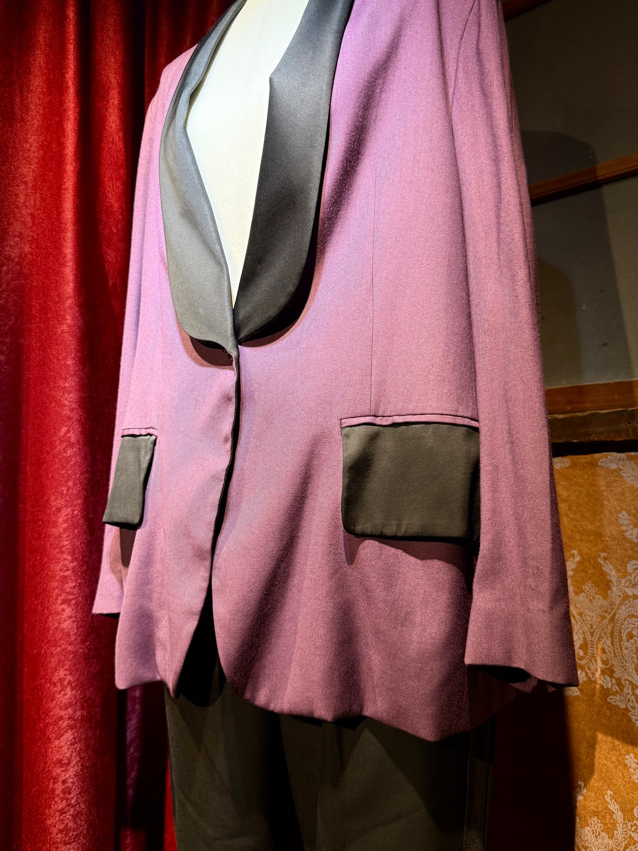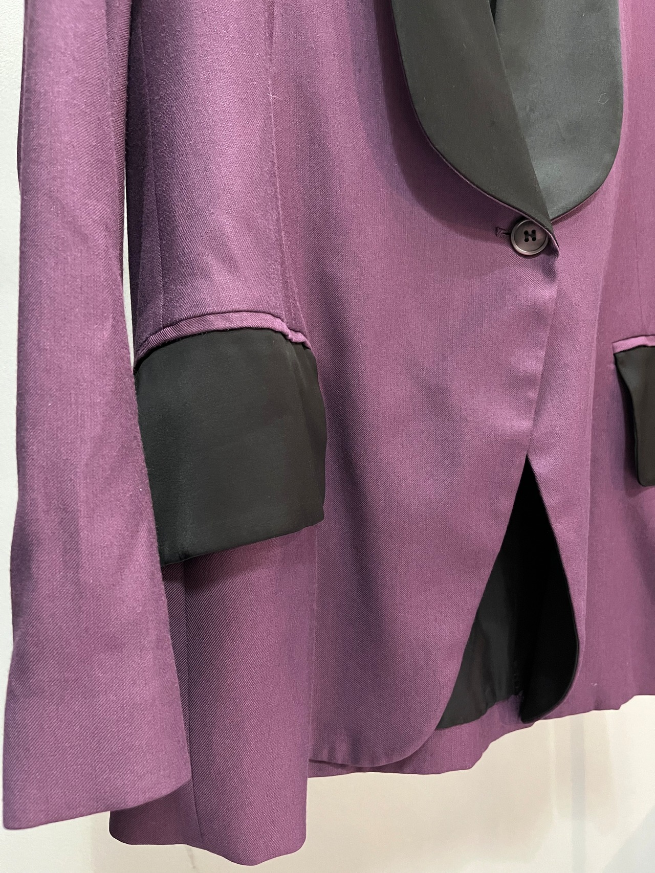 このジャケットは、ブラックとパープルのバイカラーにショールカラーが特徴です。しかし、ただのショールカラーではなく、MM⑥らしい丸みを帯びた一風変わったデザインが施されています。
