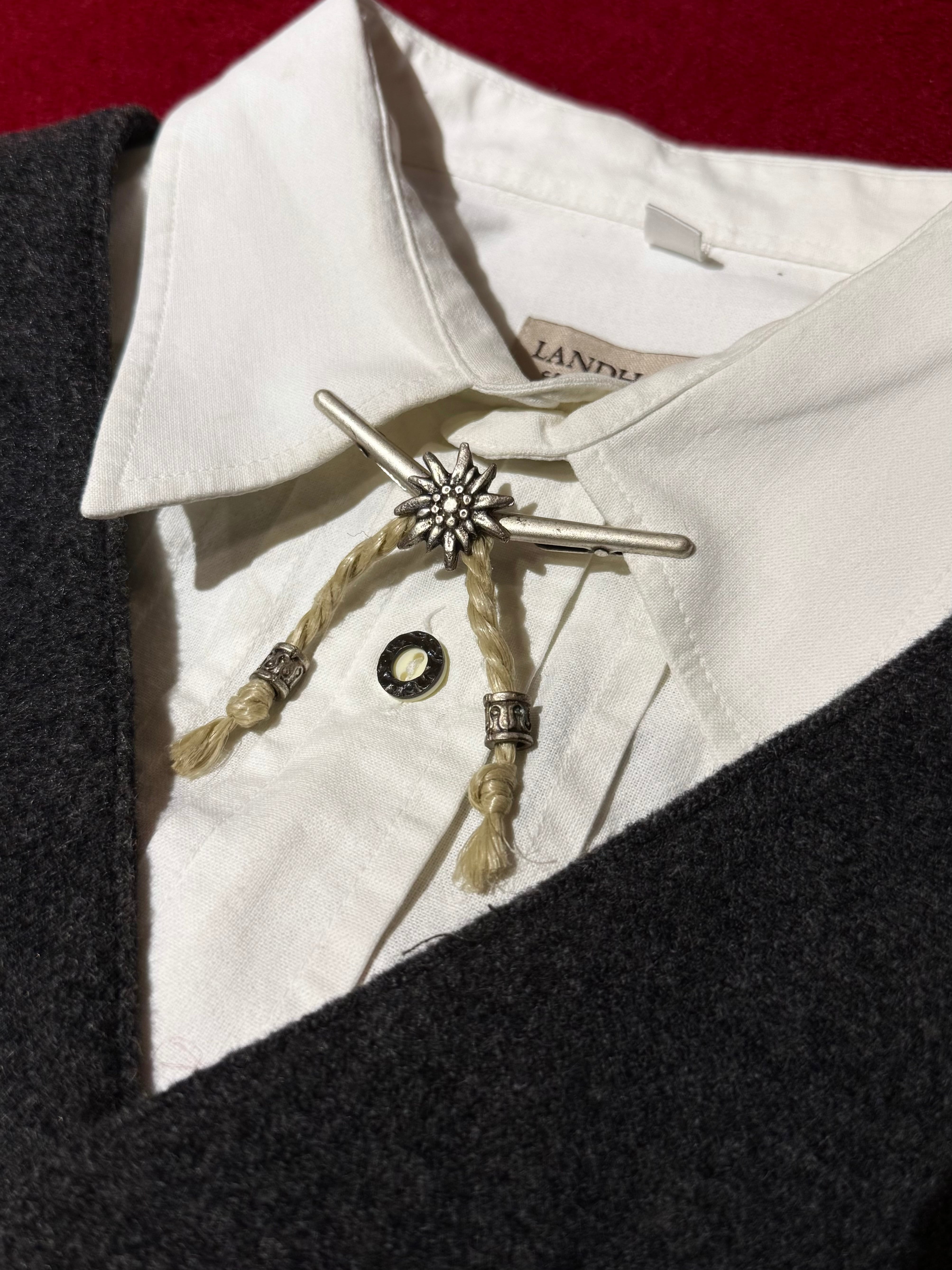 チロリアンスタイルでは、シャツのトップ部分に施された刺繍や装飾ボタンが特徴的なため、ネクタイよりもクリップやネクタイループを合わせるのが主流とされてきました。