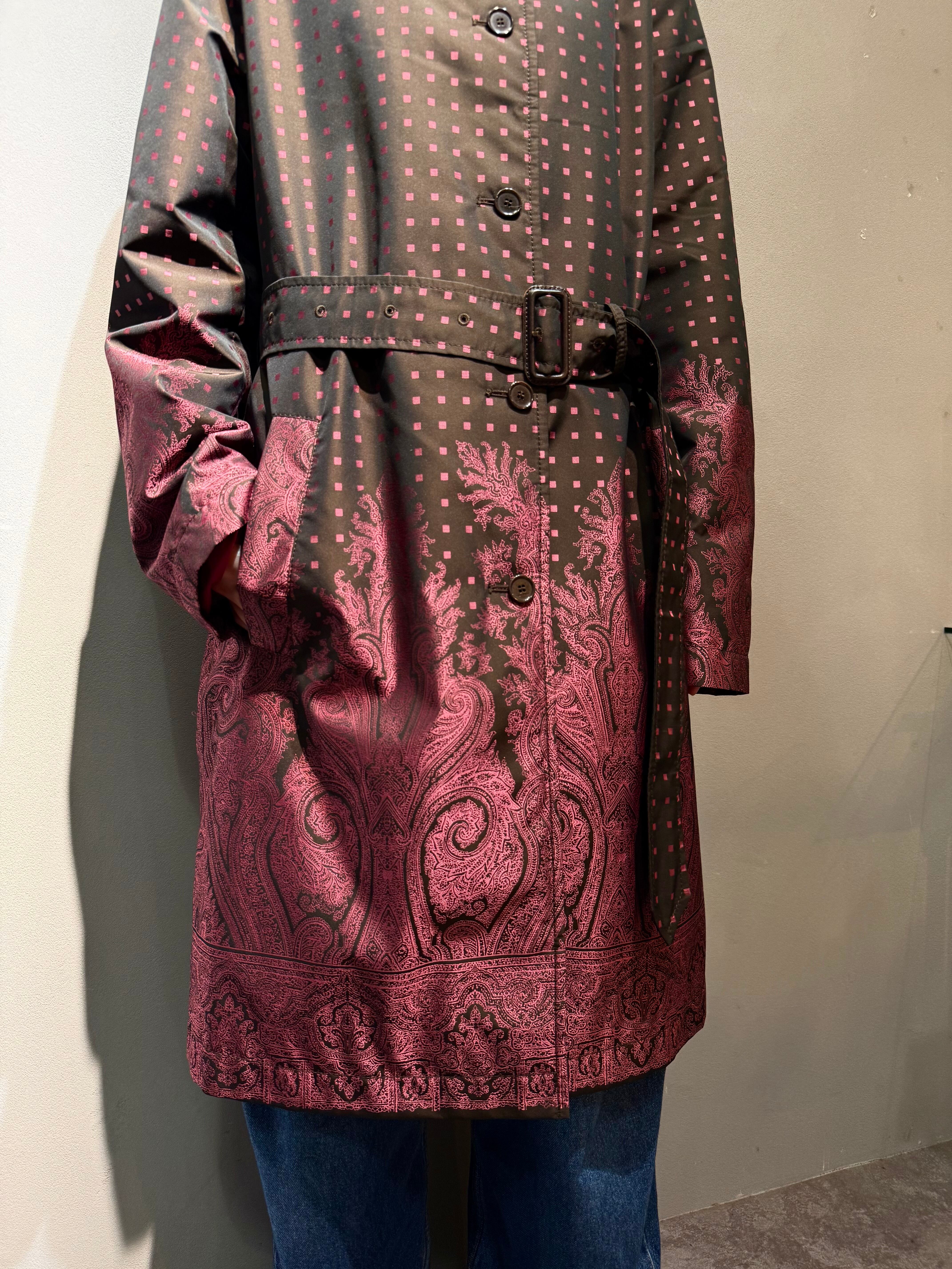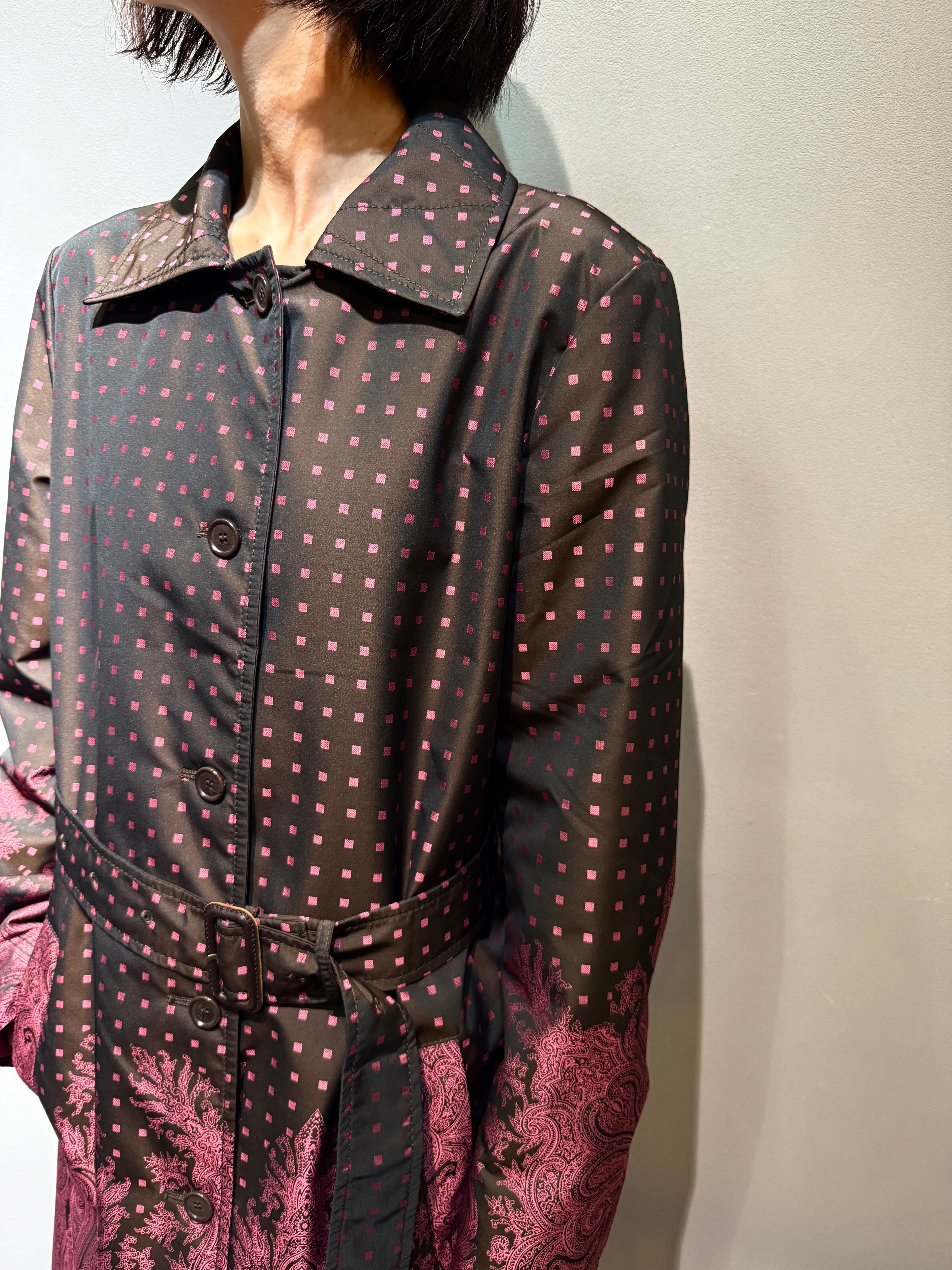 エトロならではの大胆な色使いとアート性を凝縮した存在感抜群のコート。ベースにはペイズリー柄とチェック。全面黒とピンクを基調とした総柄で目を惹きます。