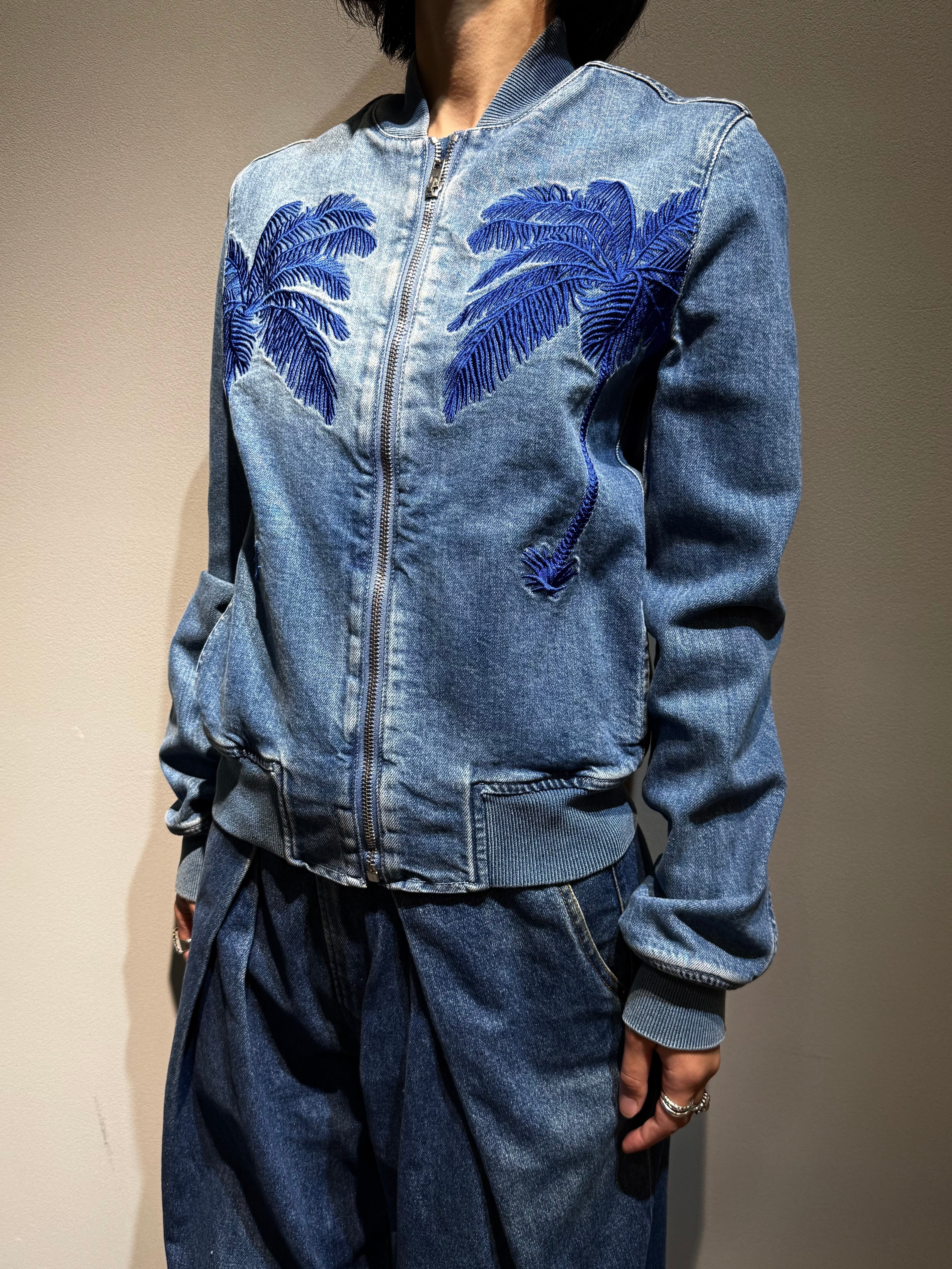 柔らかな風合いのアイスブルーのデニム地に、ヤシの木の刺繍がアクセントを添えた、ユニセックスで楽しめる一着。