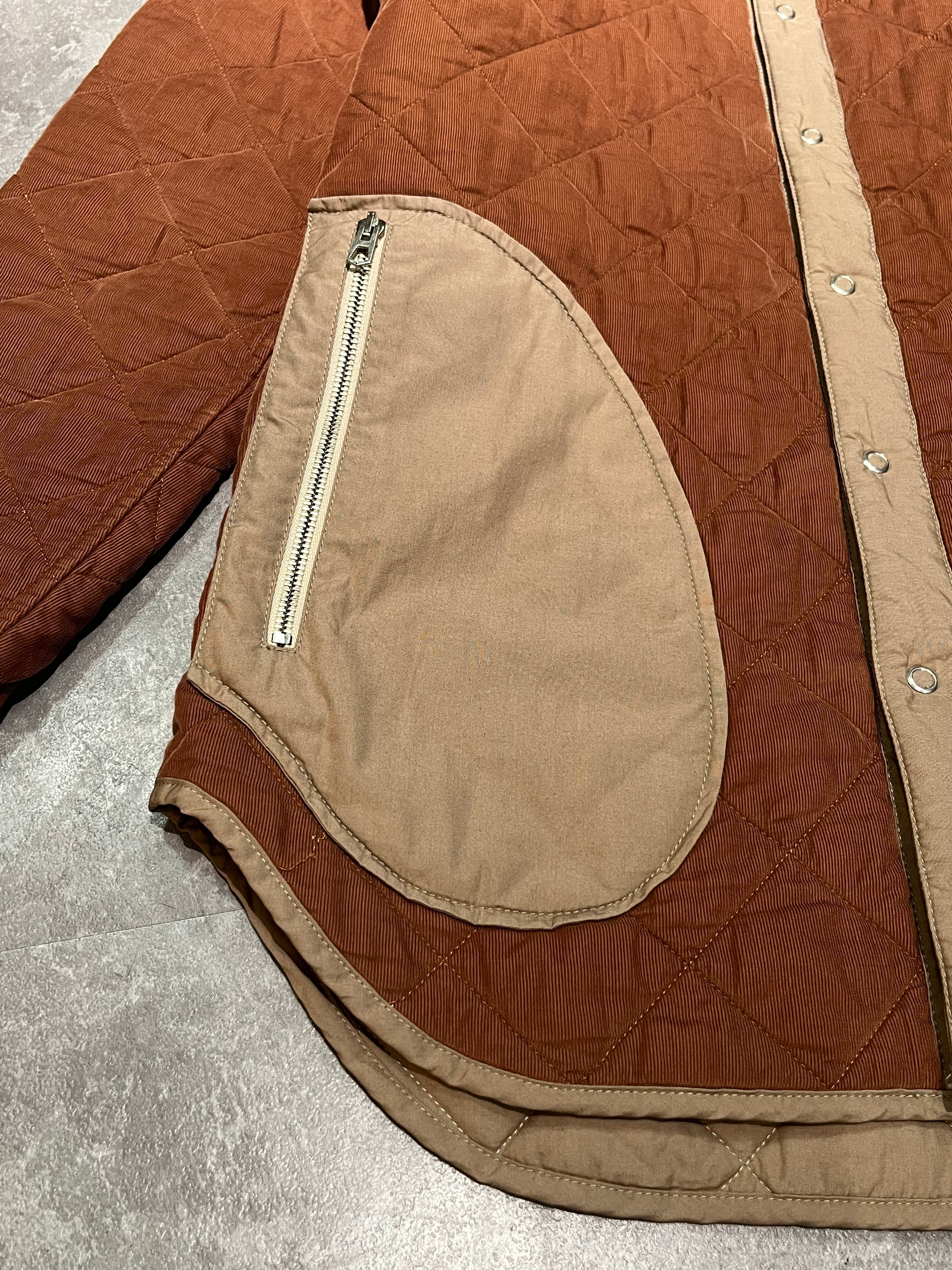 深みのあるブラウンに、ベージュのコントラストが効いたデザインは、大胆さと品の良さを兼ね備えた一着。大きめのラウンドポケットや切り替えディテールがアクセントとなり、ブランドならではのクラフト感を表現しています。