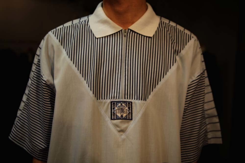 ポロシャツ仕様の襟元と裾のリブ使いがスポーティーで、80’s感漂う身幅と袖幅のゆったり感・更に今年s/sシーズン注目のストライプが取り入れられたアンバランスなようでどこか今っぽさを感じるなかなか珍しい一着です。