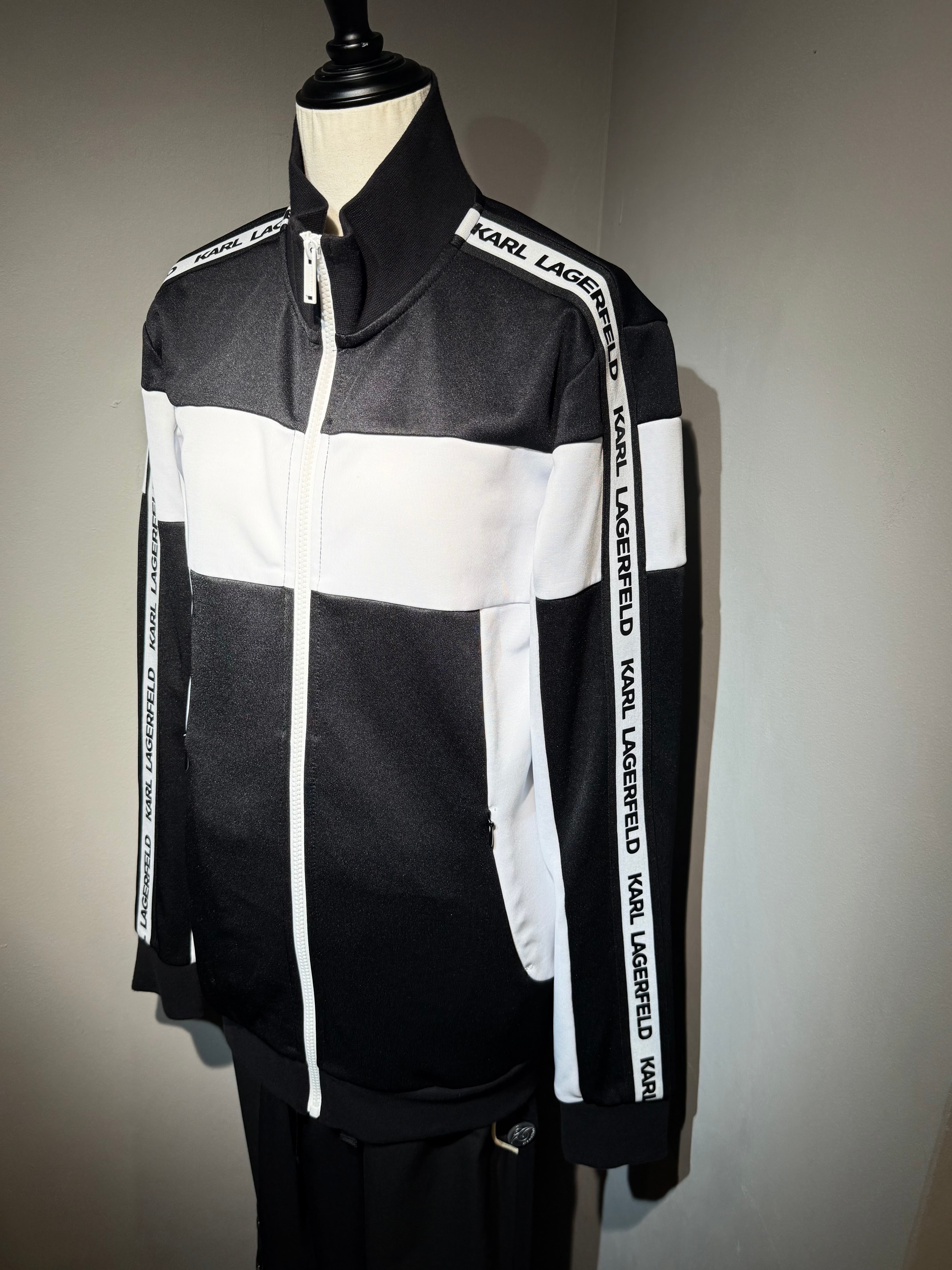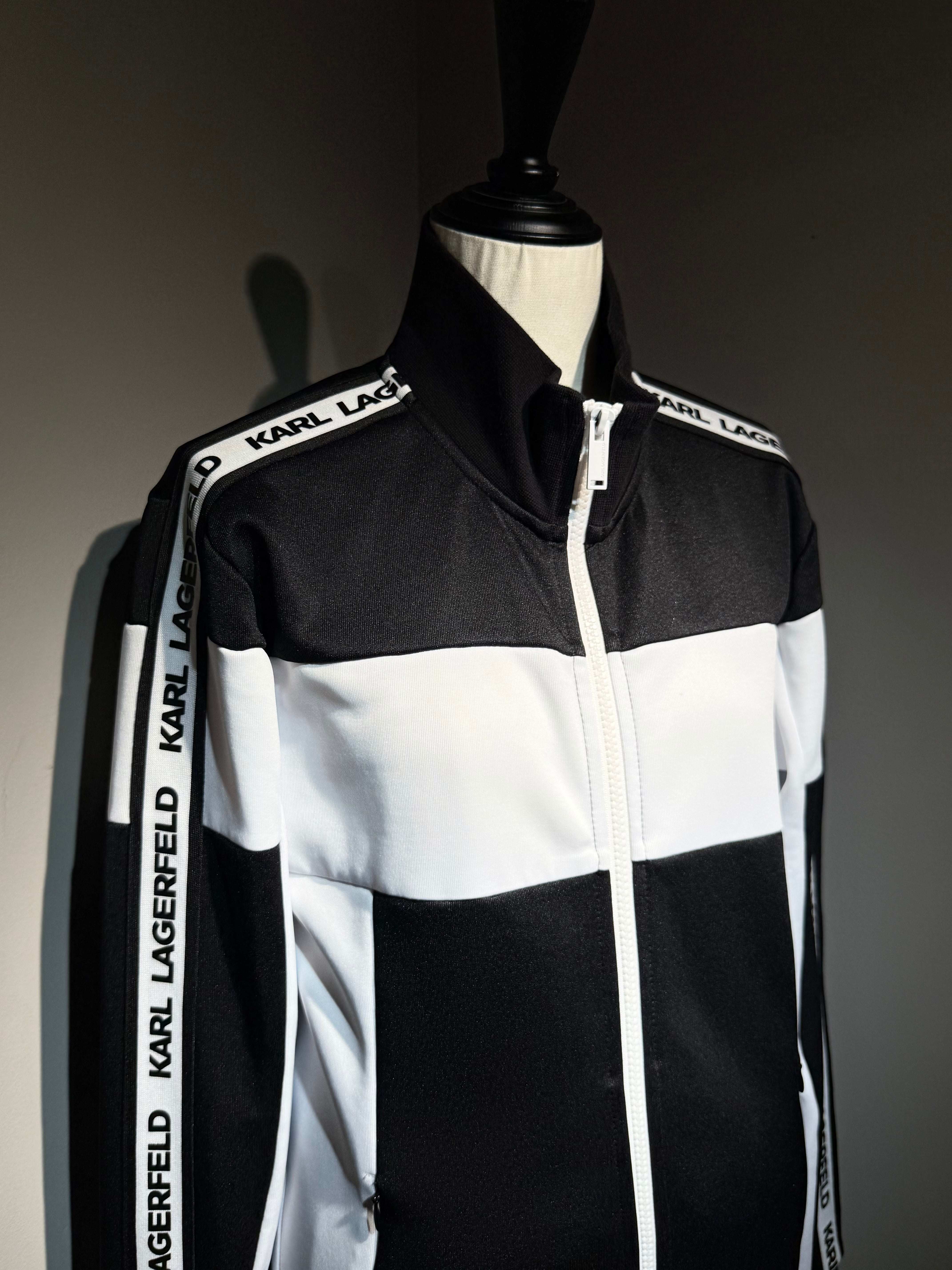 トラックジャージでありながら、モードなシルエットとカールラガーフェルドのロゴに、エッジの効いたディテールが光る、カール・ラガーフェルドらしい一着です。