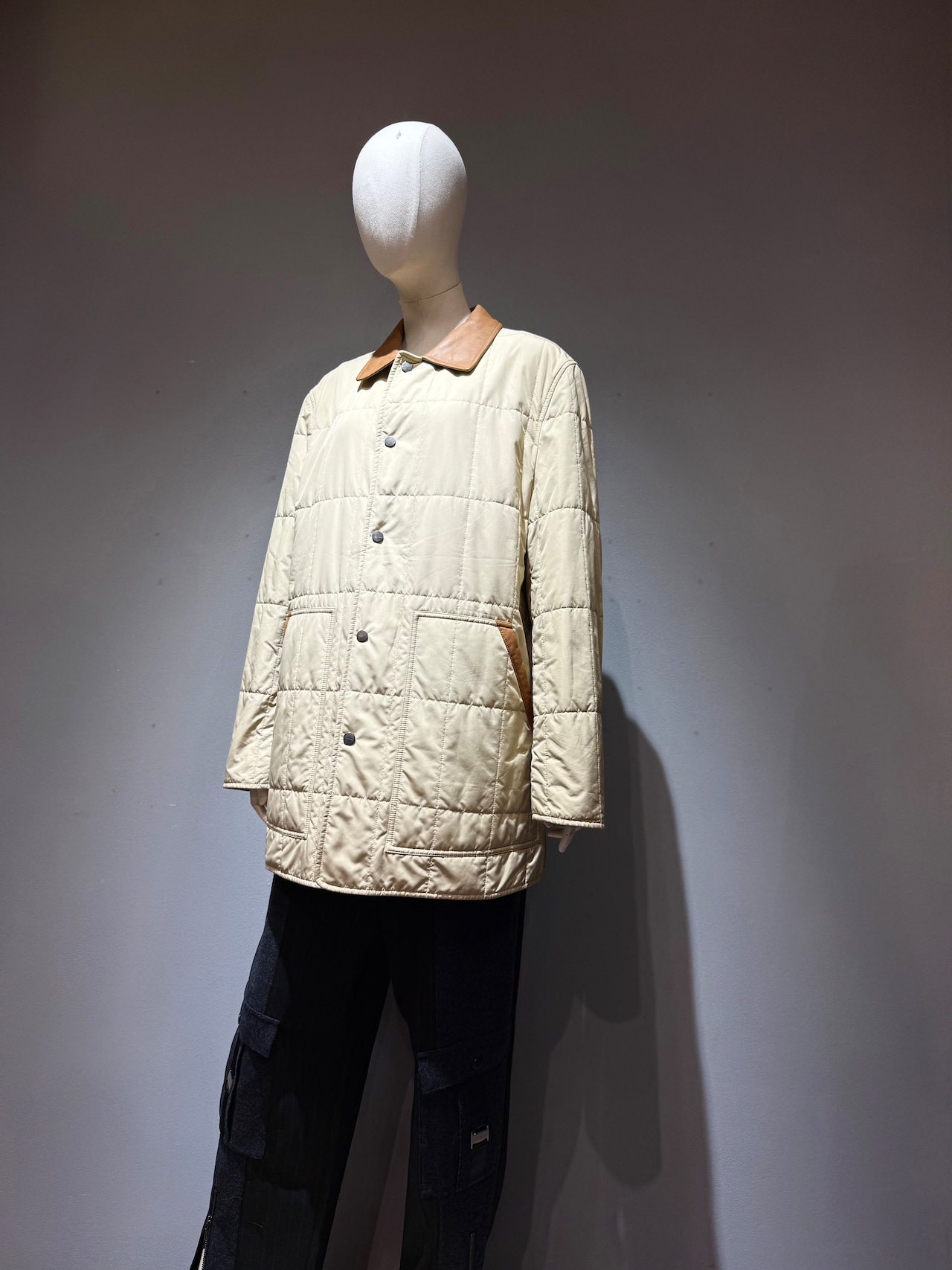 襟とポケットにはレザーを使用し、細部まで丁寧に仕上げられたラグジュアリーなデザインです。アイテム自体は非常に軽量で、着回しのしやすさも魅力。