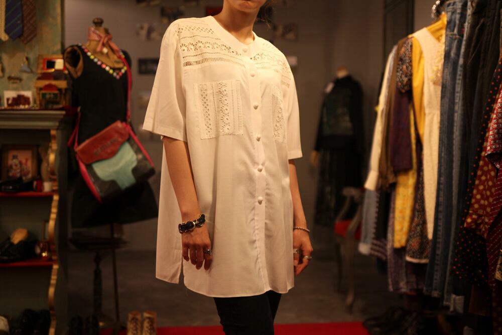 手の込んだアイレットレースをショルダー周りと、胸の両ポケットに贅沢に使用したFRANCE vintage感溢れるディテイル。(アイレット・レース=生地に小さな穴をあけ、縁をかがったり、巻き縫いなどで作る刺繍の技法。アイレットは、小さい穴やハトメの事を示す。)