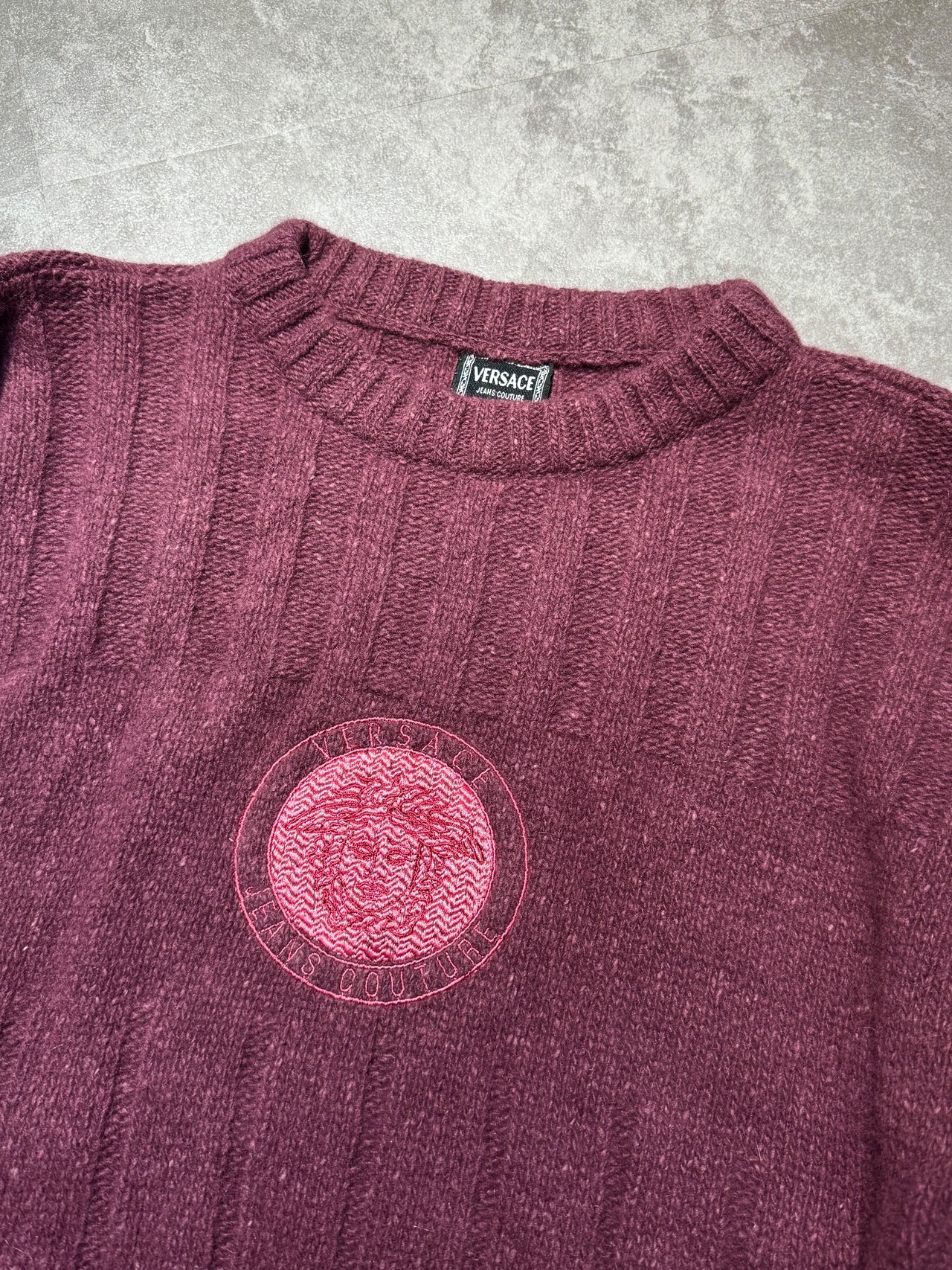 アイコニックなメドゥーサの刺繍がフロントを飾る、Gianni Versace(ジャンニ・ヴェルサーチ) のニットセーター。