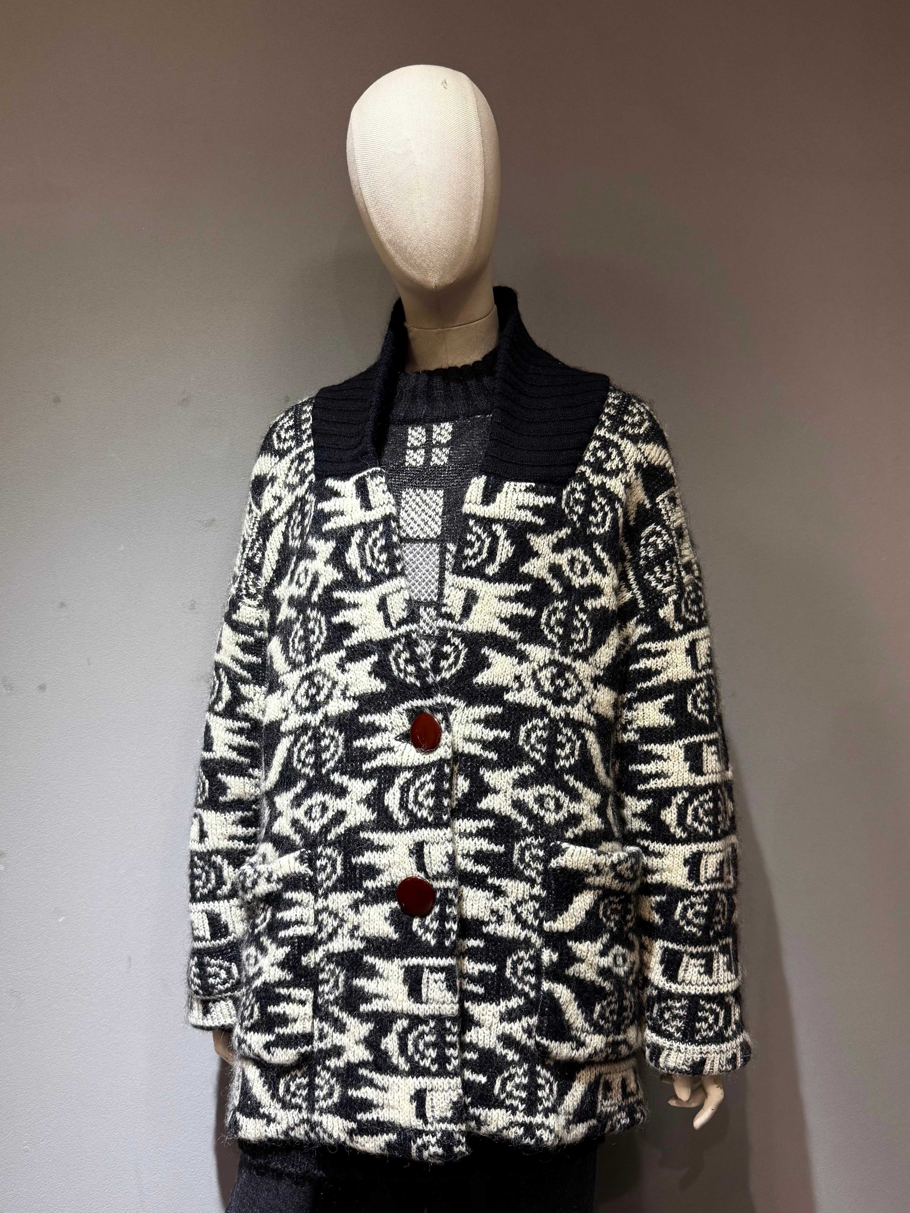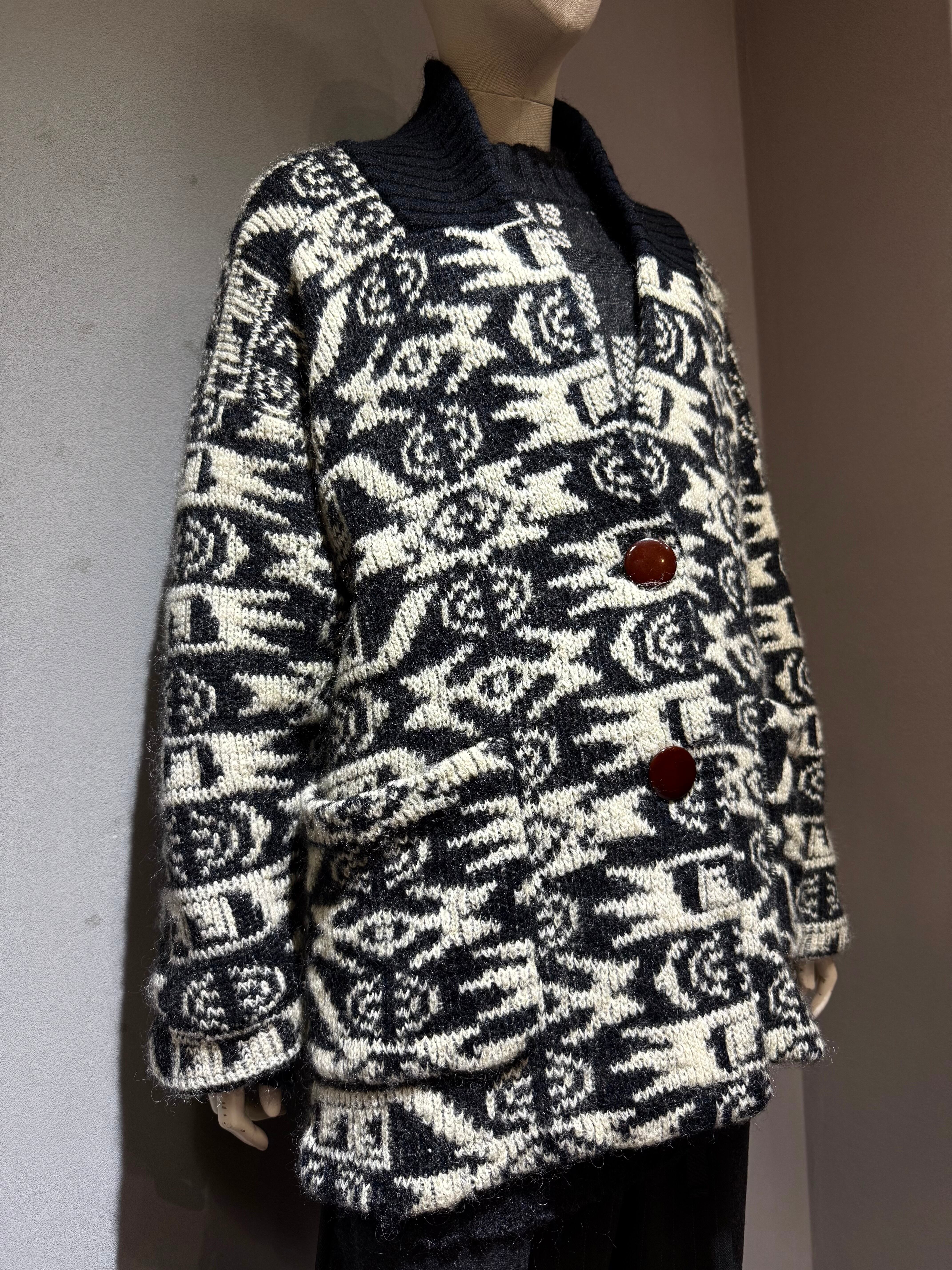 毛足の長めな暖かいウールとチマヨ柄の相性は抜群。 本来赤やライトブルーの色味が強い中でモノトーンで着用のしやすさも魅力です。