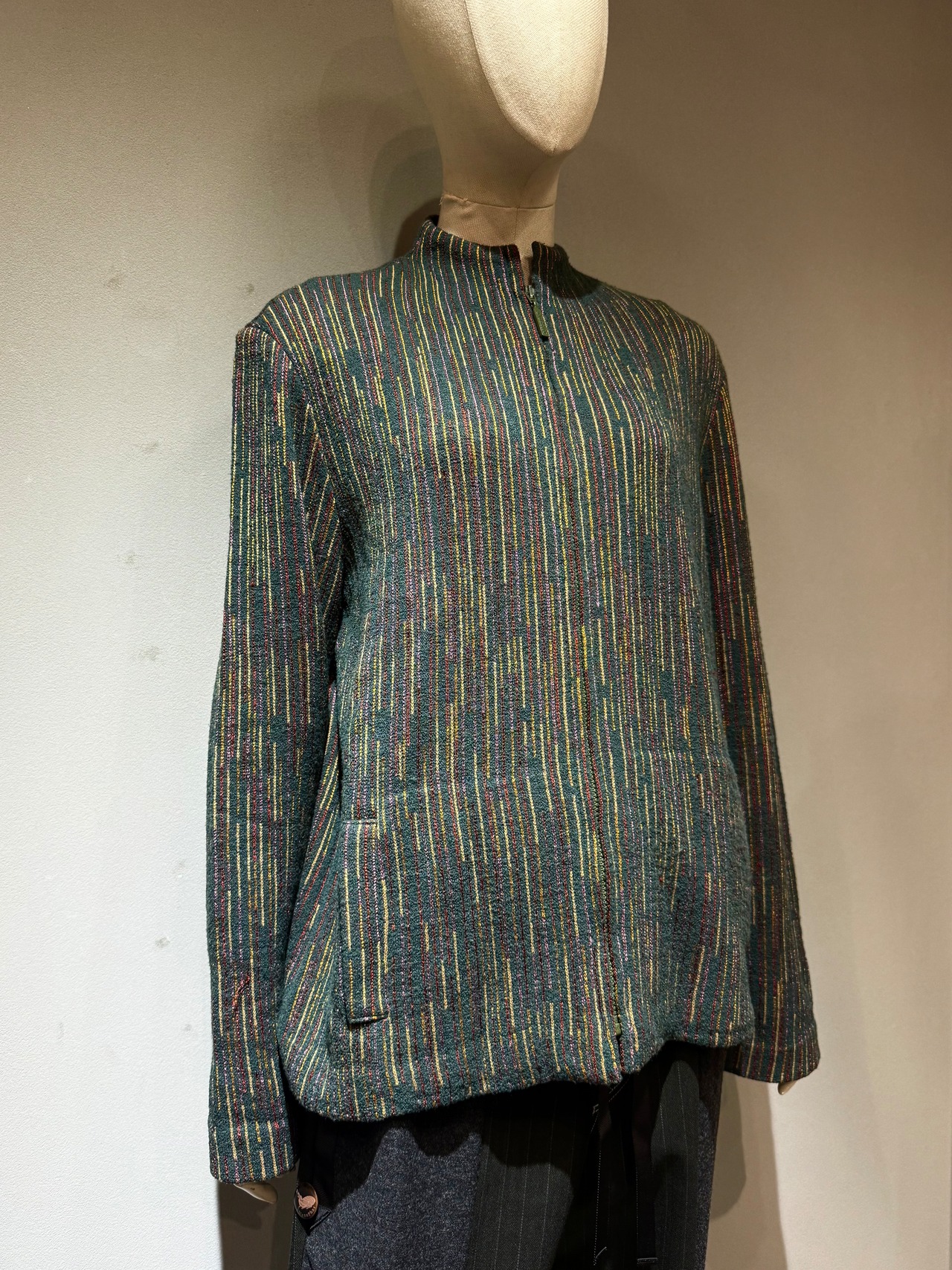 タイトで短丈のシルエットに、繊細なカラーグラデーションを組み合わせることで、華やかで印象的な佇まいに。羽織るだけでコーディネートの主役になる一枚です。