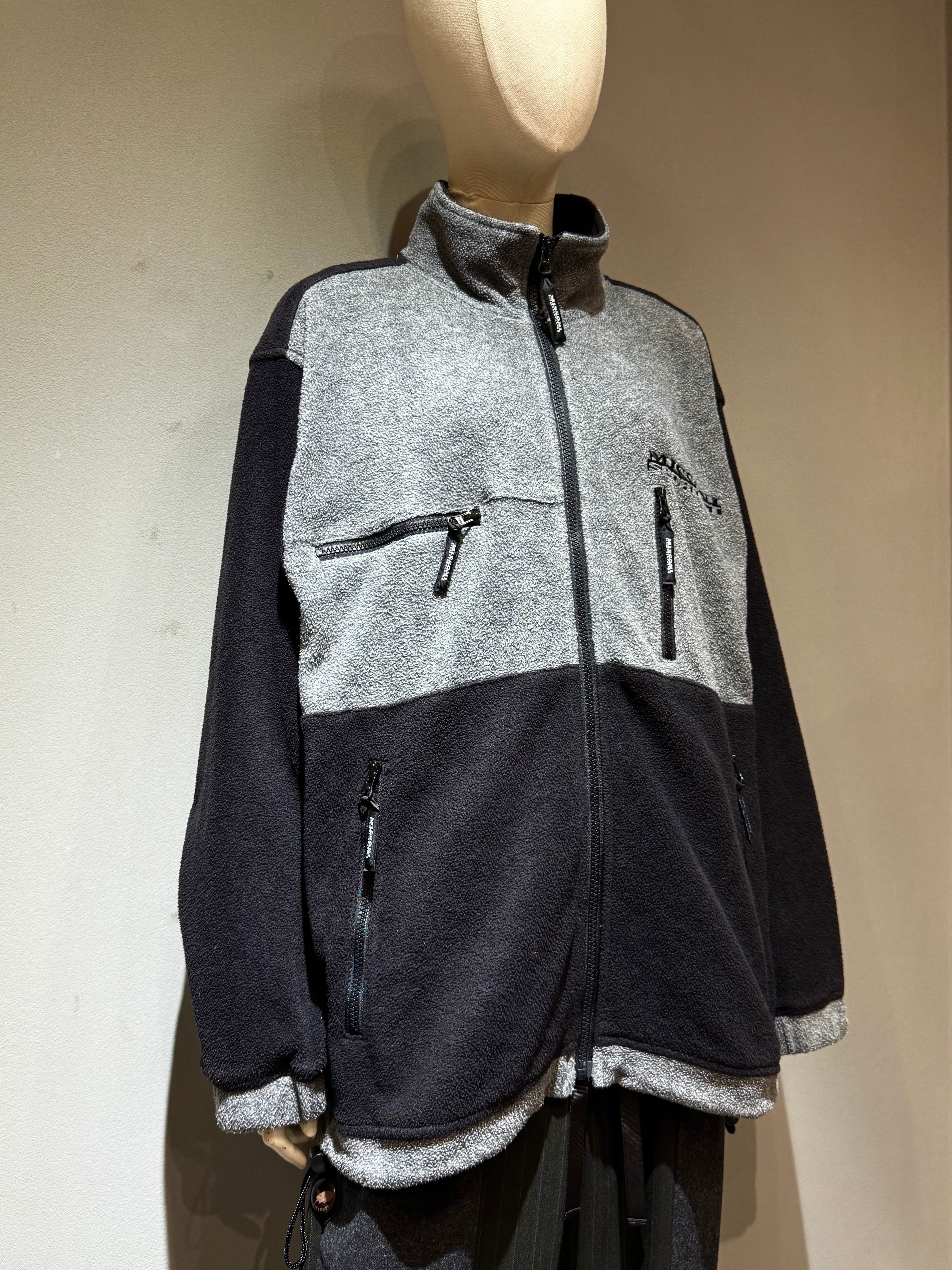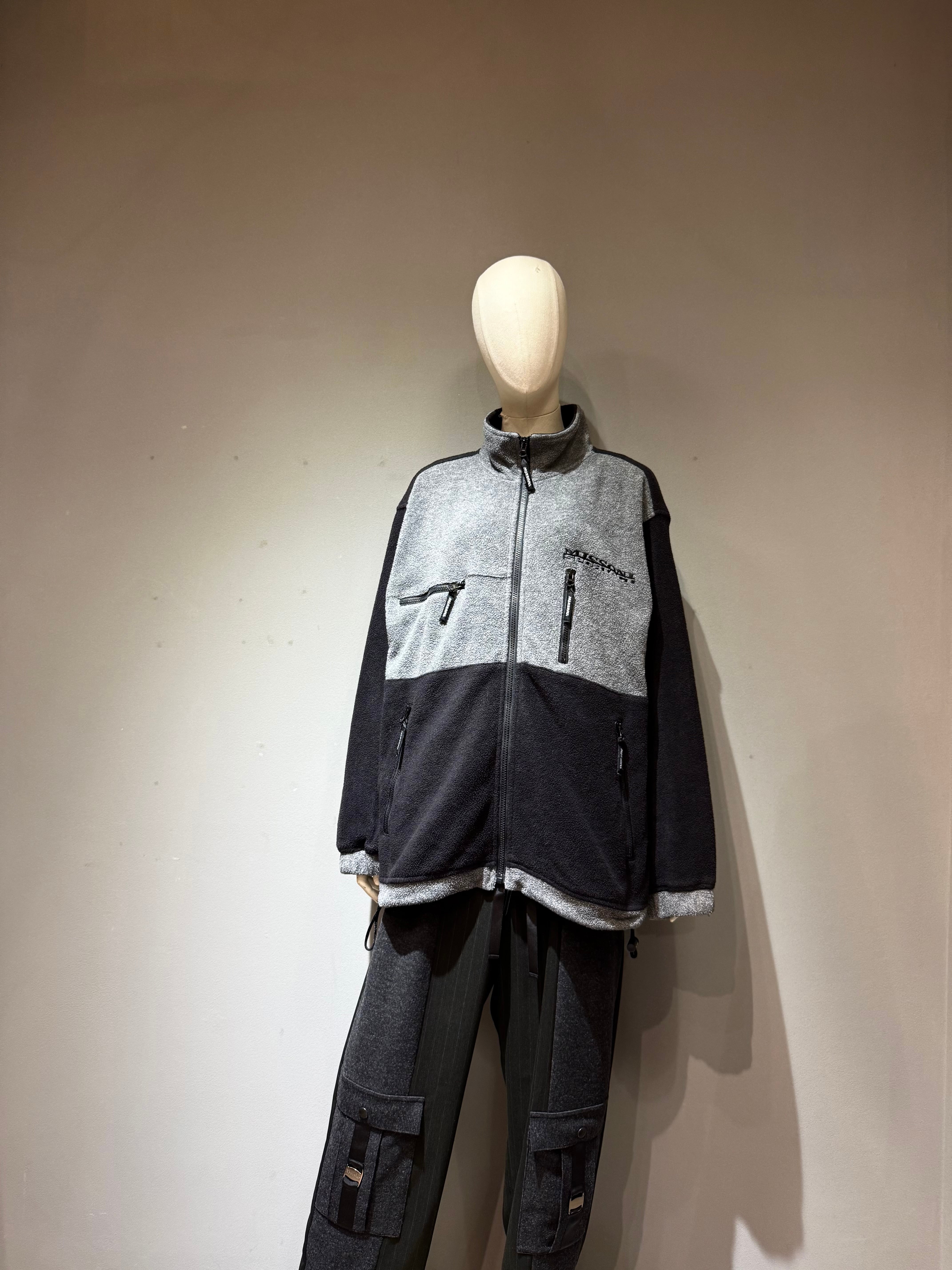 ブラックとグレーの大胆な切り替えが印象的で、カジュアルでありながらもどこかモードな雰囲気を感じさせるデザインに仕上がっています。