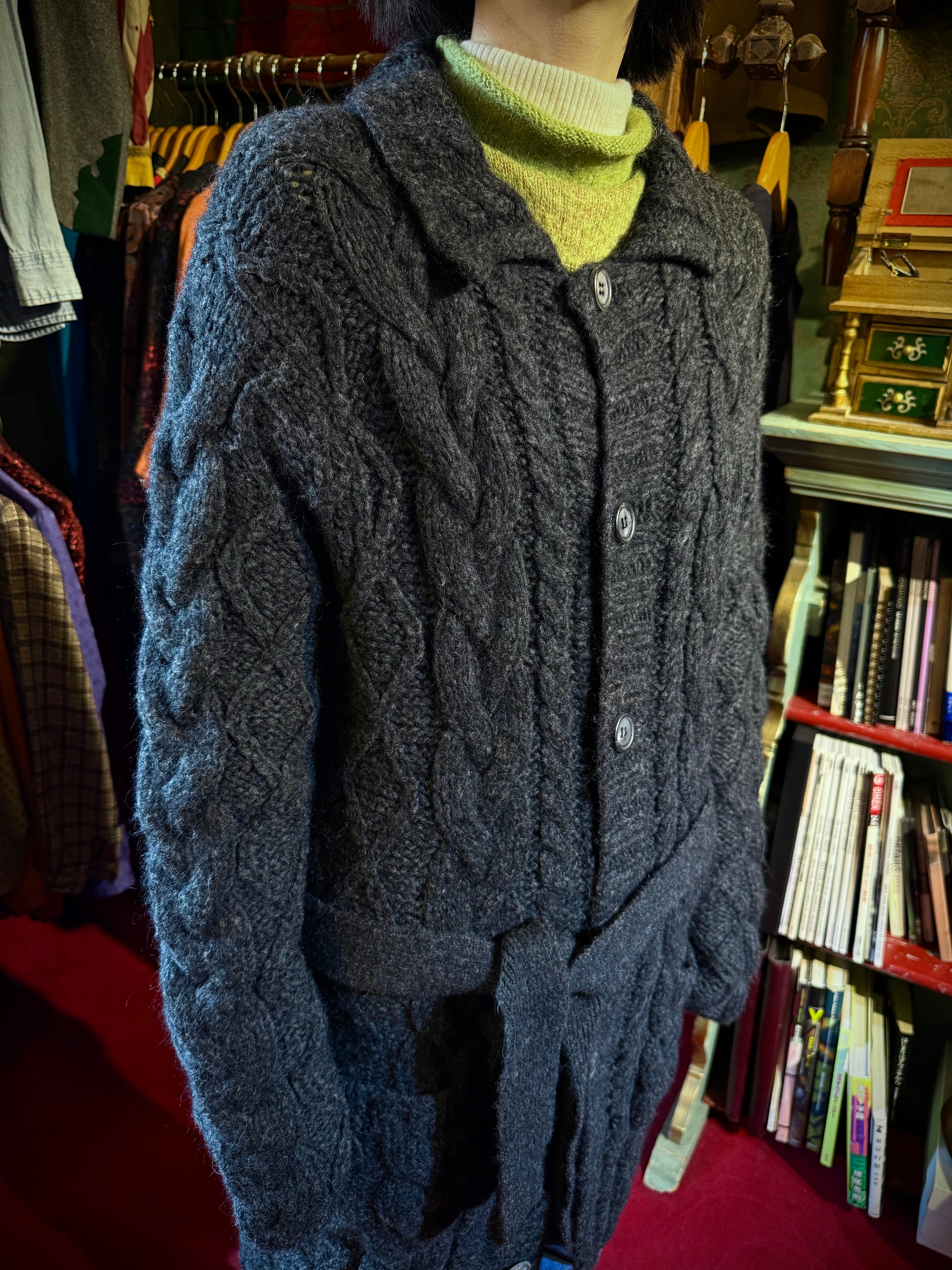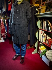 ナイロン混ウール素材により、ロウゲージのケーブル生地感が上品に映え、ロング丈にタブを施した袖がモードのエッセンスを際立たせます。