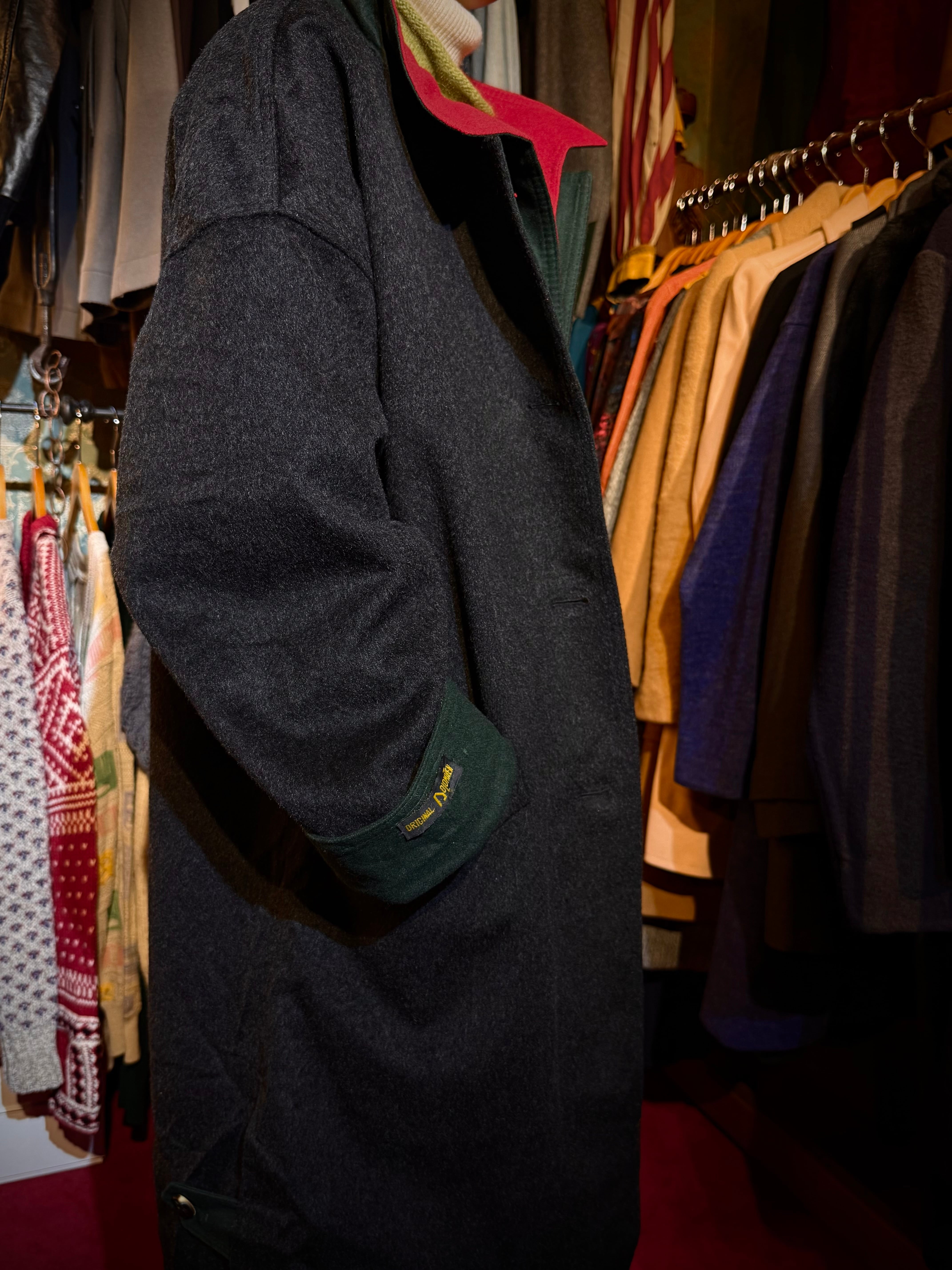 ダークグレーを基調に、チロルの自然を思わせるモスグリーンと赤の差し色が映える、雰囲気のある一着です。