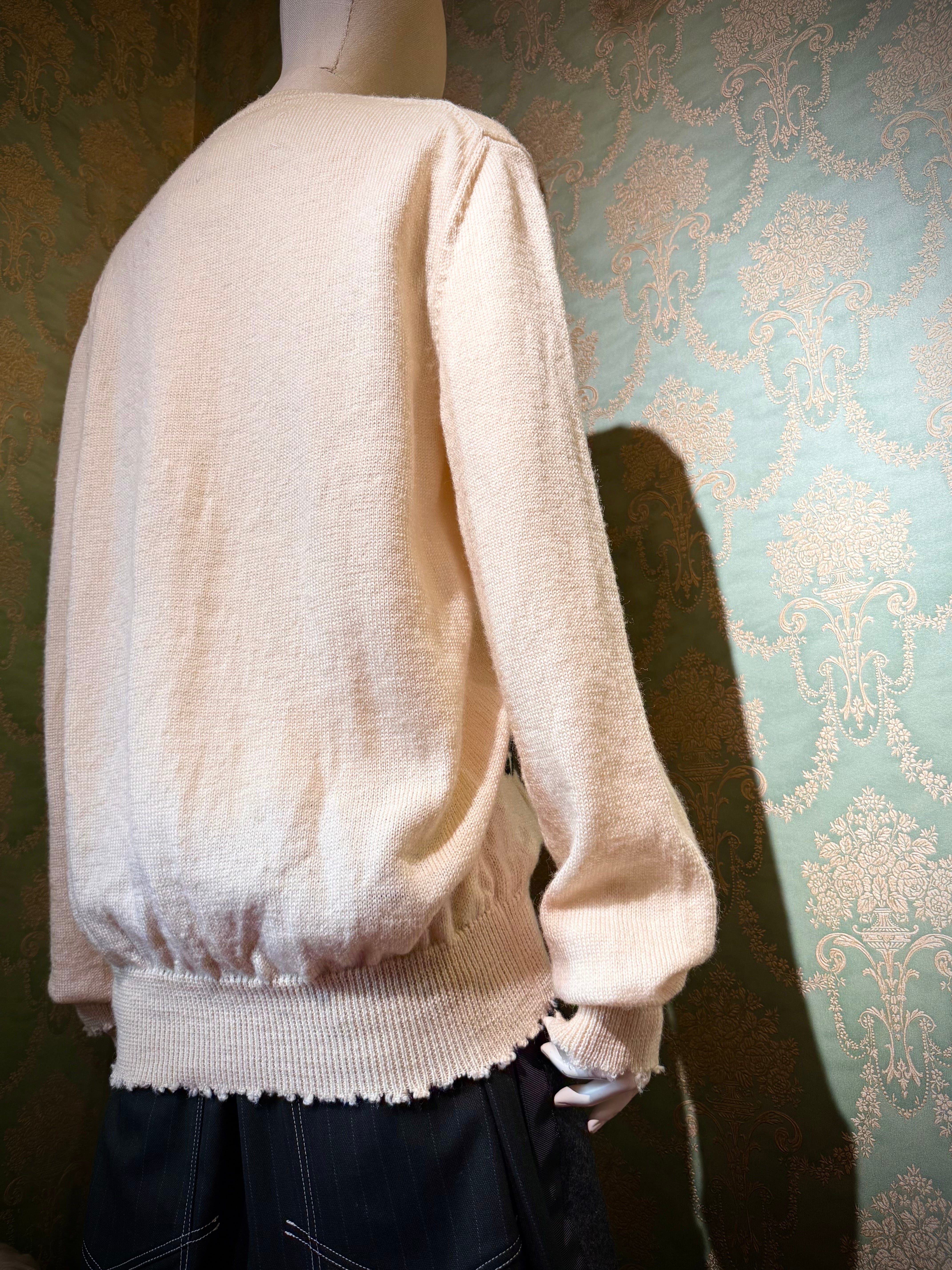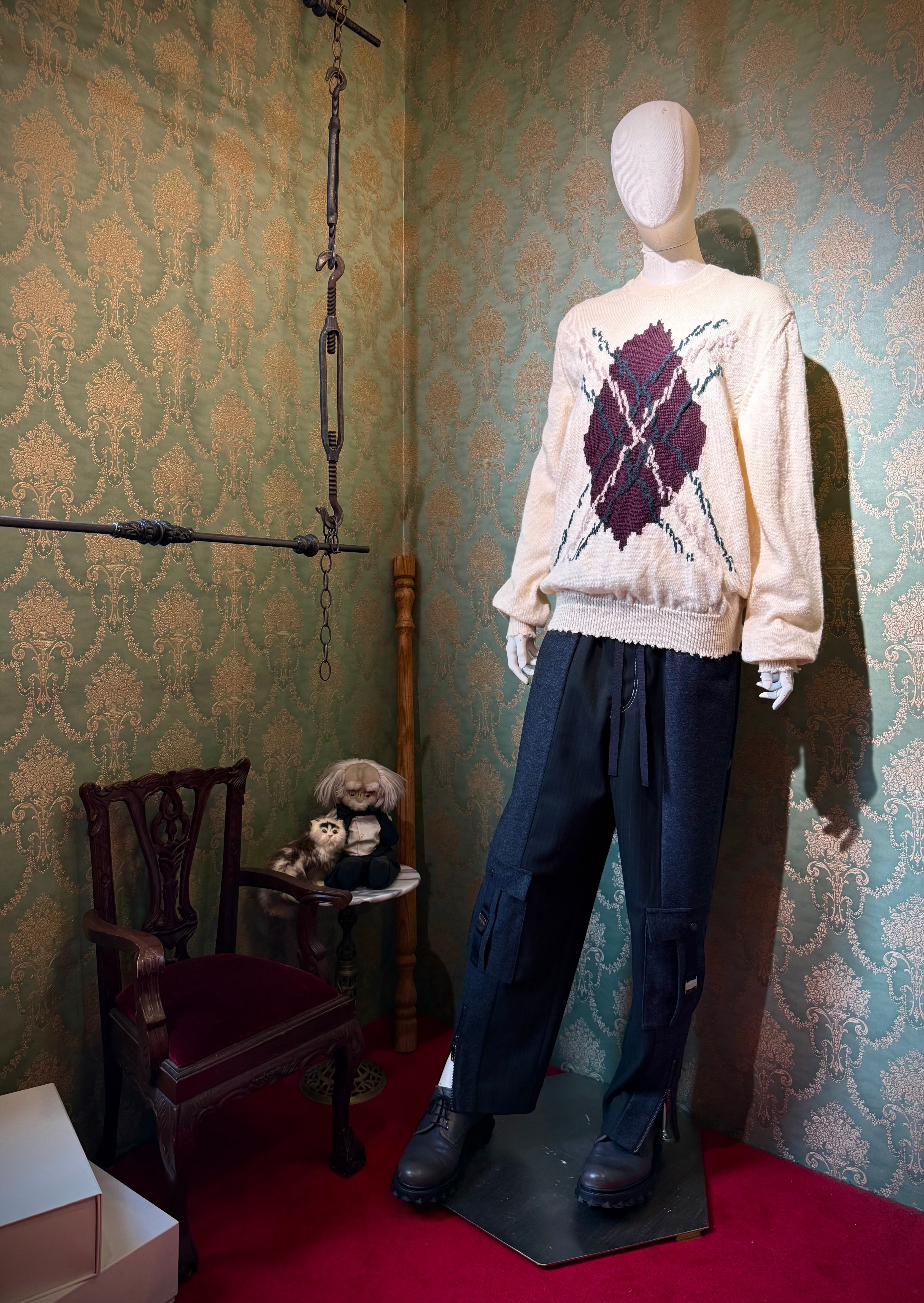 伝統的なアーガイルを、ほつれや歪みを思わせる独特のタッチで崩すことで、ブランド特有の“違和感の美学”が際立つ仕上がりとなっています。