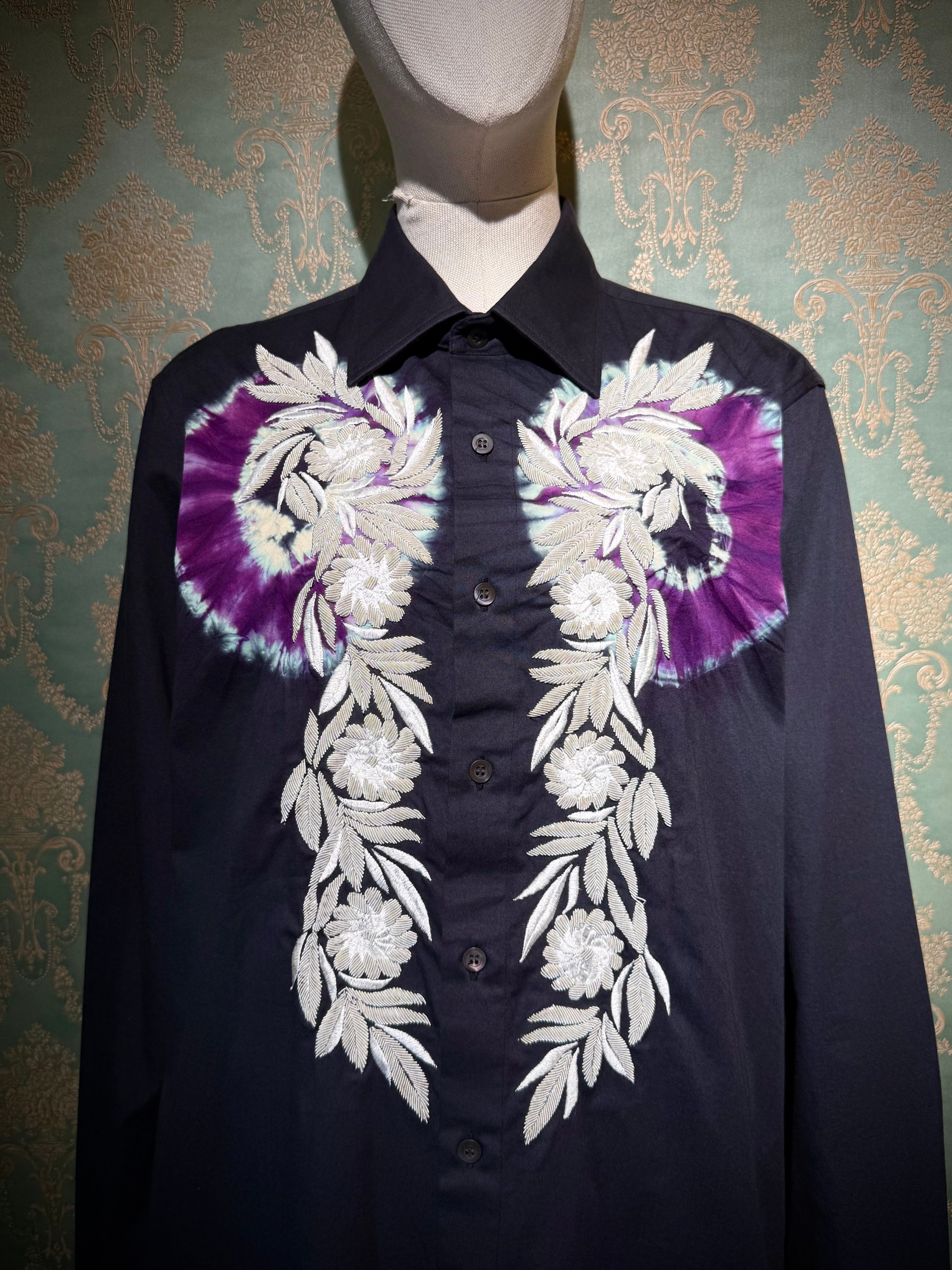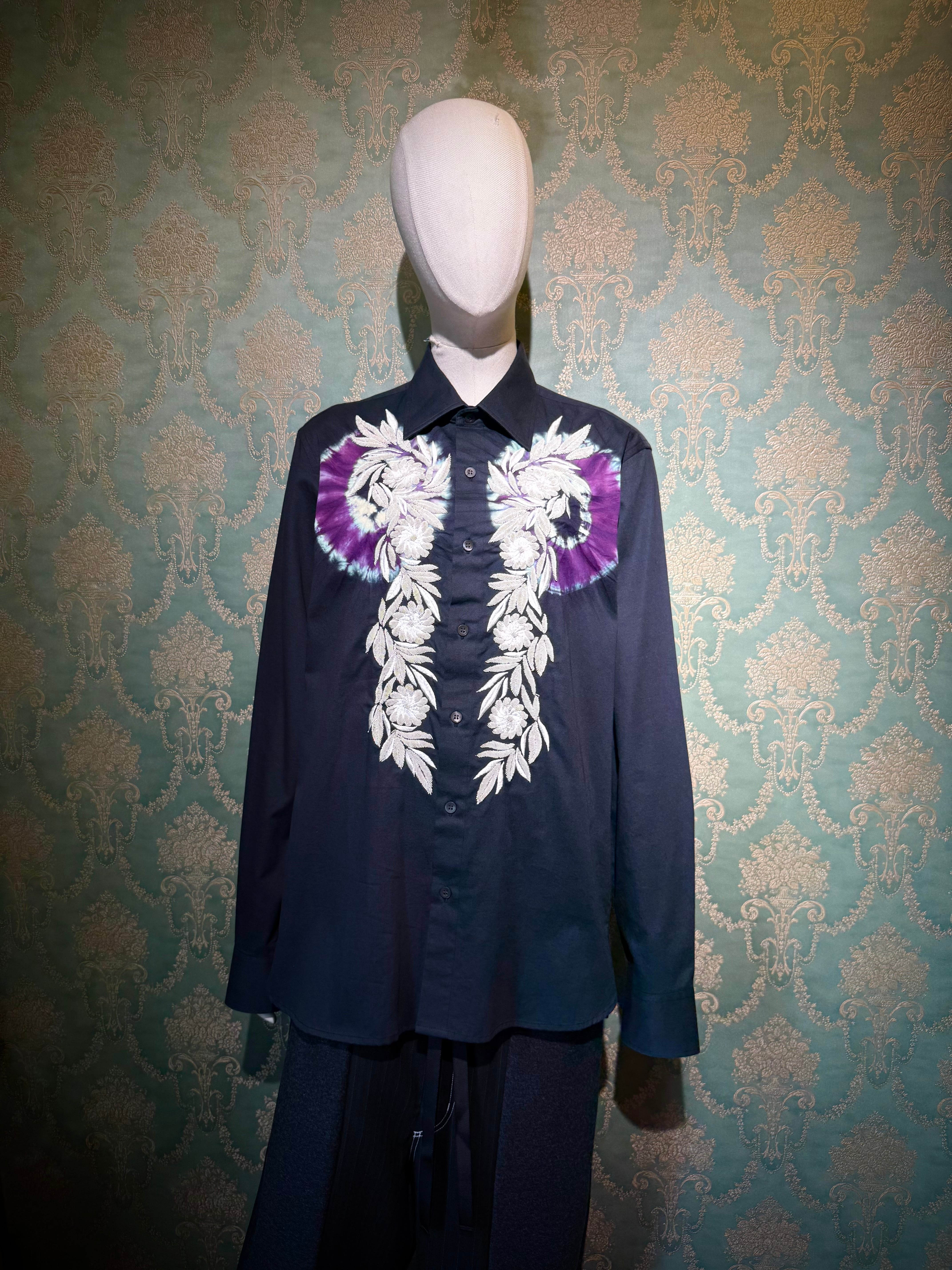 黒のコットンツイル生地に深い紫のタイダイ染めを重ね、さらにインドの職人による白い花柄の手刺繍を施した、クラフト感とエレガンスが共存するデザインが特徴です。