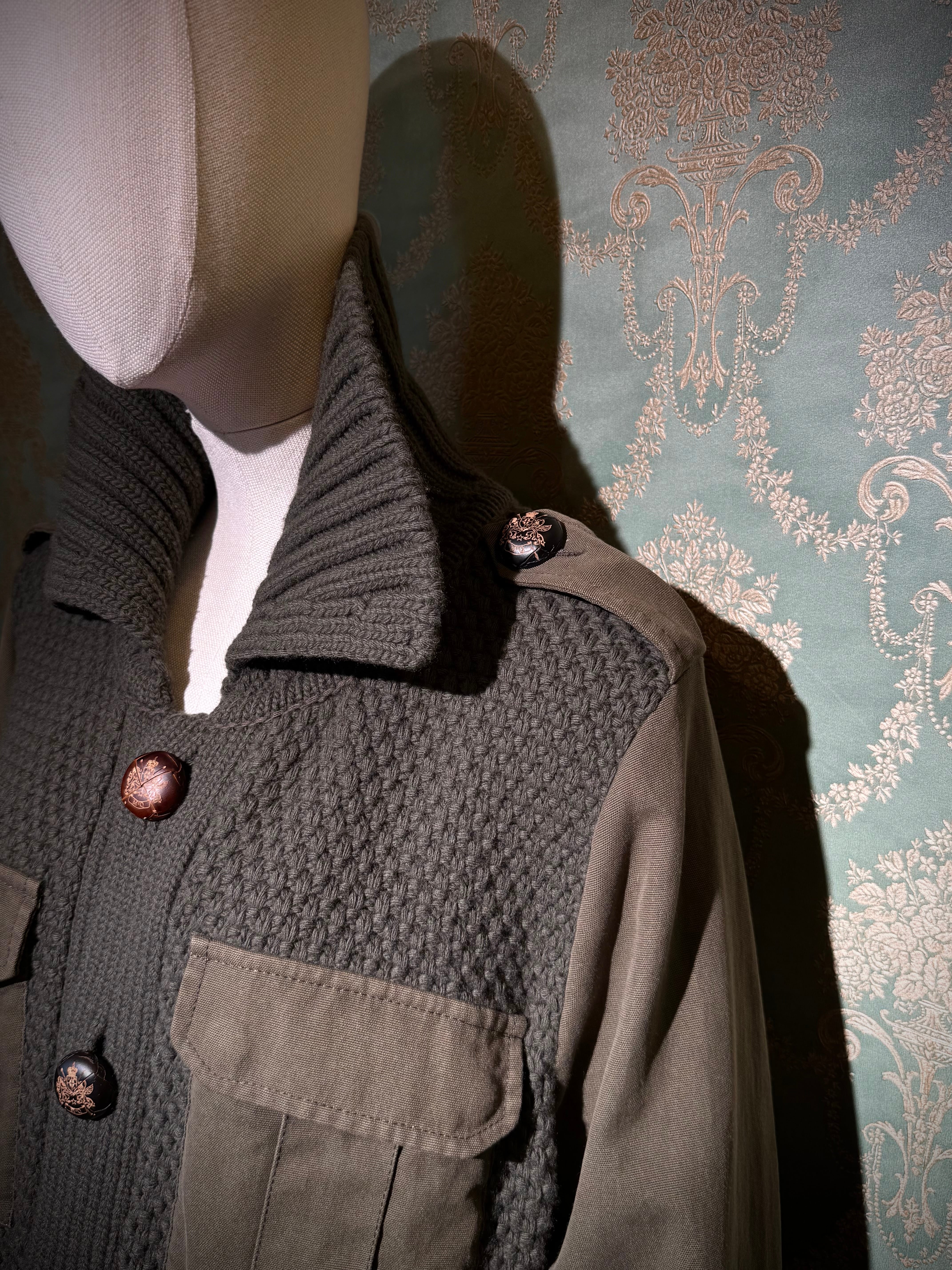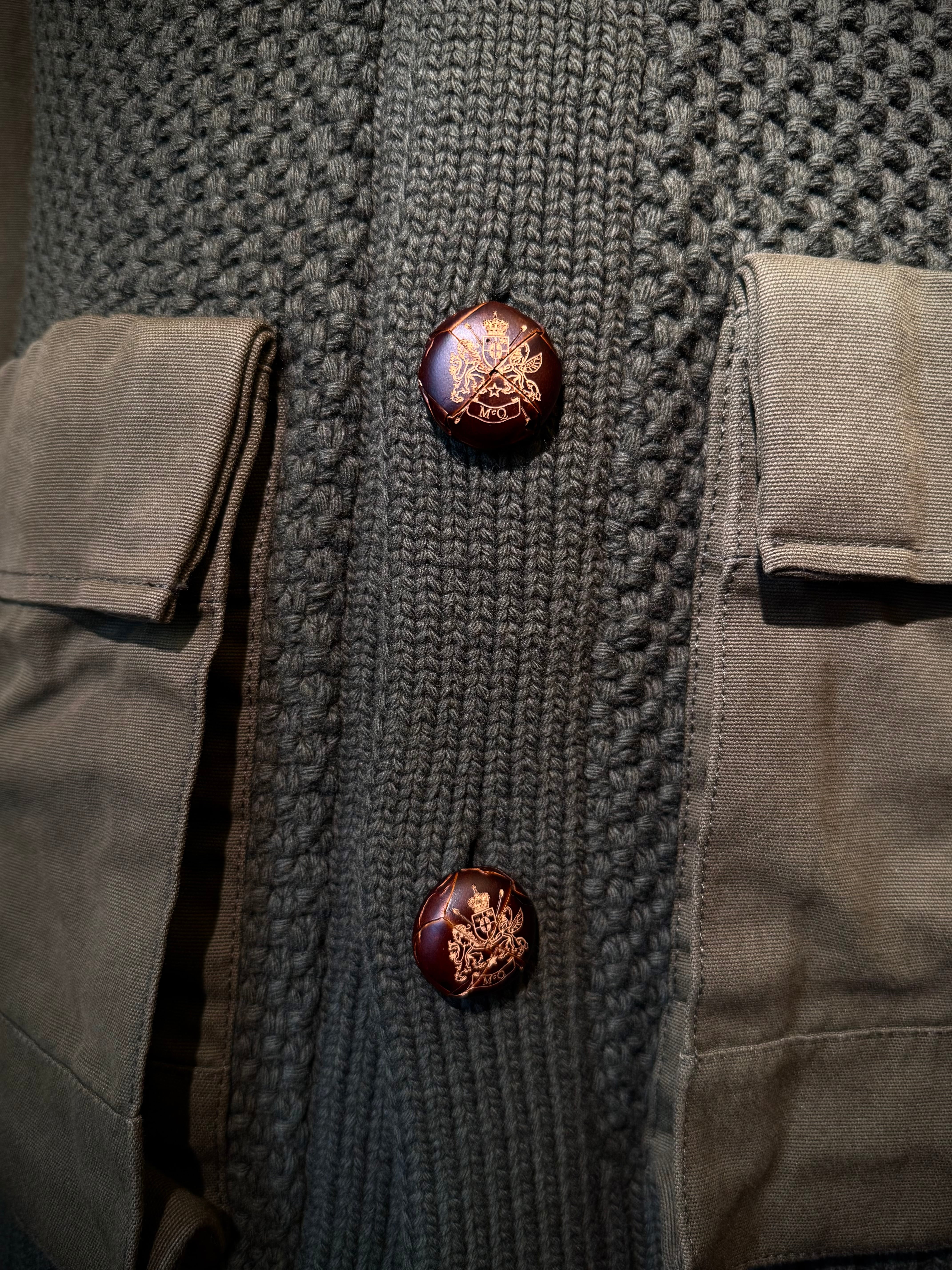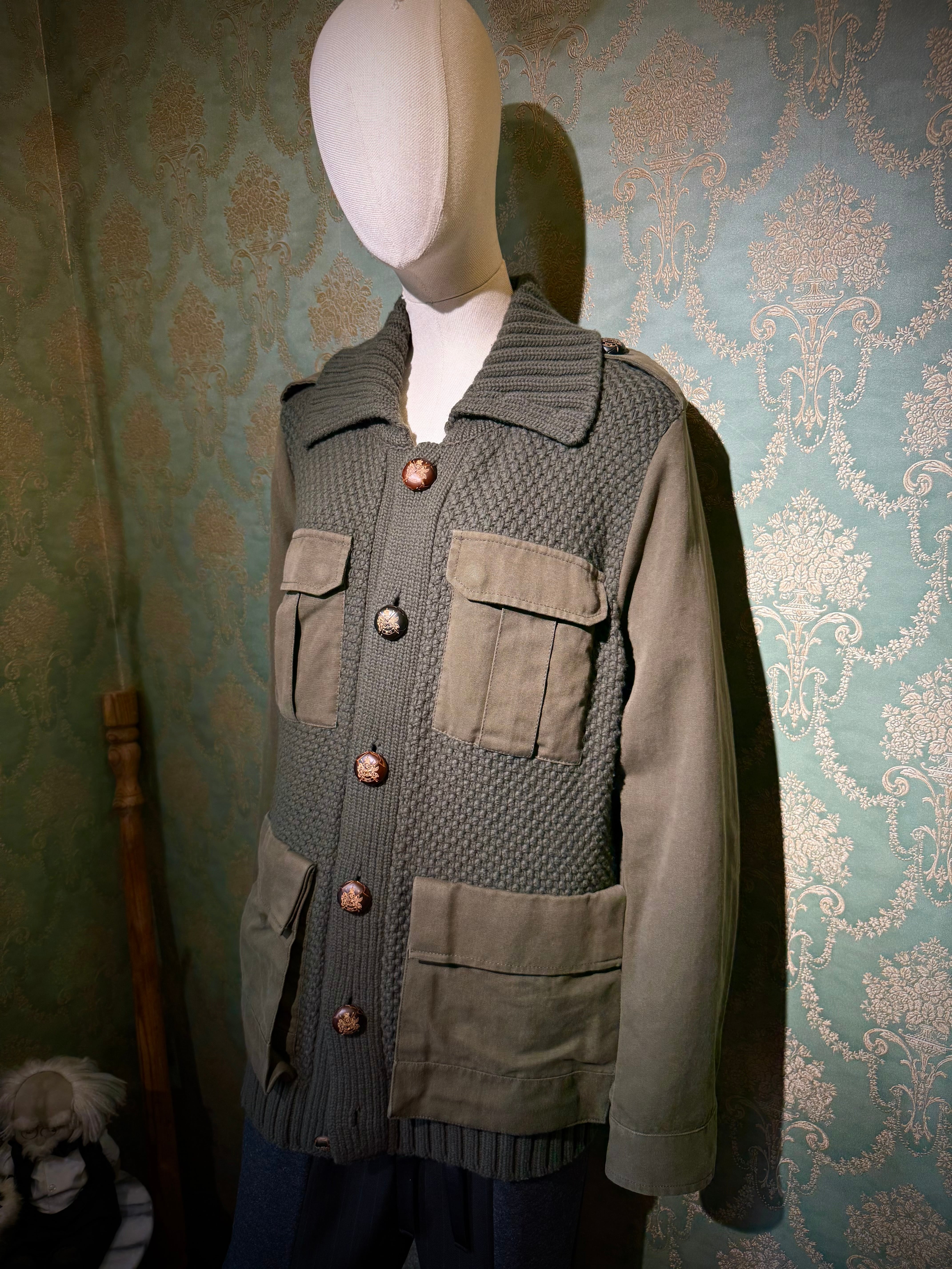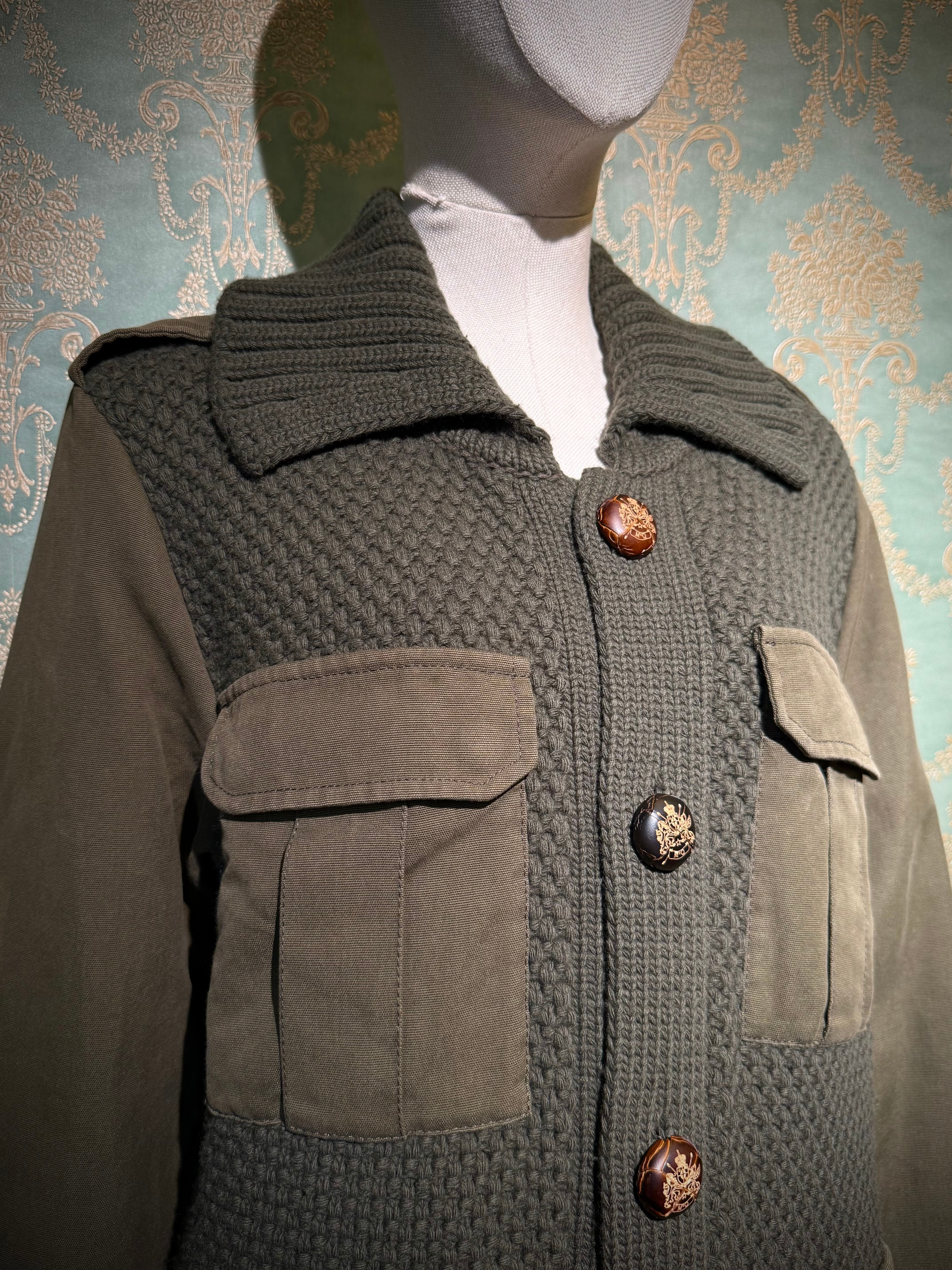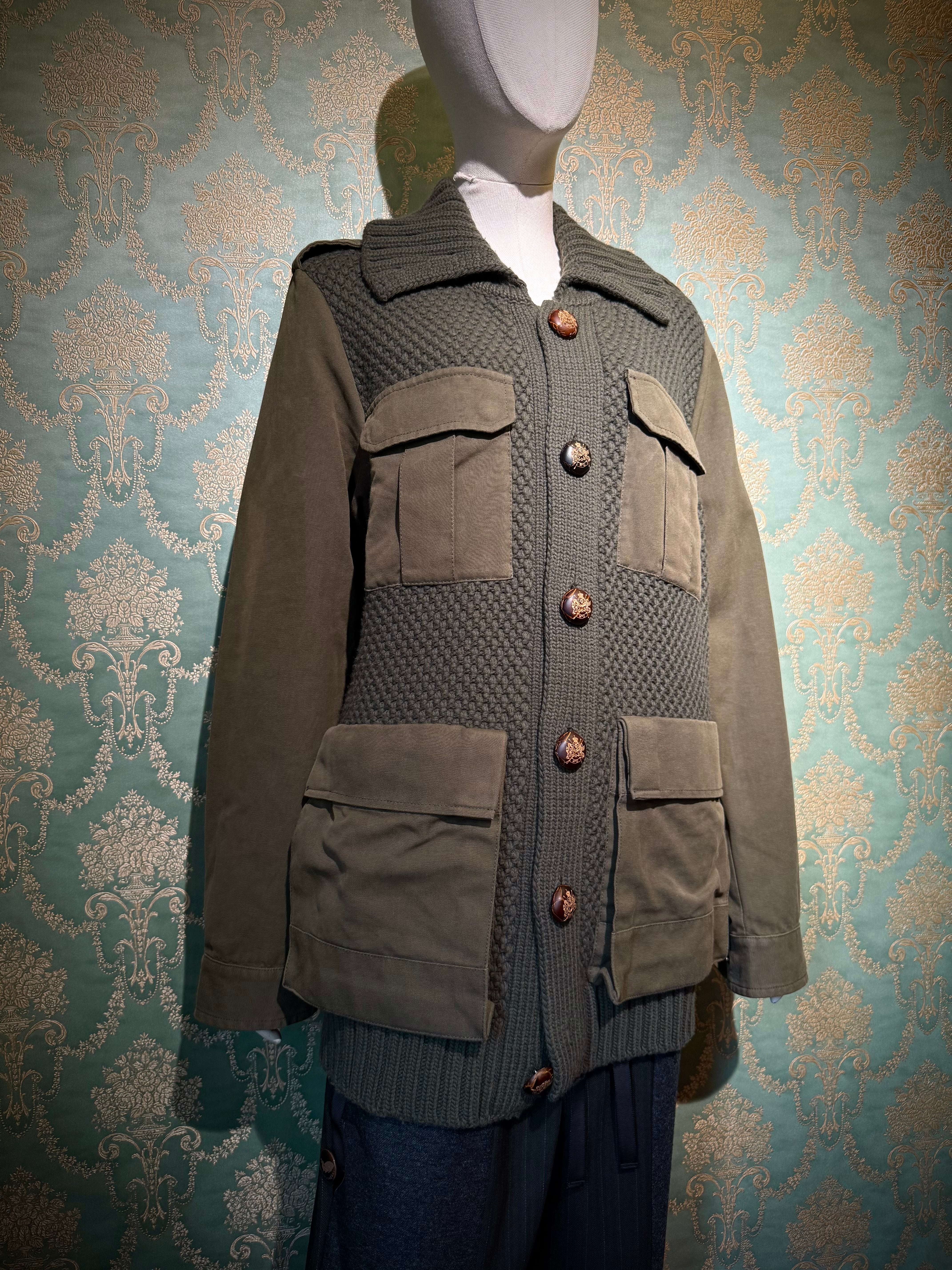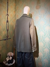 ボディ中央は立体的なニット編み、袖・ポケット部分は布帛素材で切り替えられ、異素材の質感が印象的です。