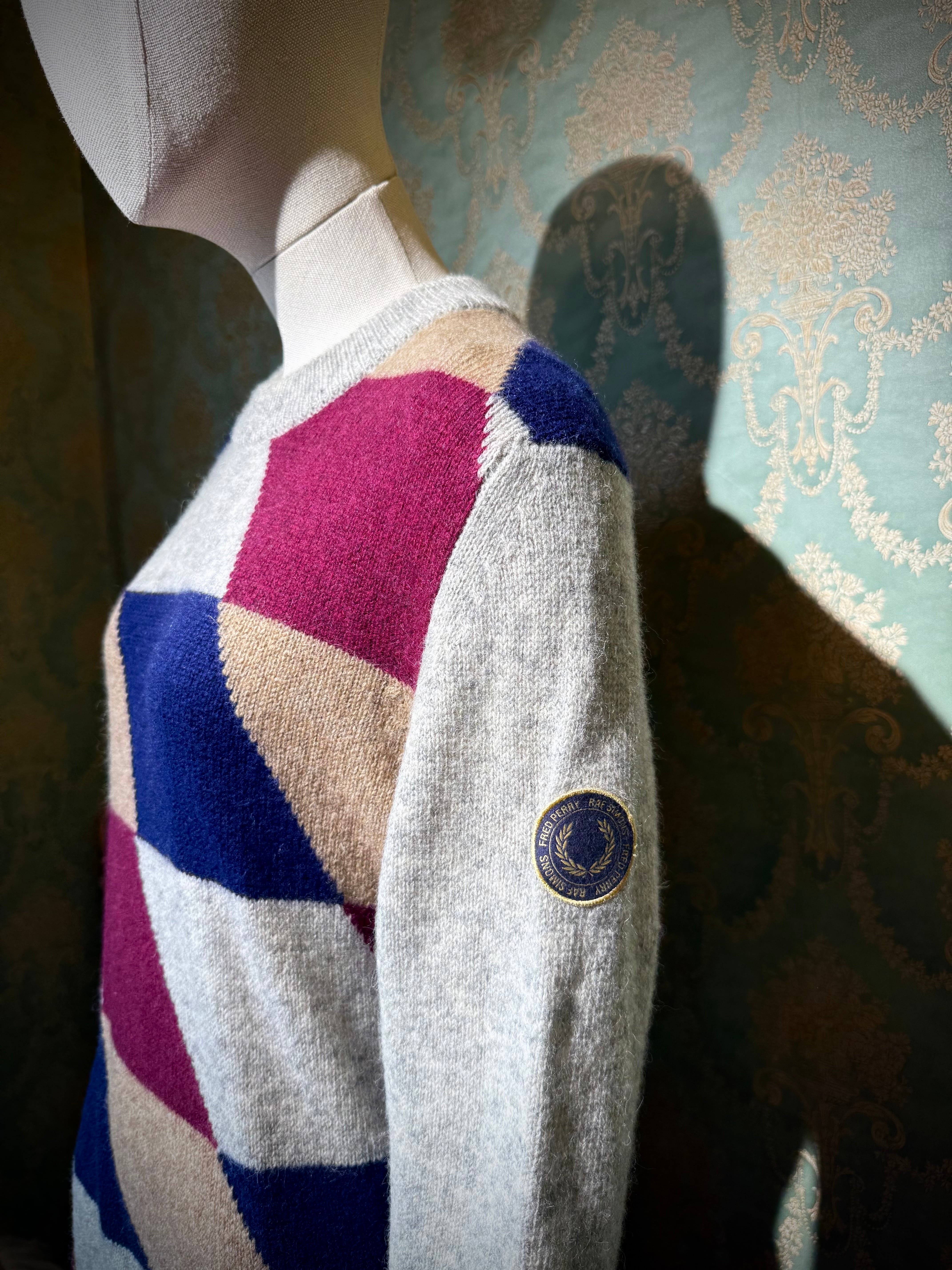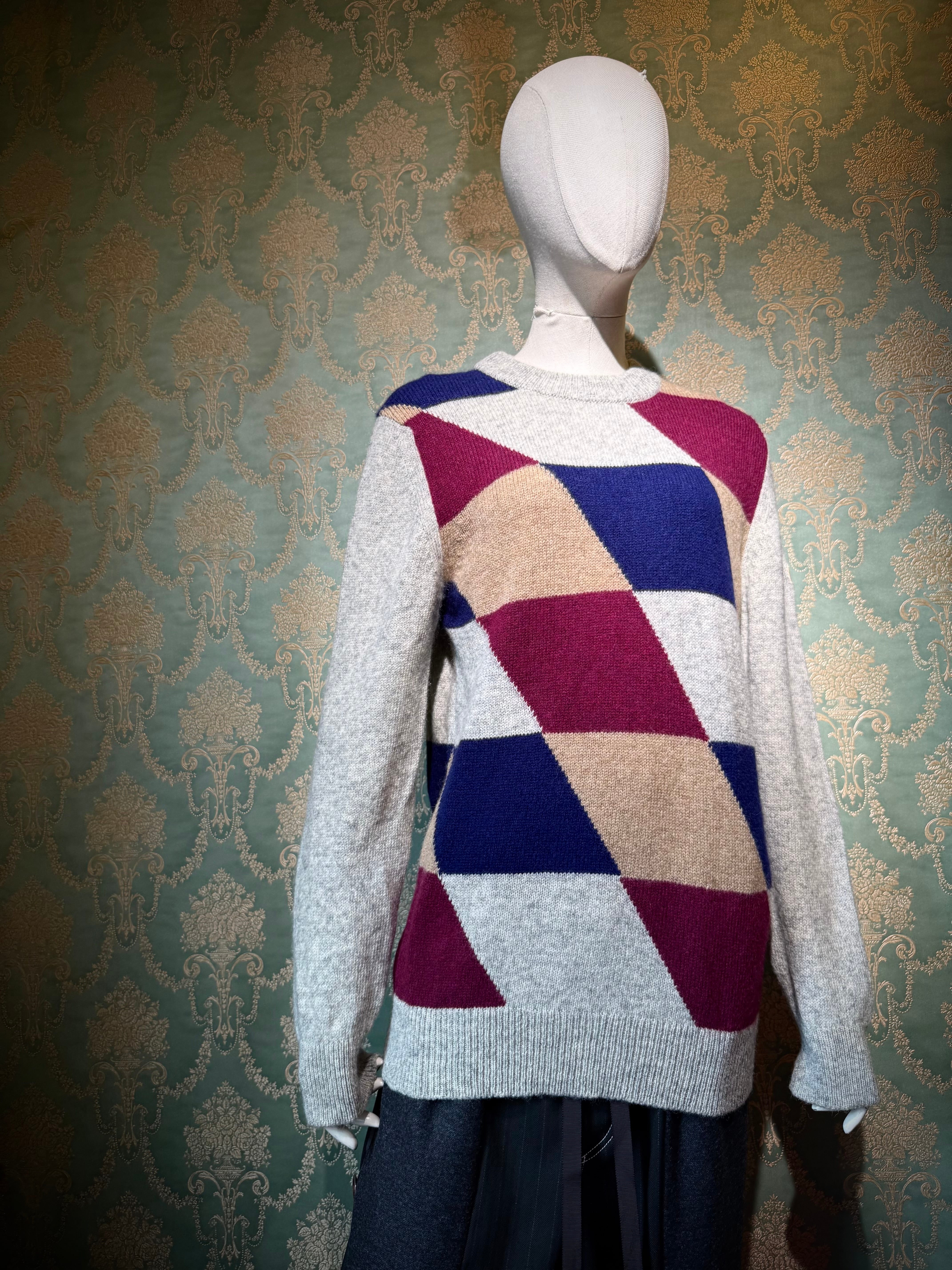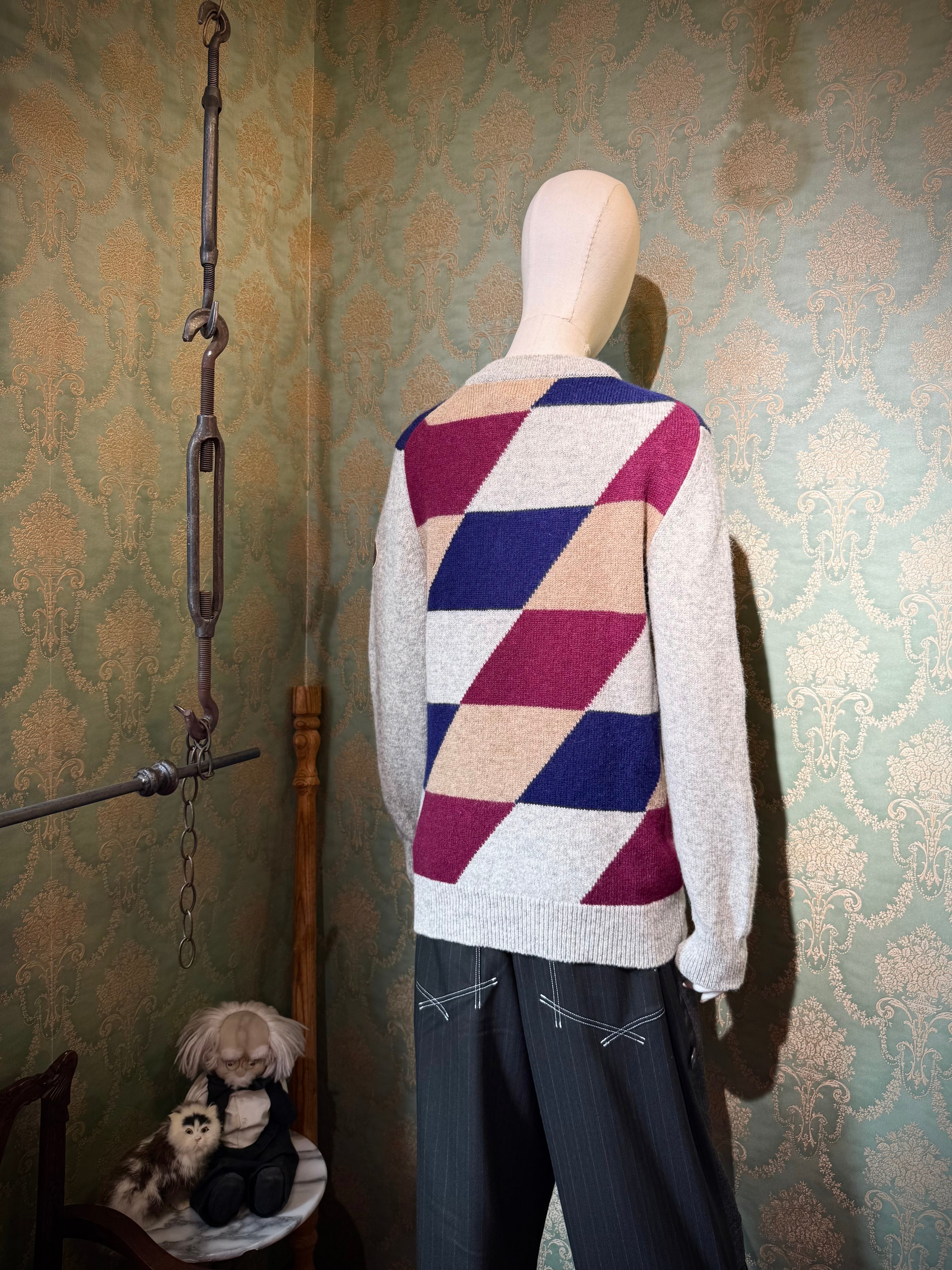 ライトグレーのボディをベースに、バーガンディ・ネイビー・ベージュを組み合わせた大胆なアーガイル調のジオメトリックパターンを配置。