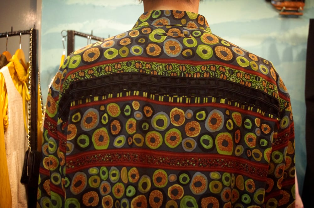 少し毒々しいくらいの油彩画チックなこっくりとした怪しげな無数のサークル模様×ポケット部分と背面の肩線に付いた漆黒のドレッシーなアイレットレースが、ダークなコントラストを生み出します。