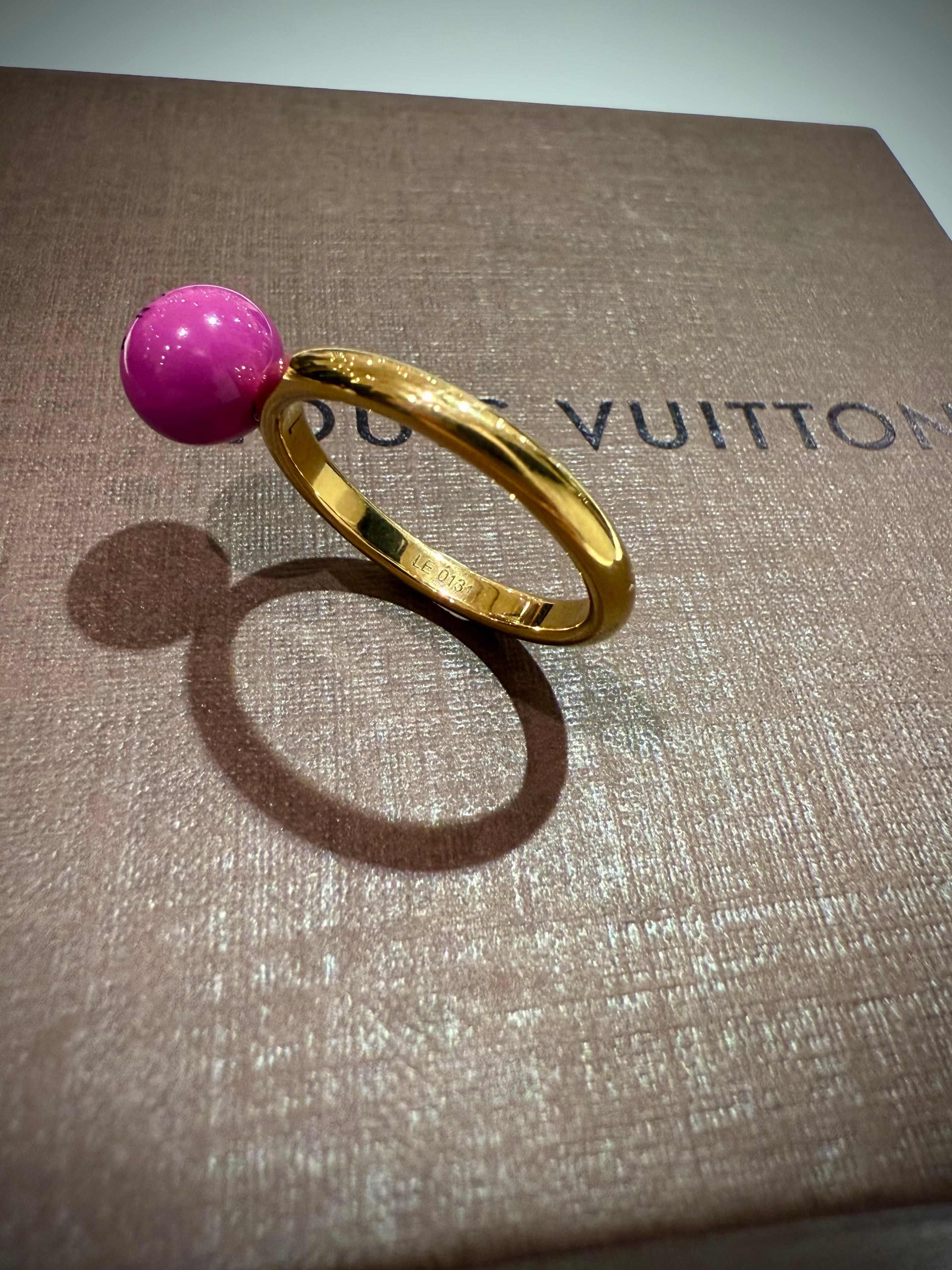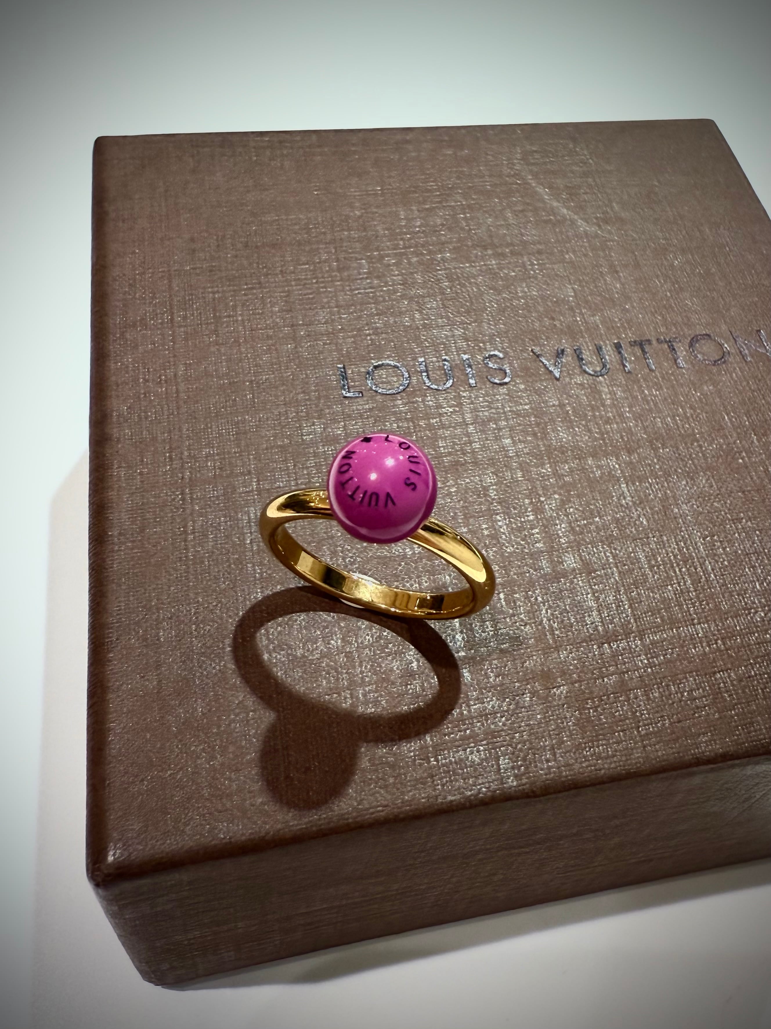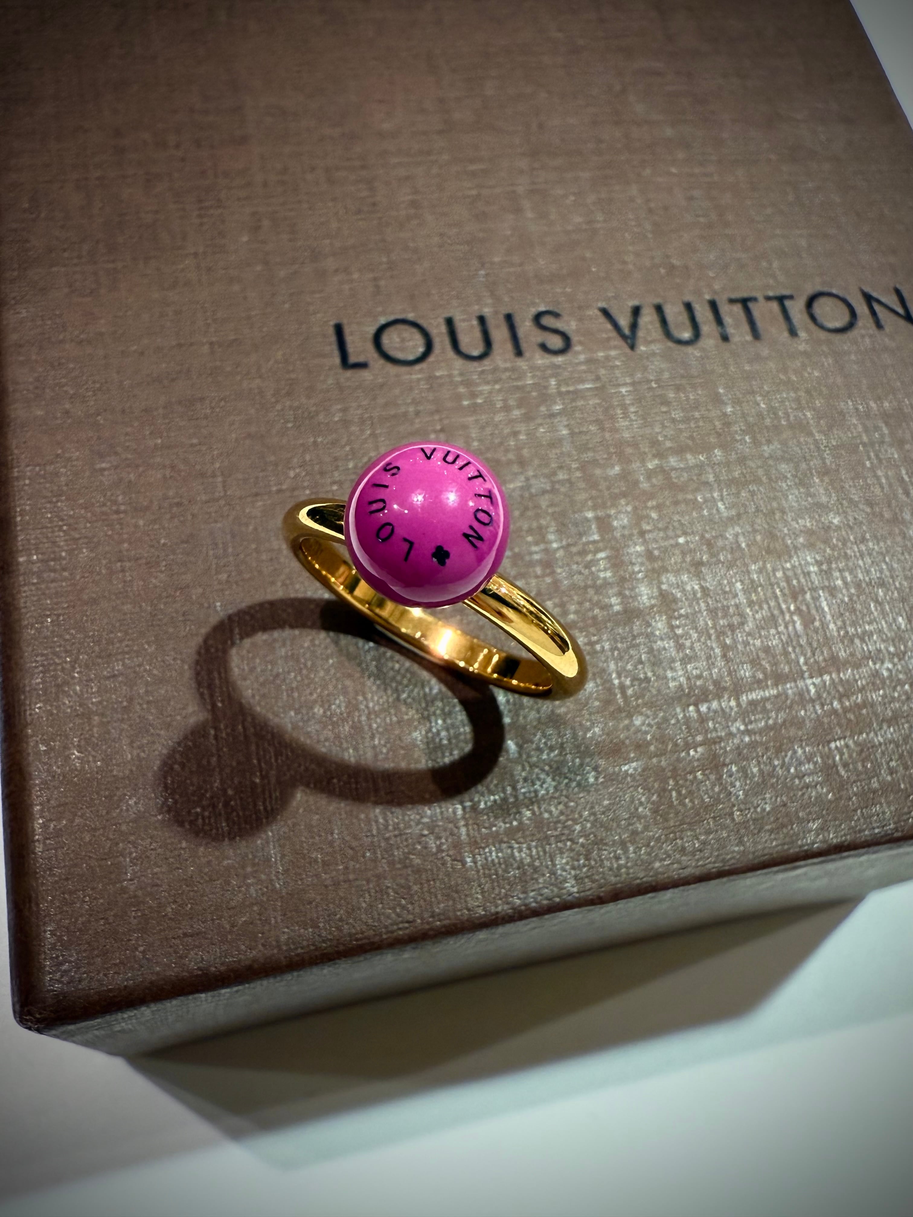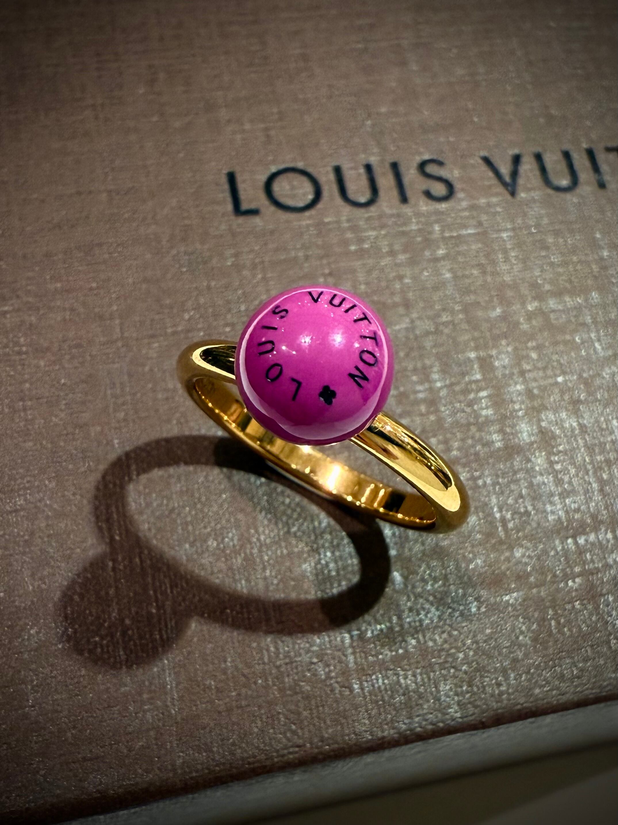 LVロゴを刻印したピンクレジンボールのリングは、ポップな表情の中にメゾンらしい品格を感じさせるデザイン。