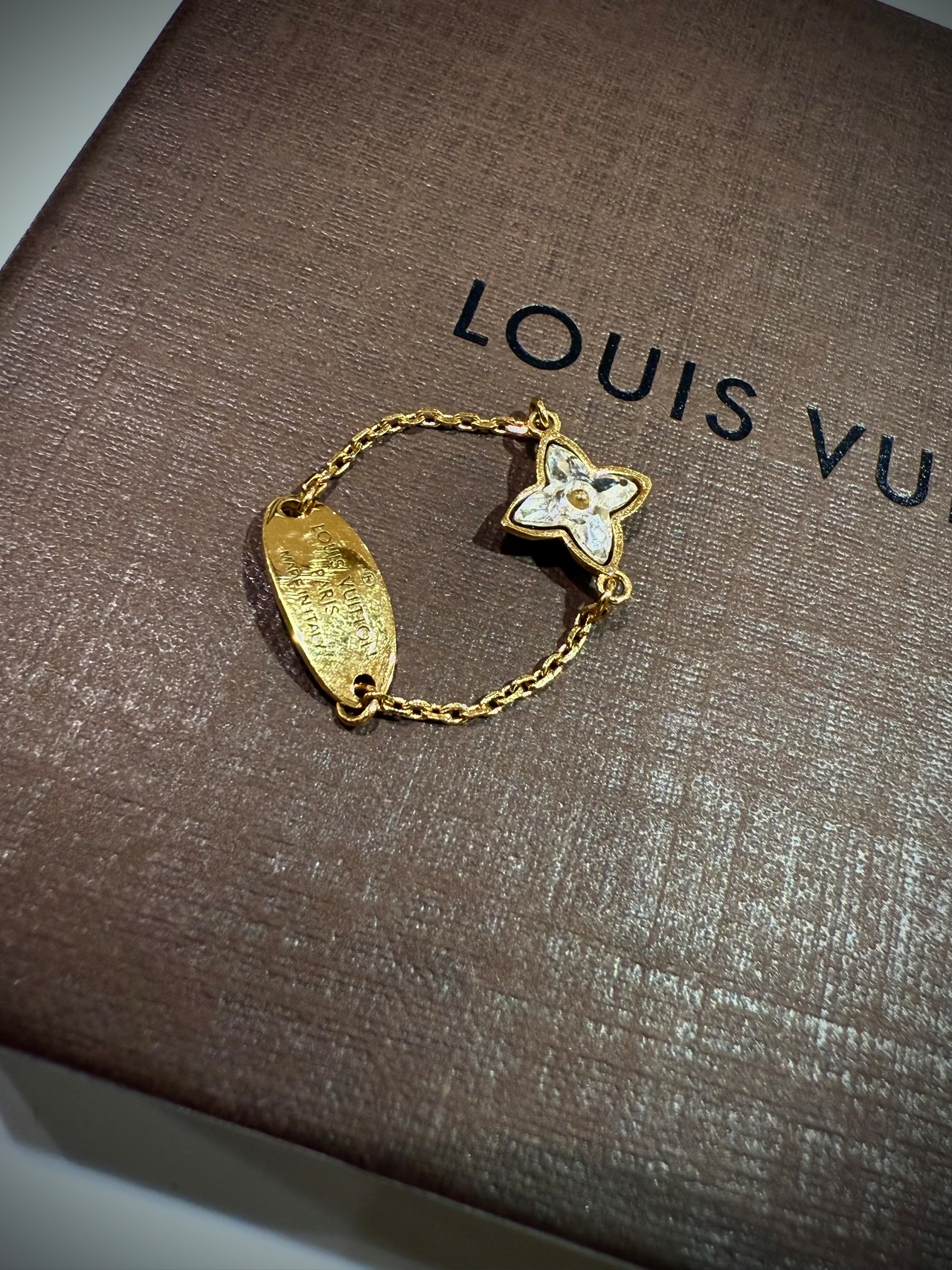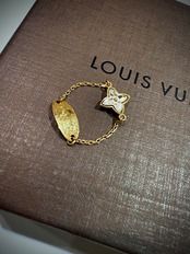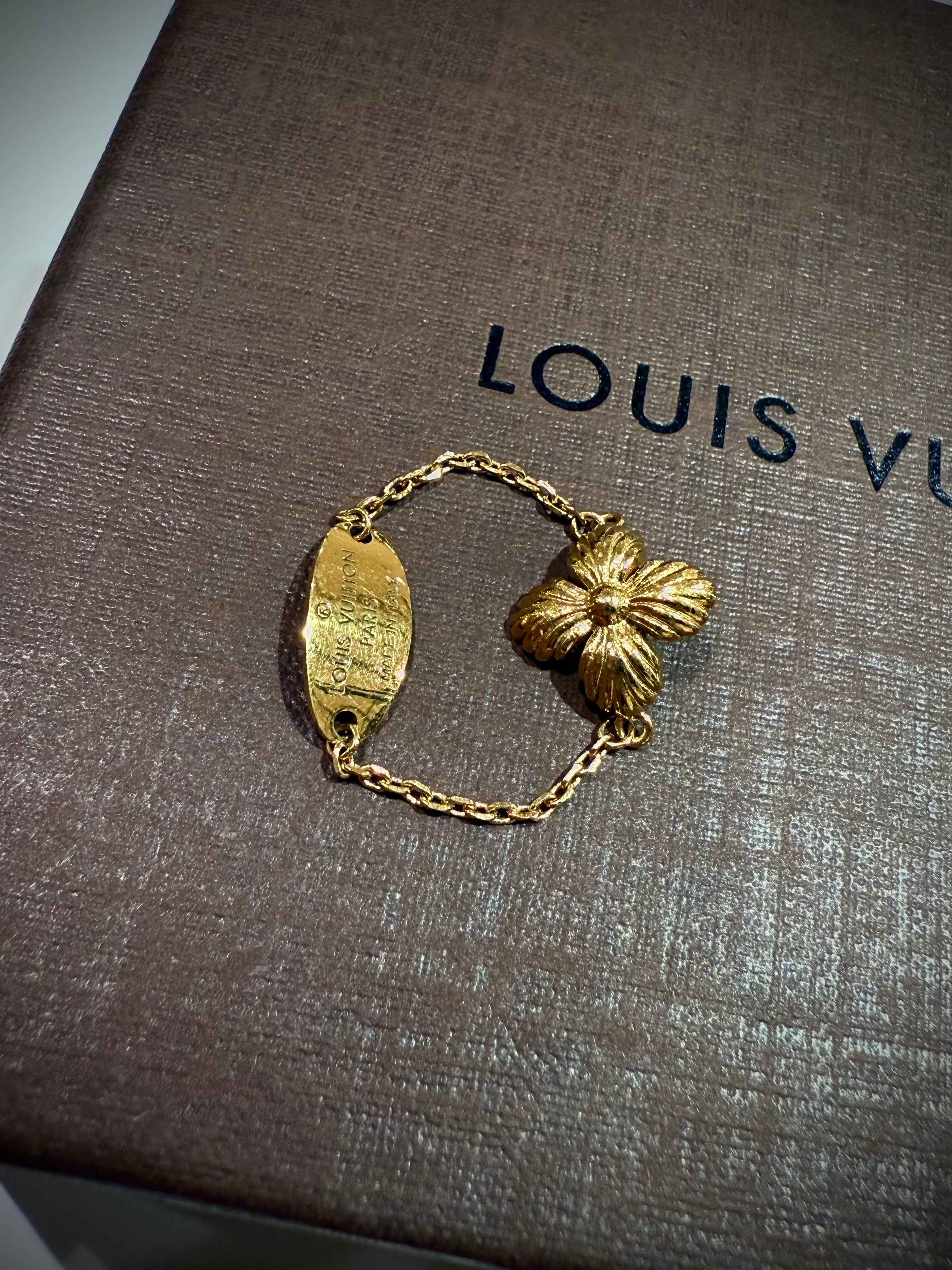 繊細なチェーンで指に沿うようにデザインされ、片側にはLVの刻印プレート、もう片側にはフラワーモチーフを配したアシンメトリーな構成。