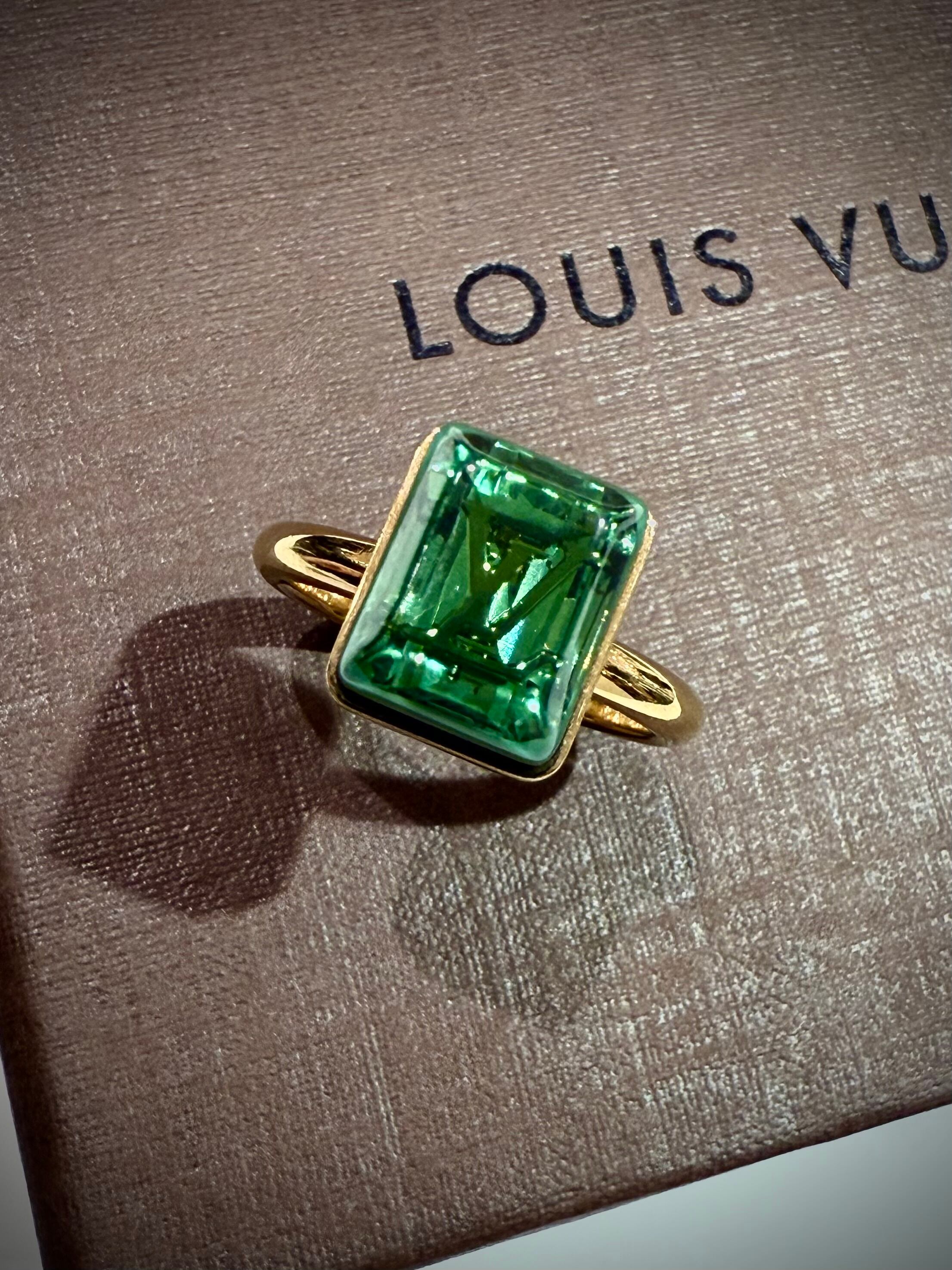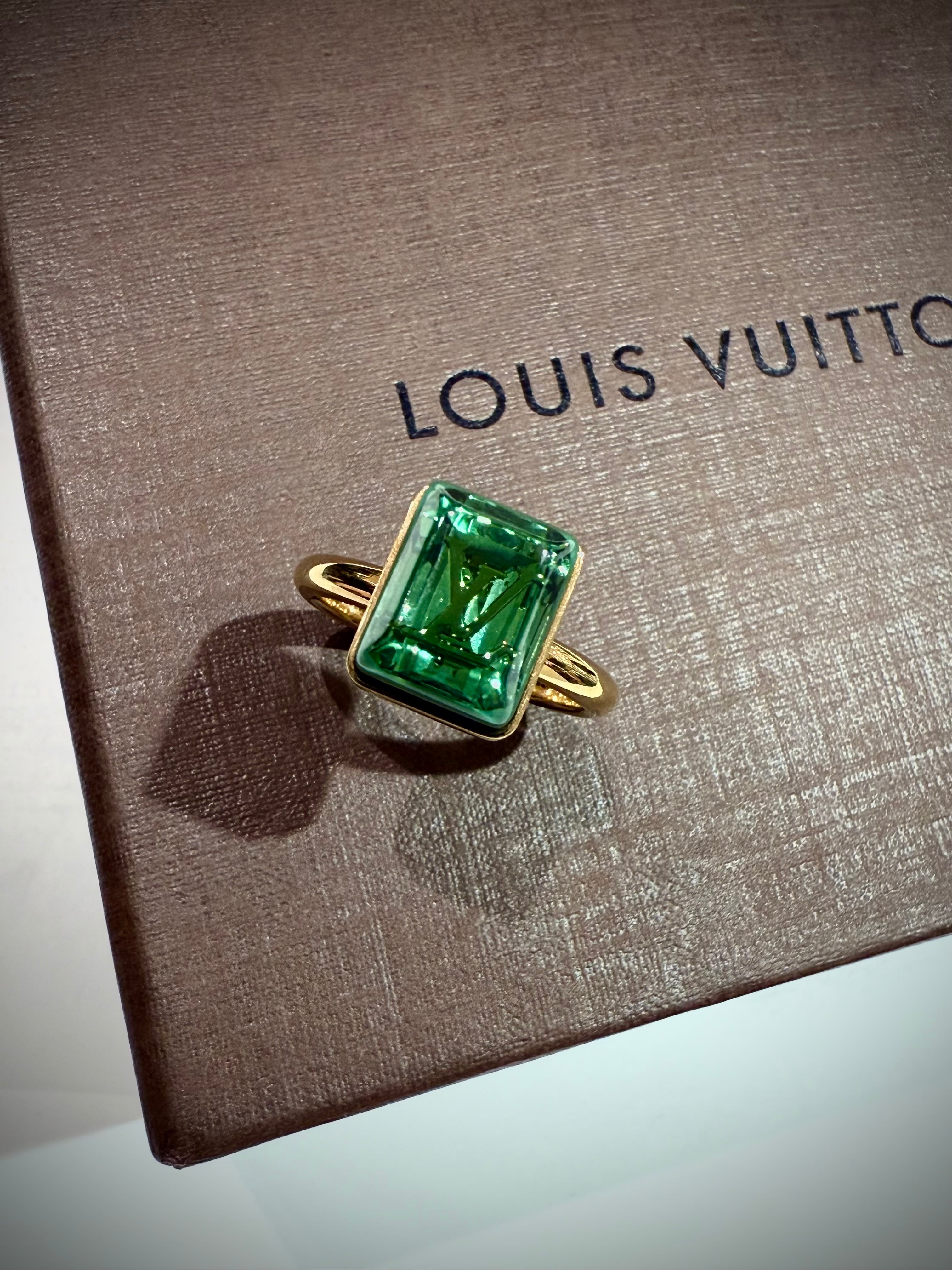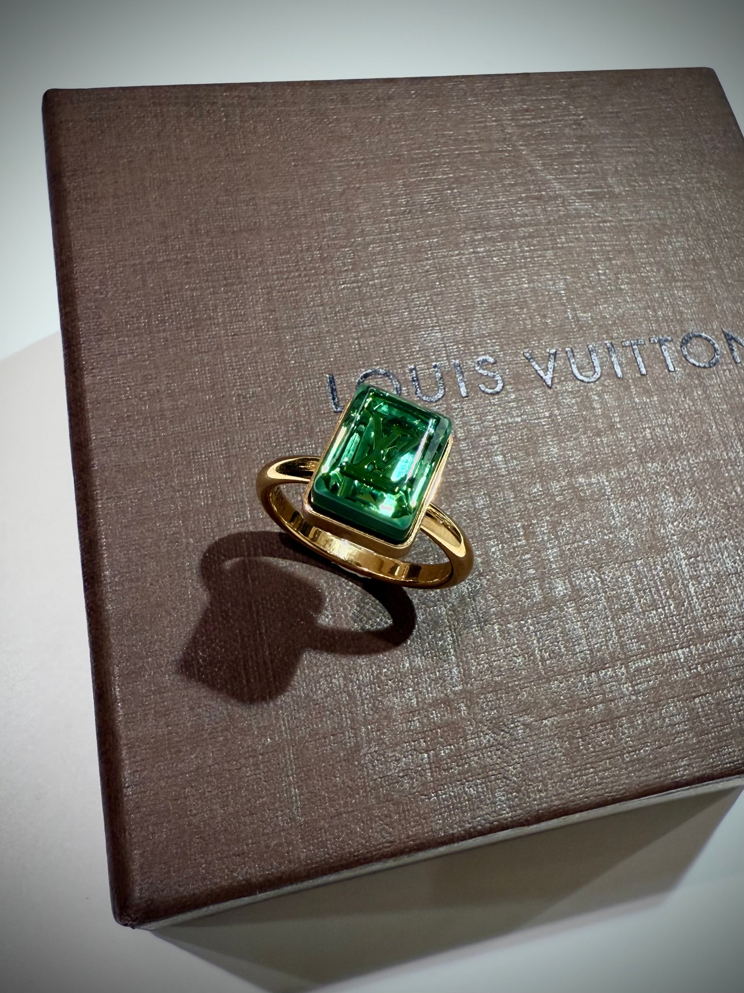 クリアレジンで作られたモノグラムフラワーの中心にLVロゴを配したデザインは、レジン越しに覗くロゴの表情が、メゾンならではの繊細な職人技を感じさせます。