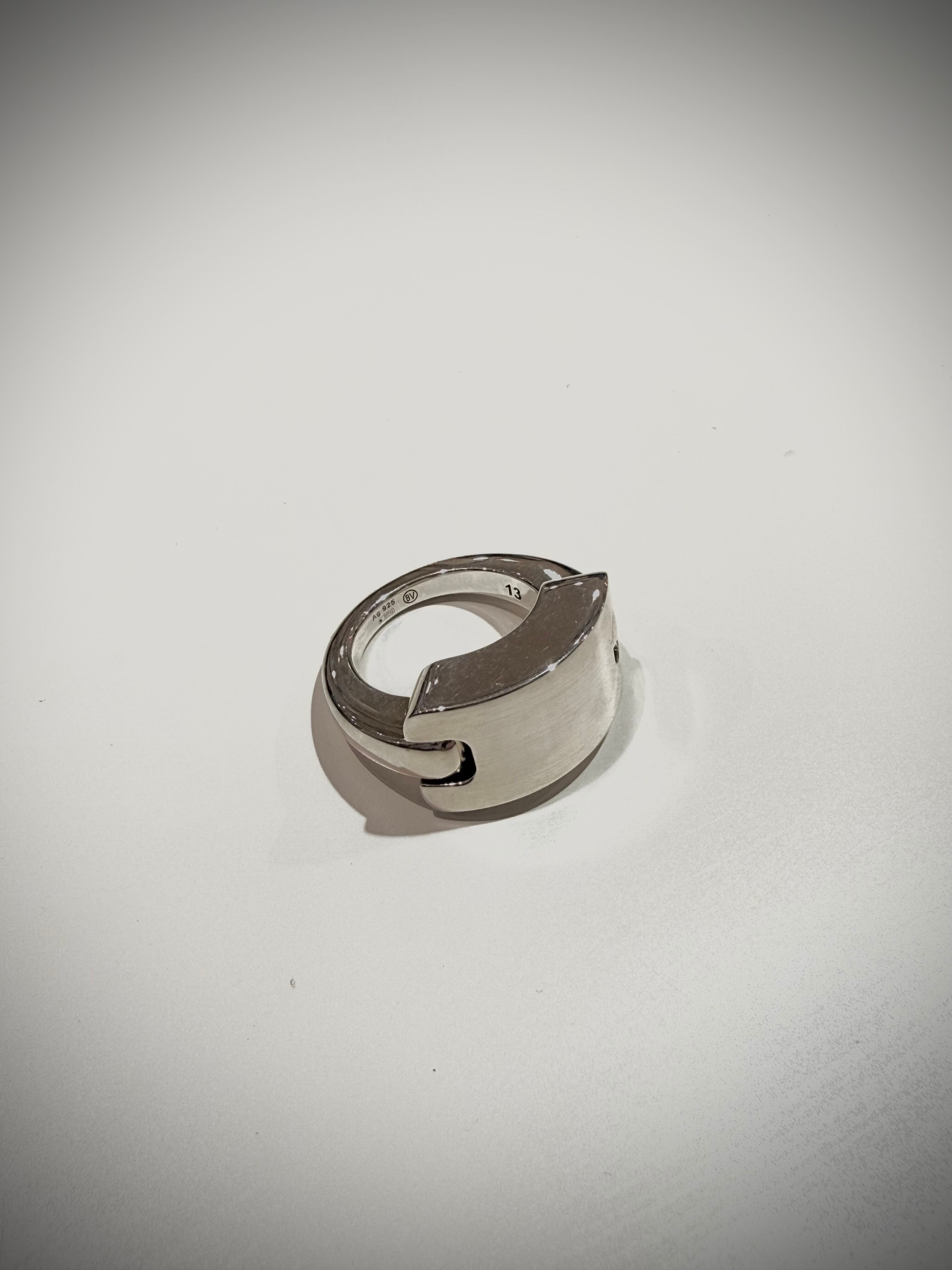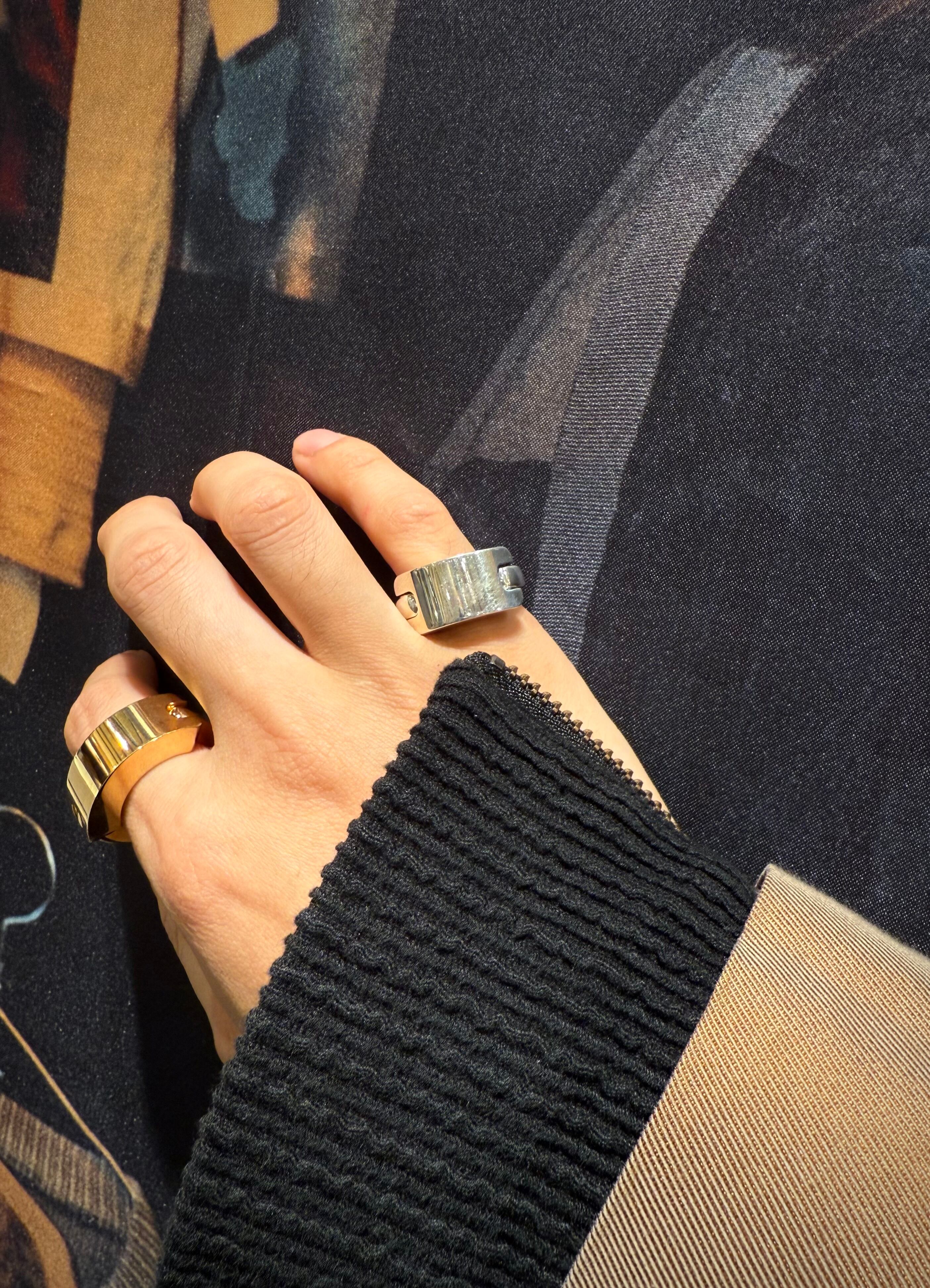 ボッテガ・ヴェネタらしい、無駄を削ぎ落としたミニマルな造形美が際立つリング。