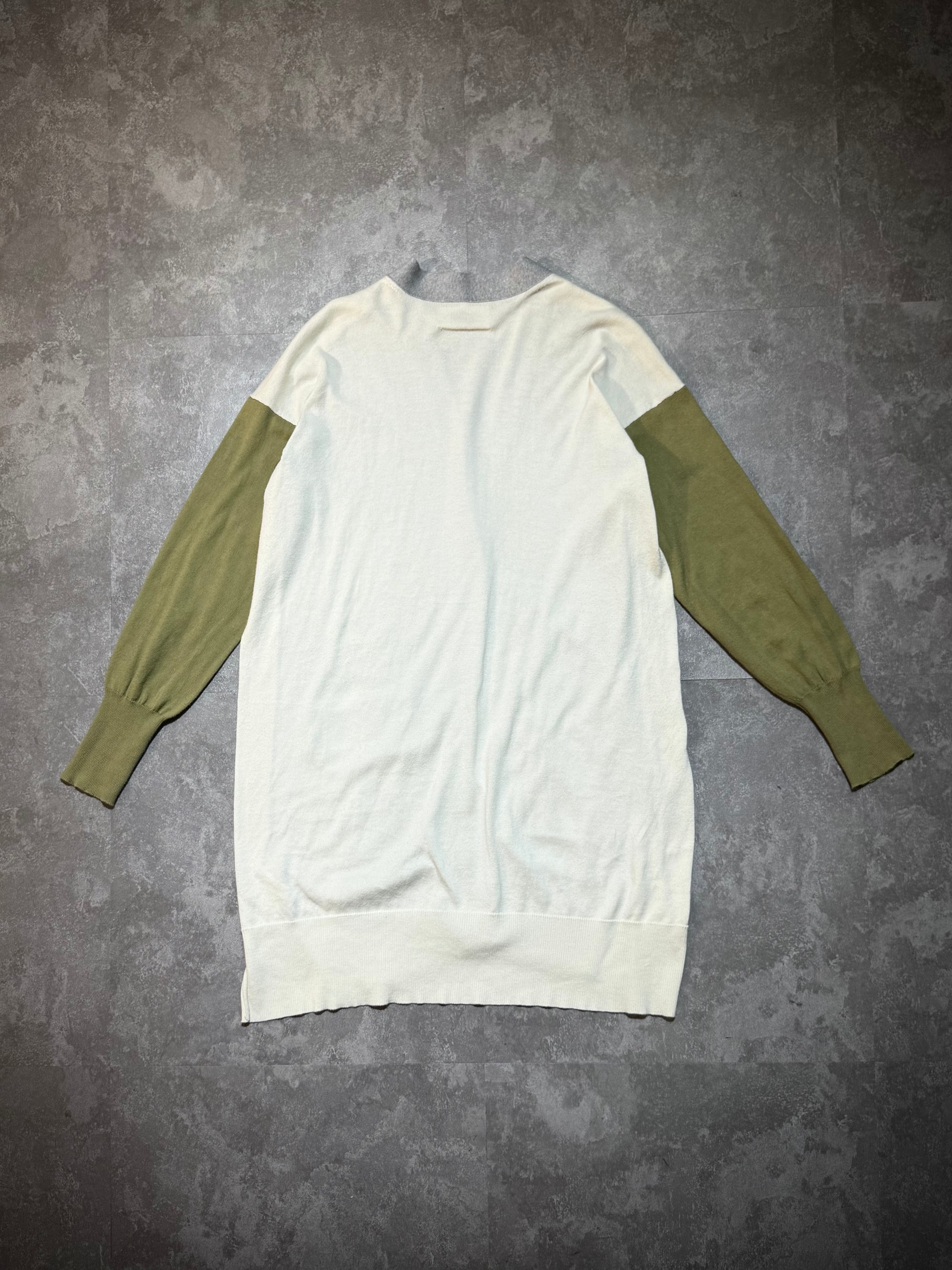 グレー、アイボリー、カーキグリーンという柔らかな中間色を大胆に切り替えたカラーブロッキングは、ミニマルでありながらどこか実験的。