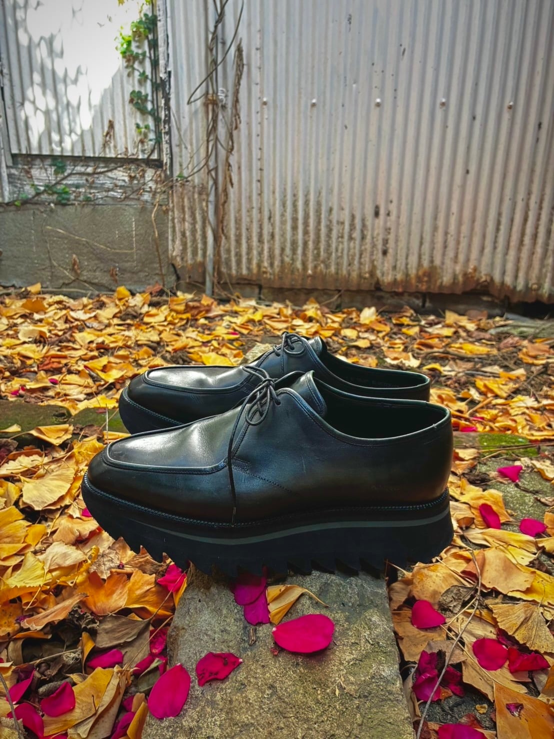 クラシックなダービー型をベースにしながら、ボリュームのあるチャンキーラバーソールを組み合わせることで、現代的なバランスを完成させたデザイン。