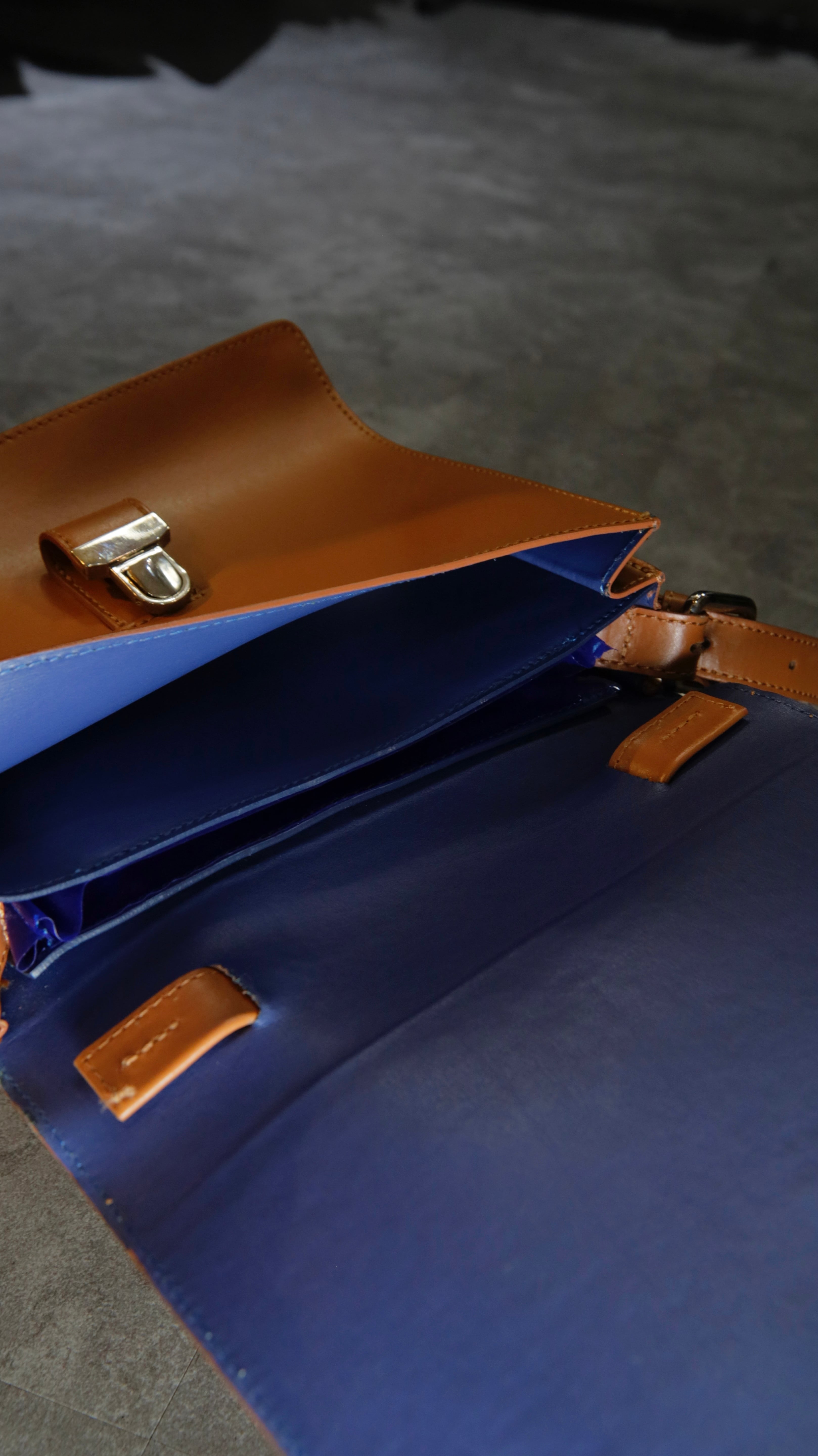 メインポケットは2つ。裏地はネイビーで統一されており、ポケットの1つはビニール素材とマルジェラらしい捻りのあるディテールが魅力です。