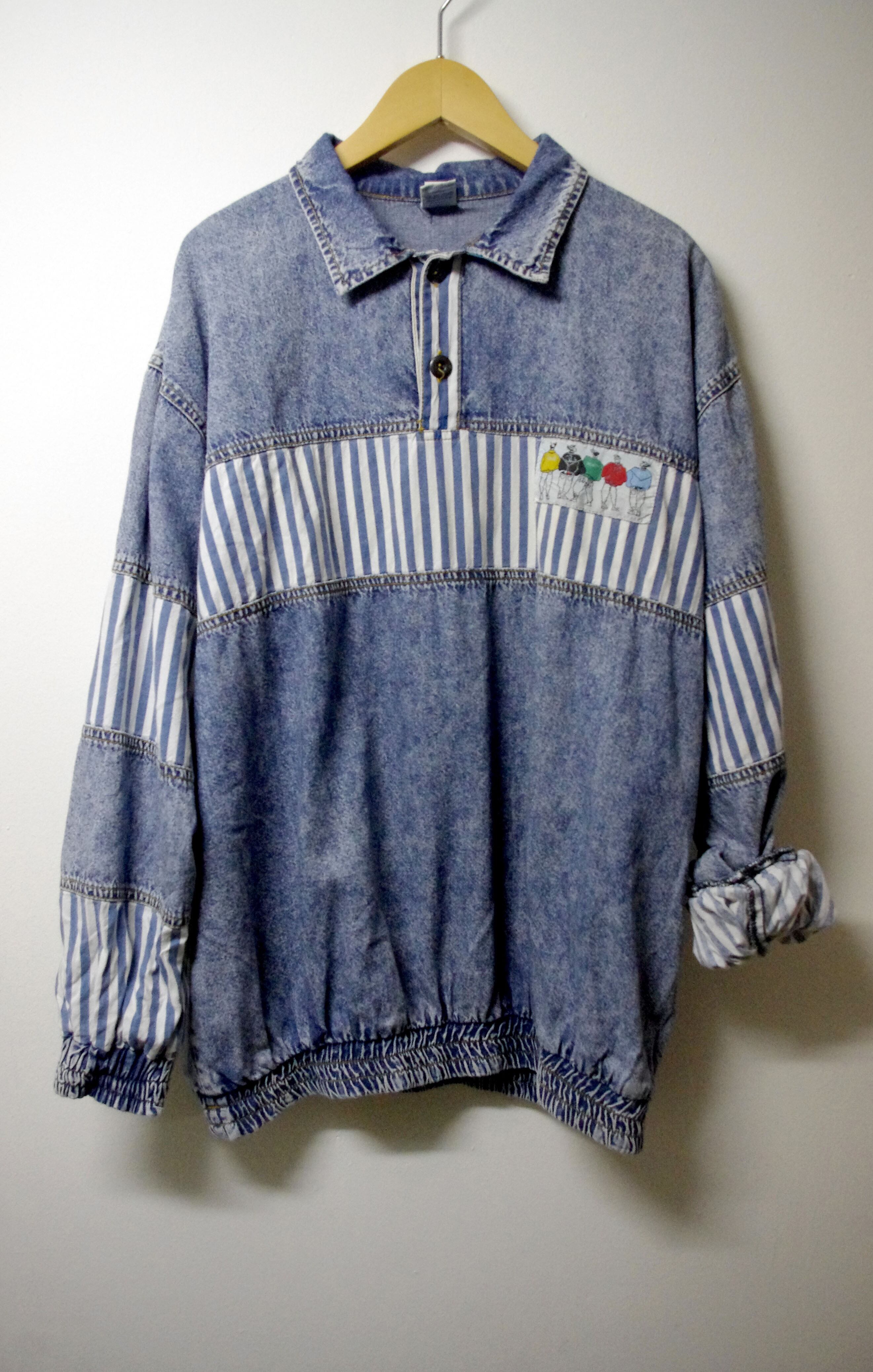 う80年代にストリートスポーツスタイルで大流行したケミカルウォッシュジーンズブルゾンです。 ストライプの切り替えと、胸元のモデルのロゴが効いた、ヴィンテージならではの逸品です。