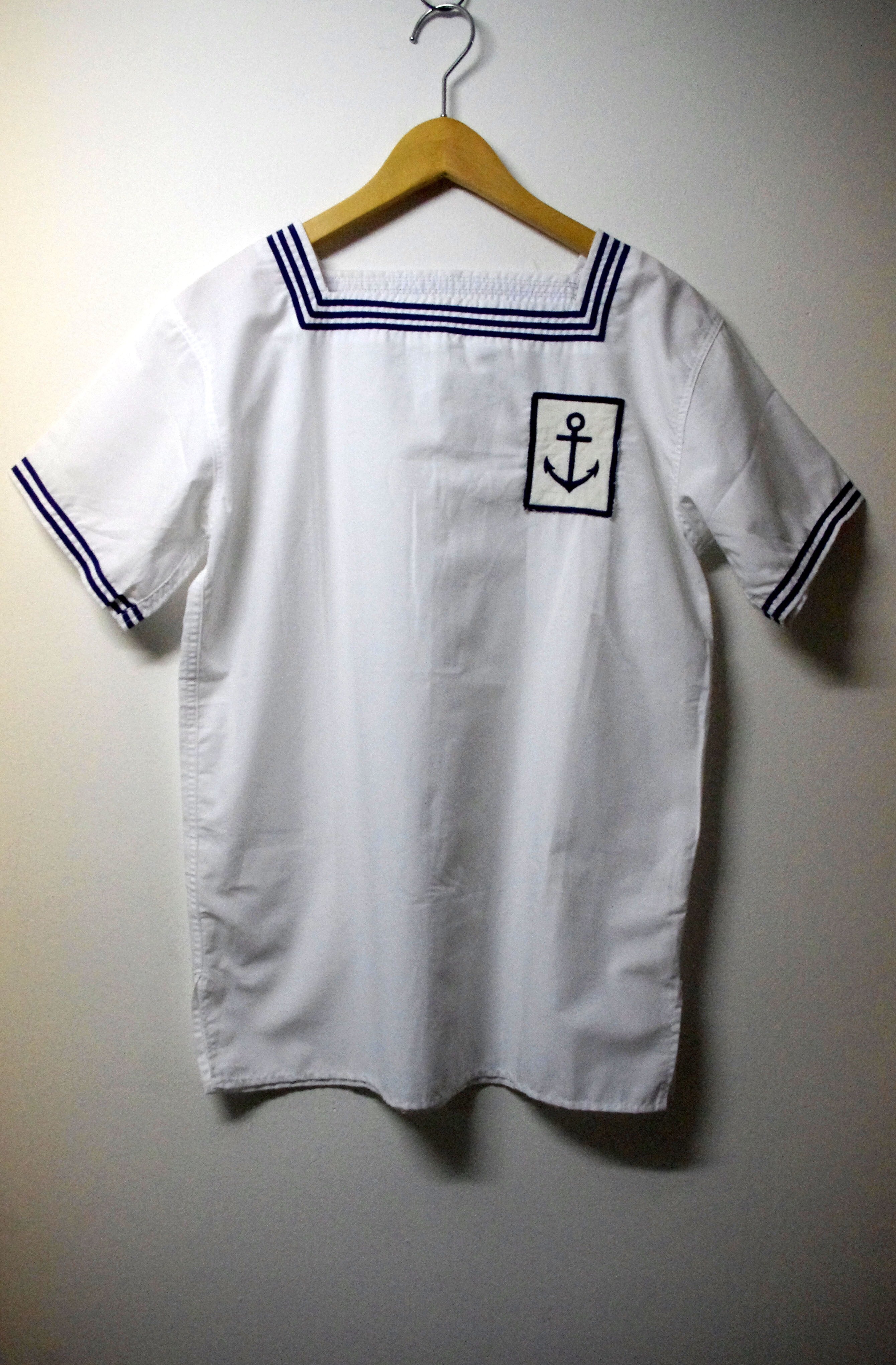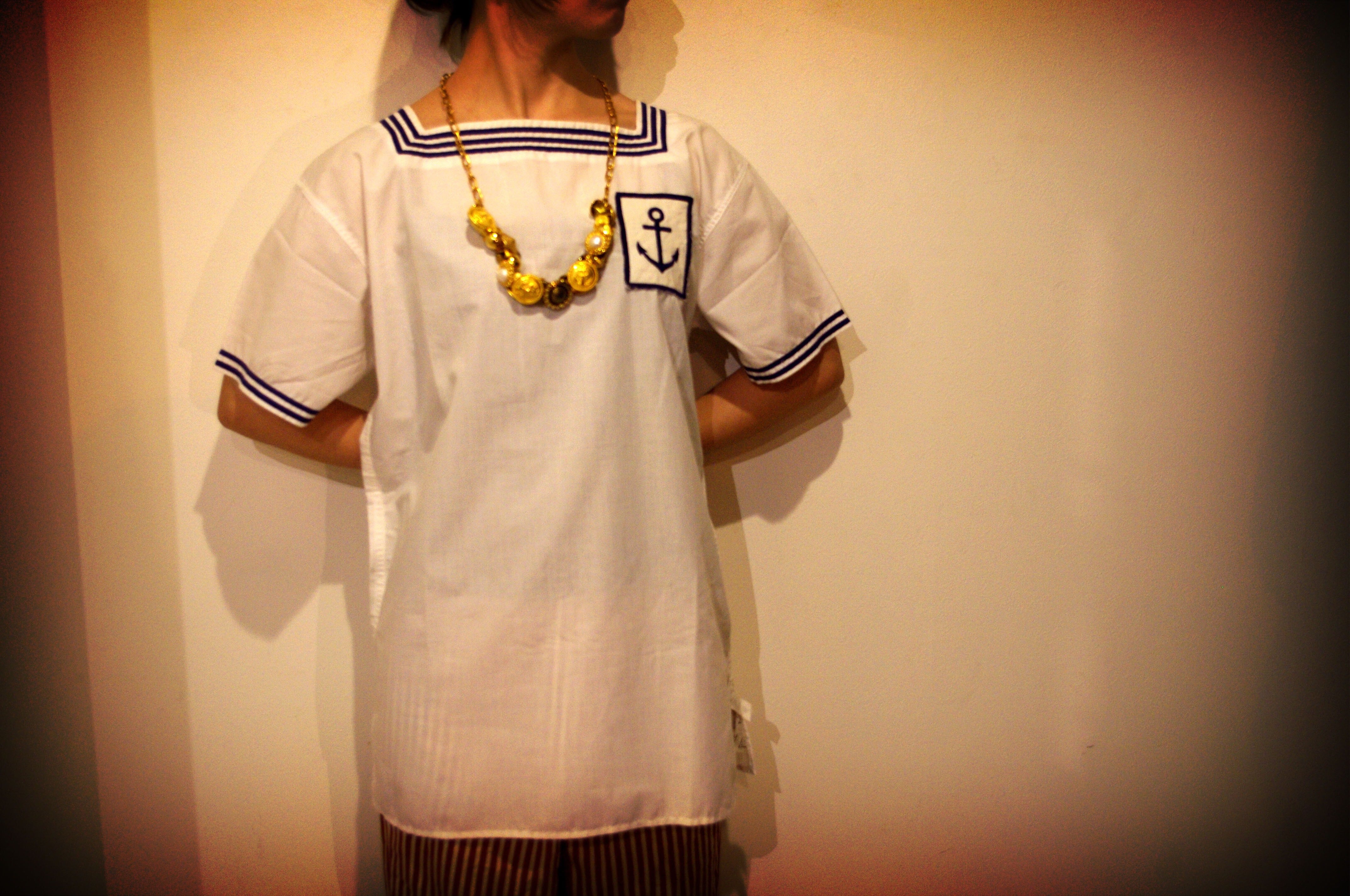 セーラーならではのスクエアネック、胸元に付けられたイカリモチーフ等、シンプルながらもデザイン性の効いた1枚です。