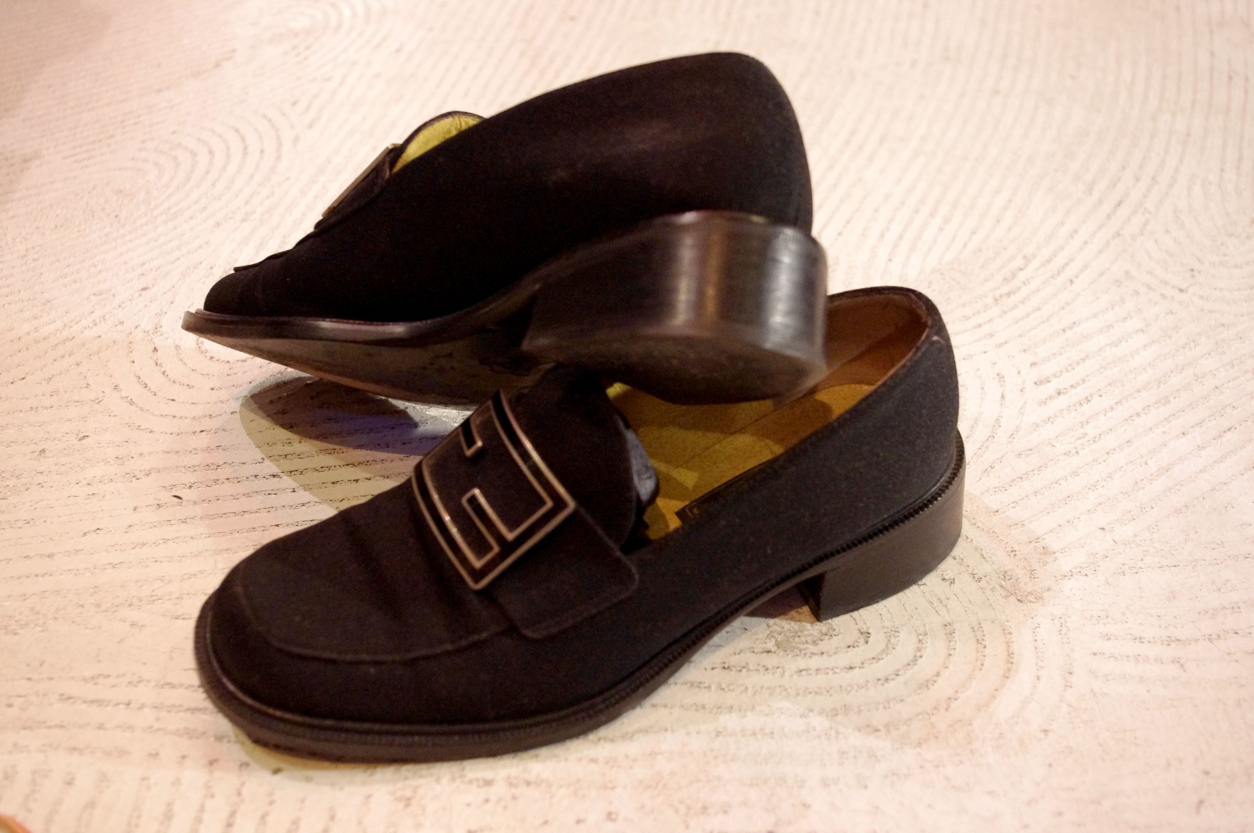 今はもうない大振りのフェンディのロゴをトップにあしらったドレスシューズです。ジャージー素材を使った面白い一足です。