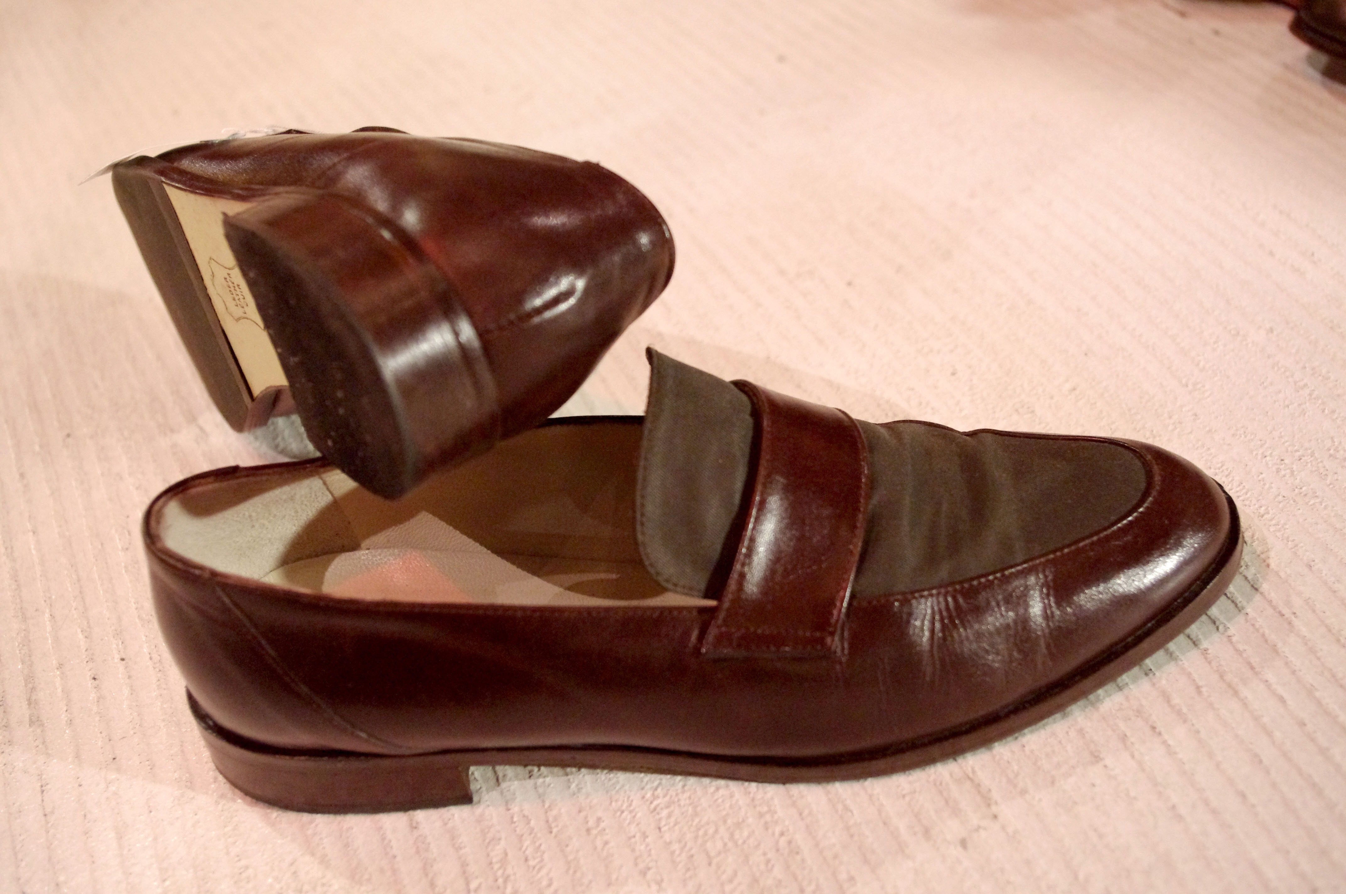 カーキ色のナイロンとブラウンのレザー素材を組み合わせたバイカラーシューズです。