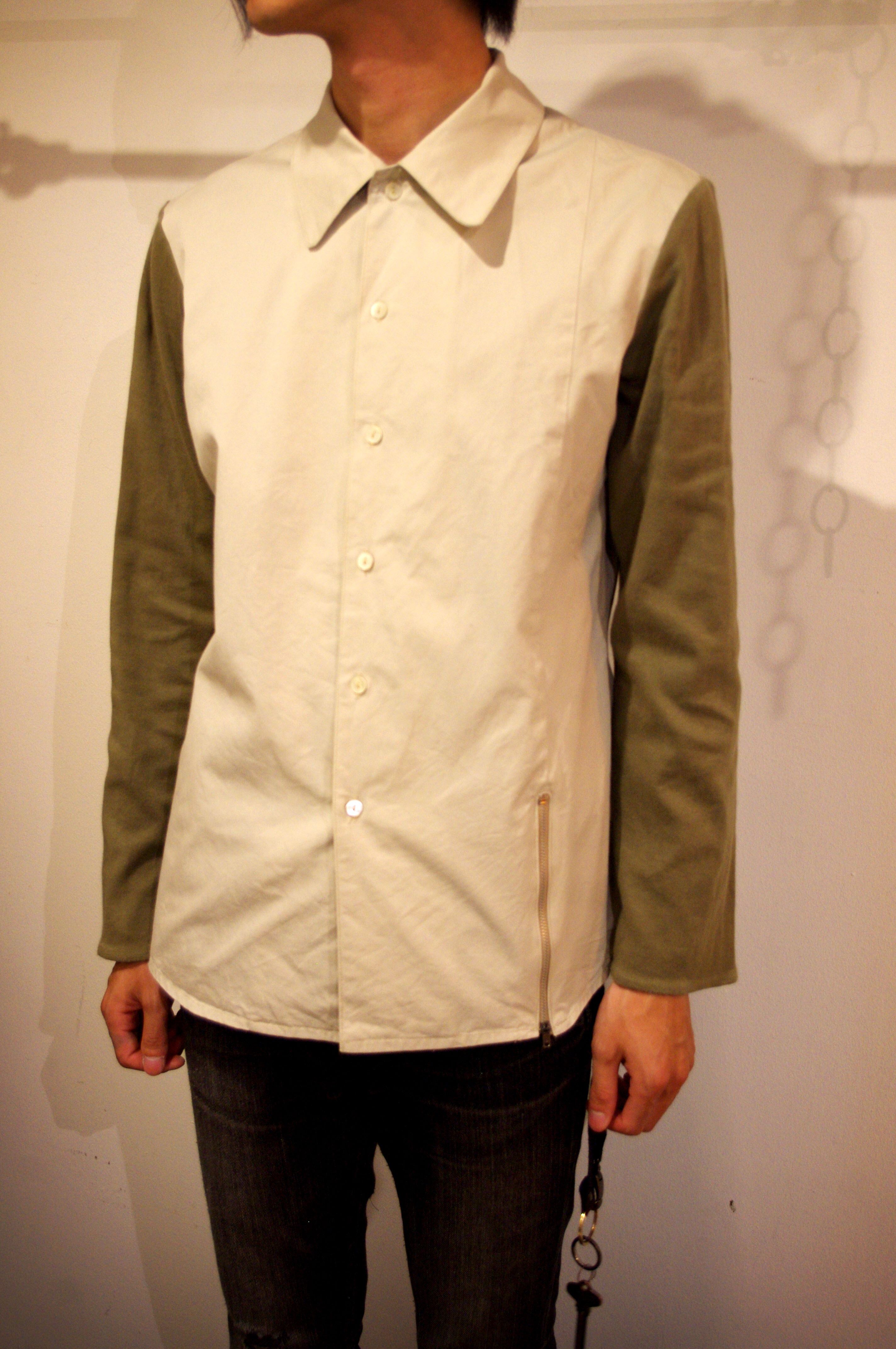 バイカラーが目をひくハリのあるコットン地×袖がジャージー素材という珍しい組み合わせ。