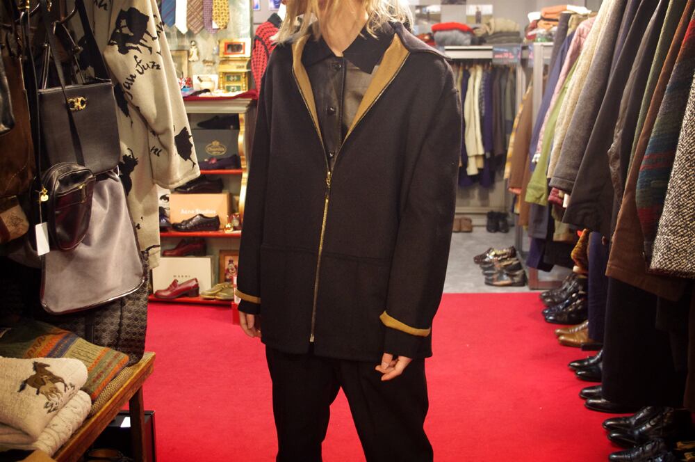 また、キャメルブラウンの面で着るとフェミニンでクラシカルな雰囲気ですが、ポケット部分に斜めにファスナーがついていたり、襟と袖から覗くブラックがクールなエッジの効いた一品です。