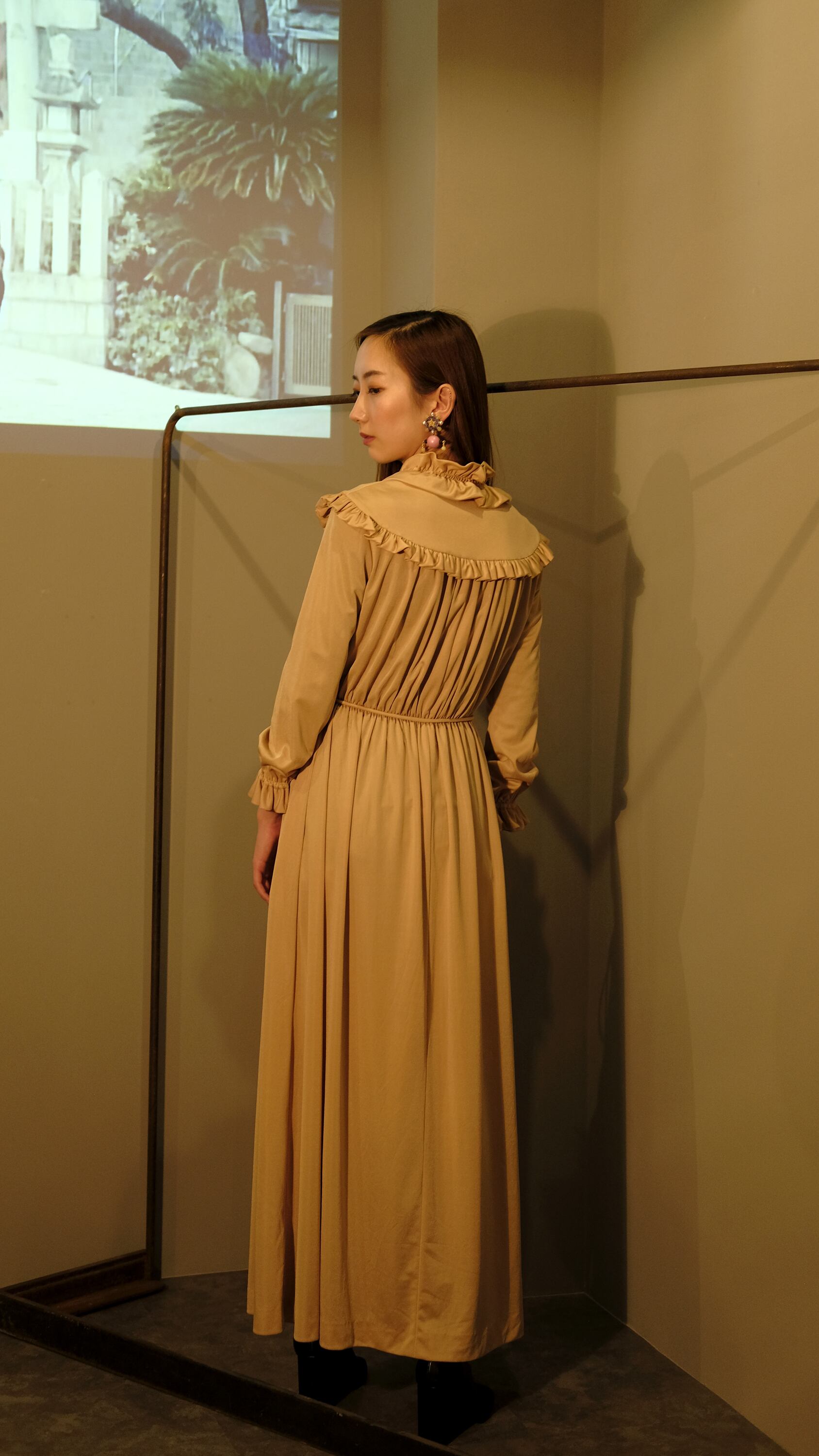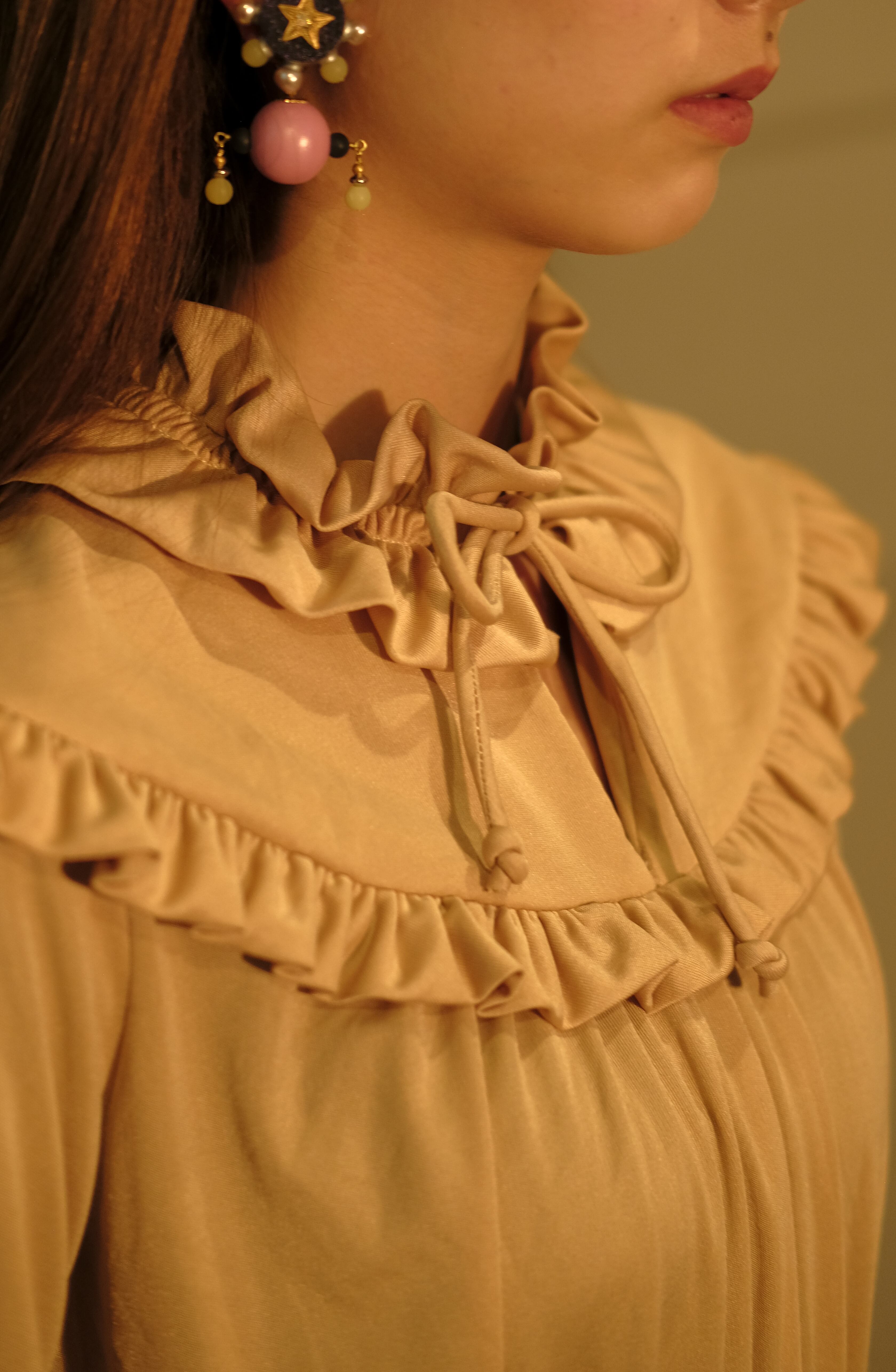 首元から胸元までの贅沢なフリル使い、くるぶしまでマキシ丈のフレアスカートがまるでネグリジェのよう。首周りのギャザーの入り方が絶妙に計算されており、品良く華やかに魅せてくれます。