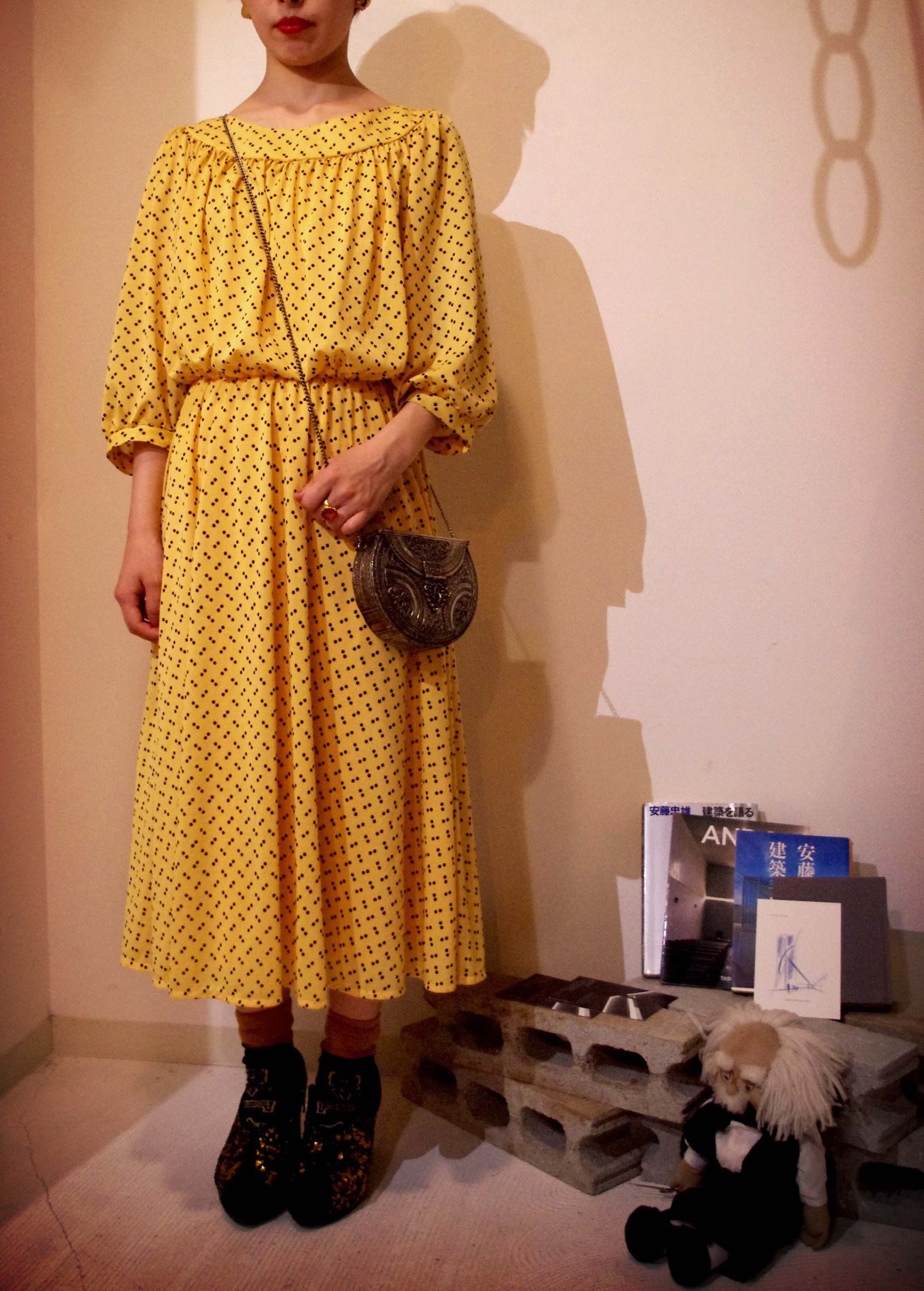 色使いとシルエットが古着ならではのキュートなワンピース。一枚で魅せる事ができ、ウエストにゴムがついているので小柄な方にもオススメのお品。