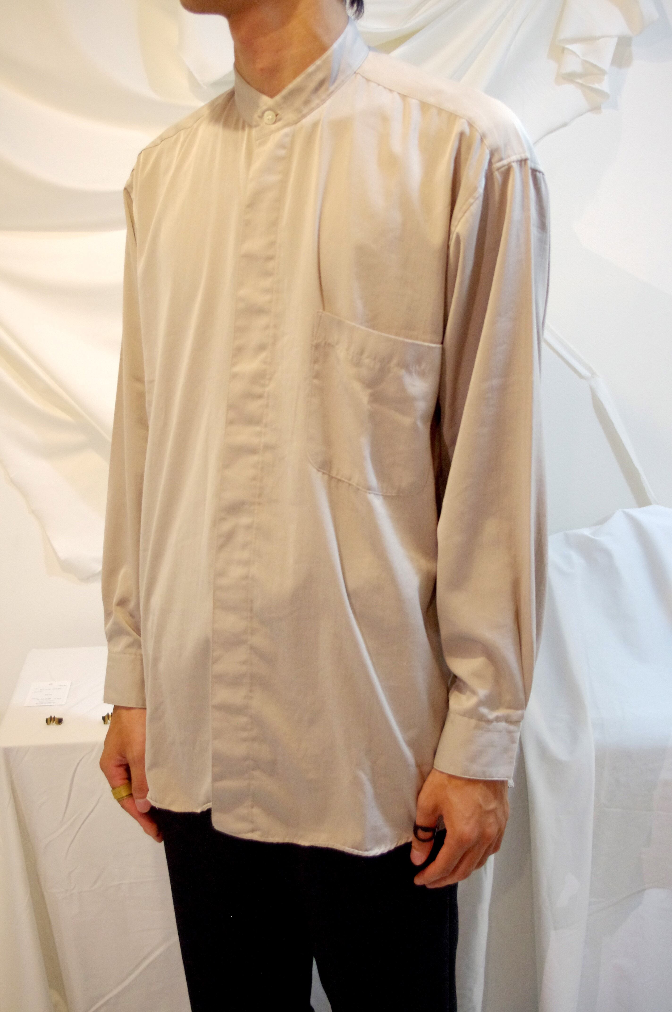 シンプルなポリエステルシャツ。シルクに似た光沢が有りドレープ感ある風合い。