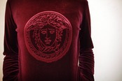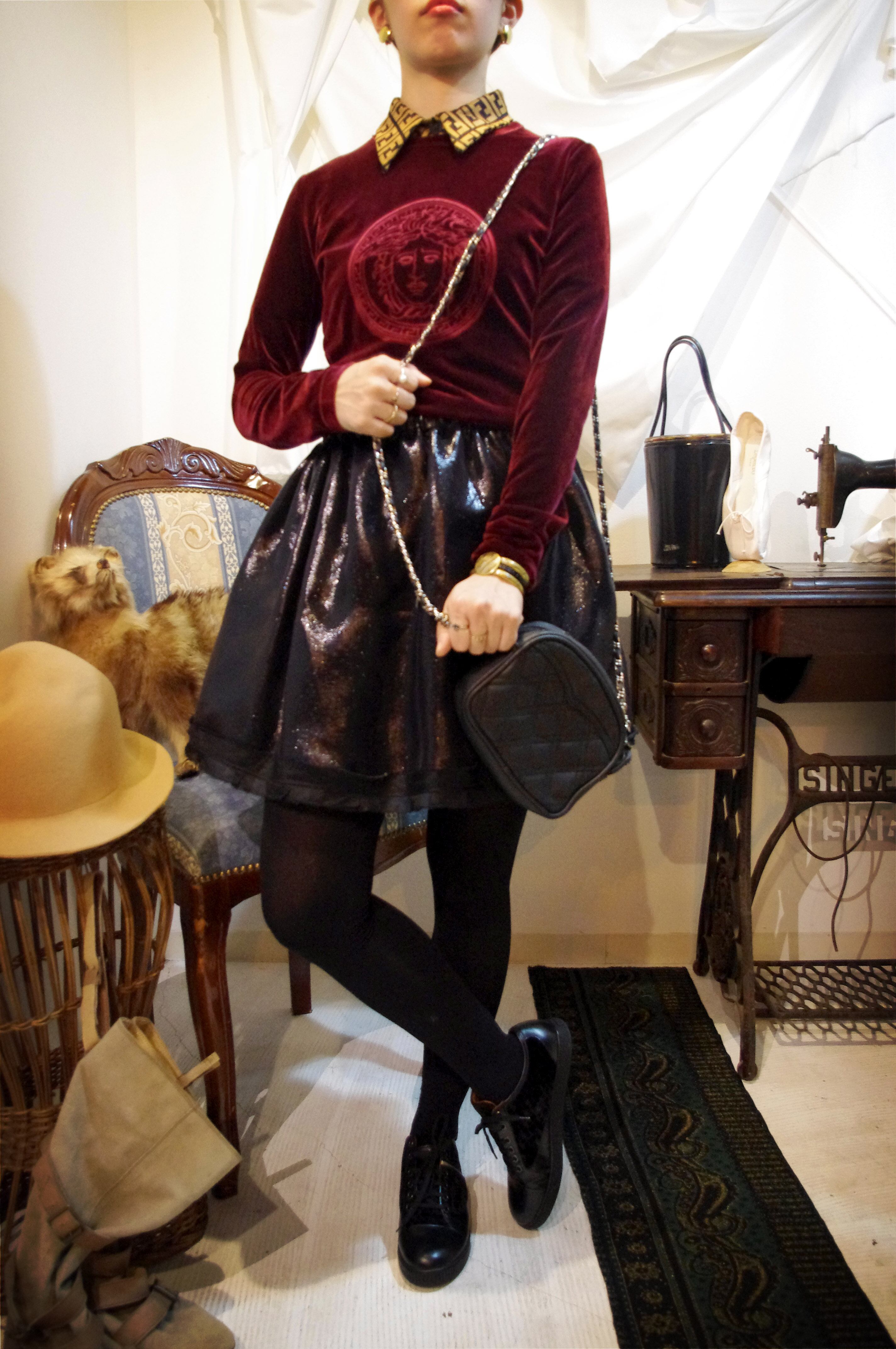 ノーブルなヴァーガンディ色のベルベット、メデューサの大きいロゴが目を惹くこちらはVERSACEのもの。当時よく、VERSACEではこのベルベットを用いたアイテムが多く出ており、この色味、着心地は右に出るものはいないと言える程に素晴らしい絶妙な好バランス。どこかセンシュアリティでタイムレスに使えるお品。